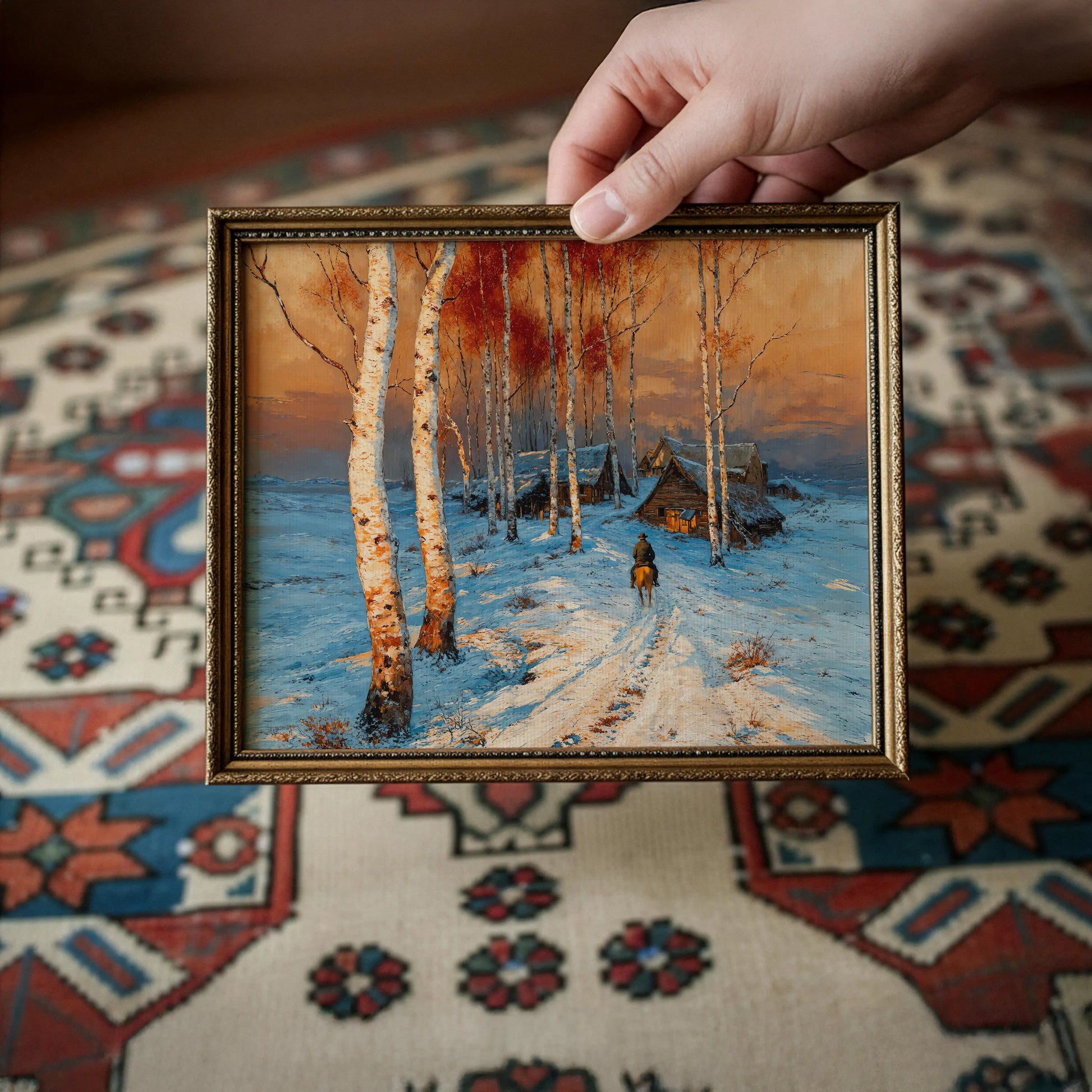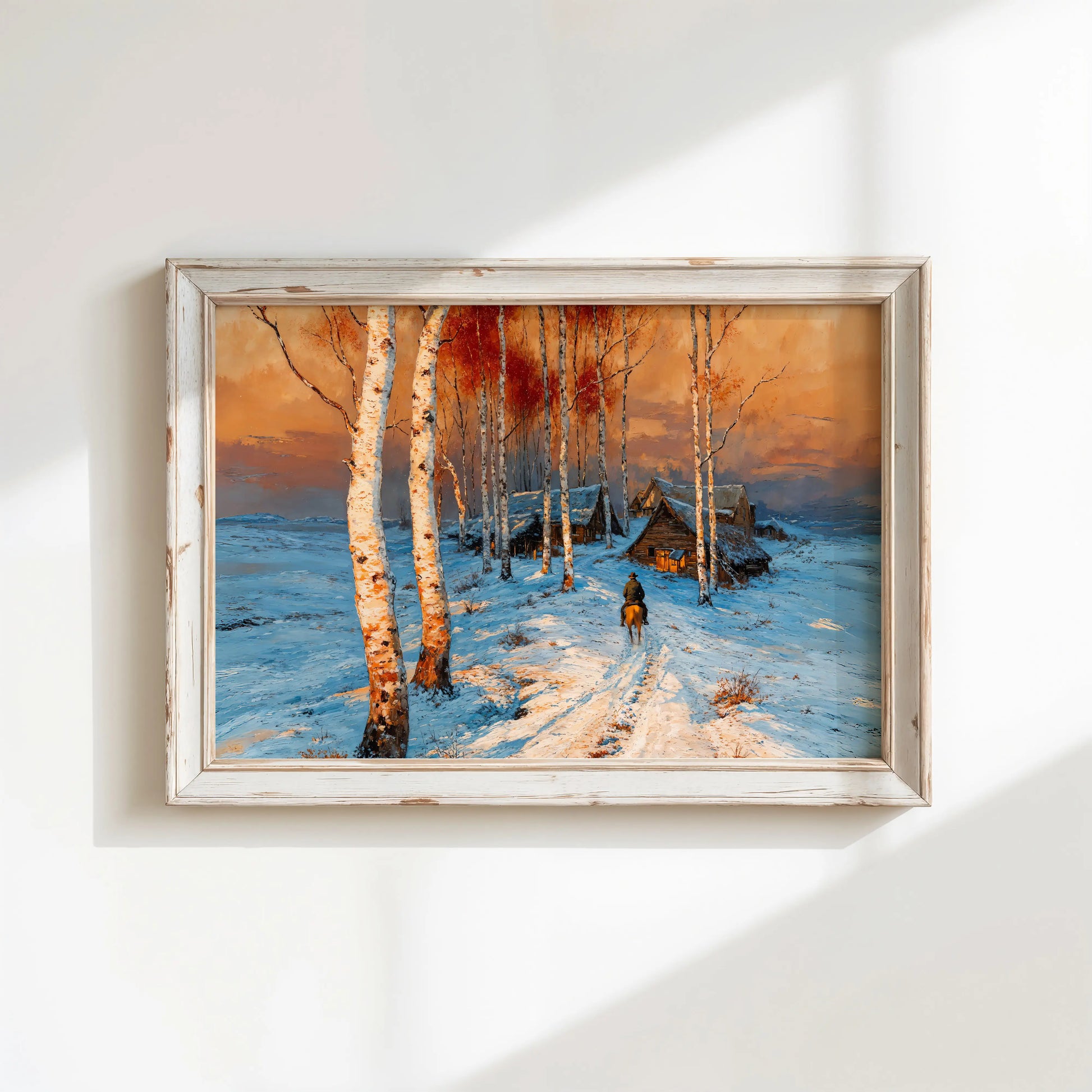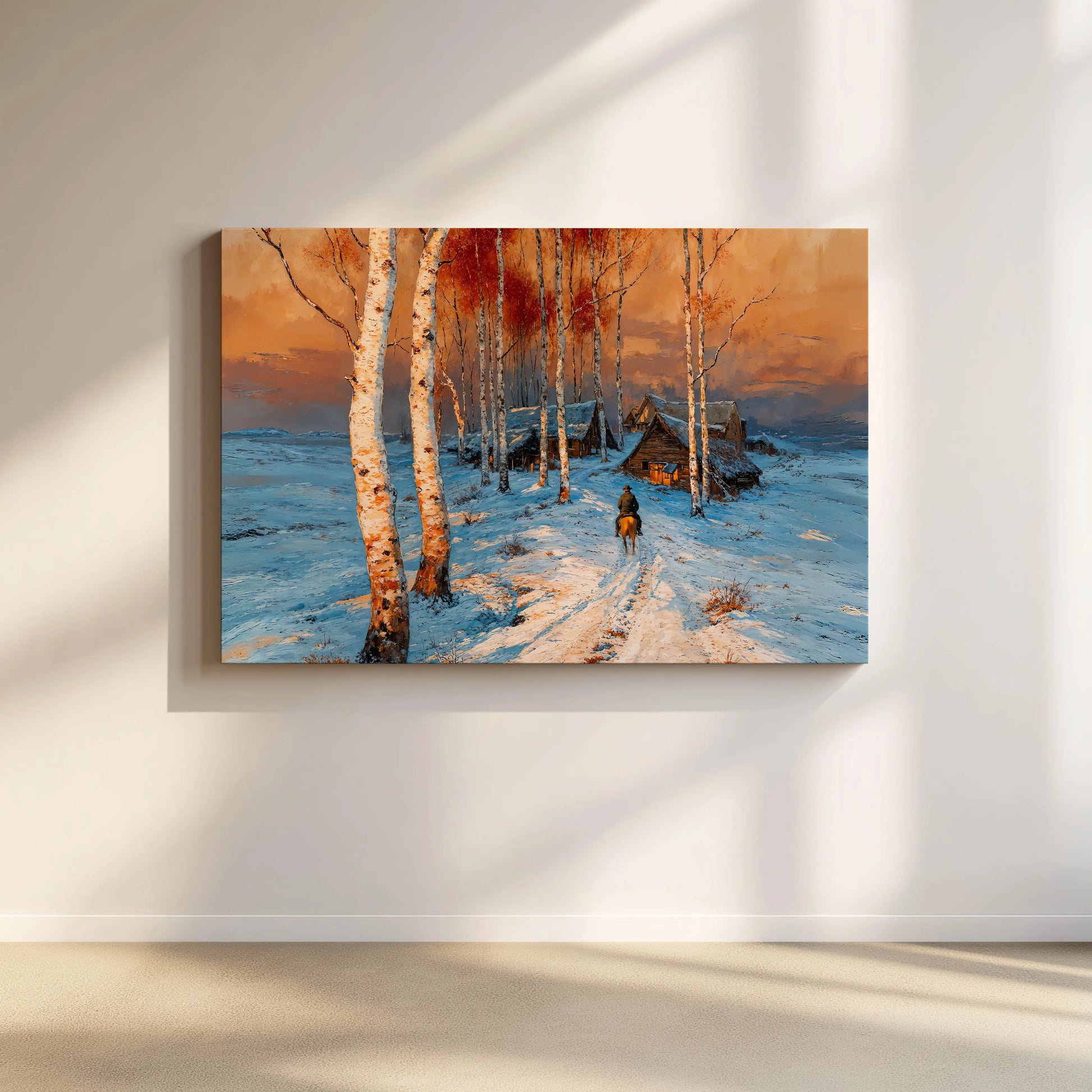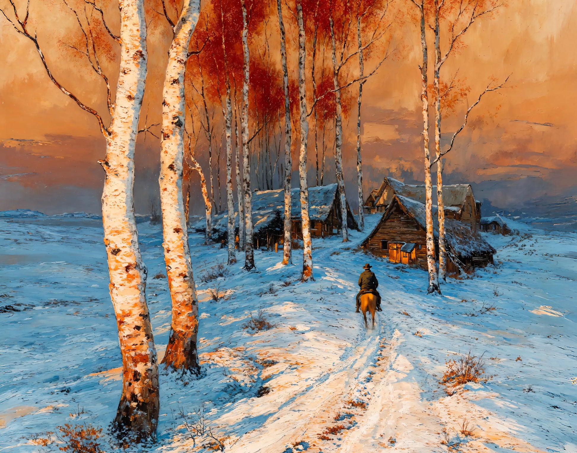 Midnight Cowboy captures the hush of twilight as orange and gold spill across white fields, where cabins tuck close beneath a glowing sky. The scene evokes both solitude and welcome, painted with bold strokes that marry cold air to warm light.