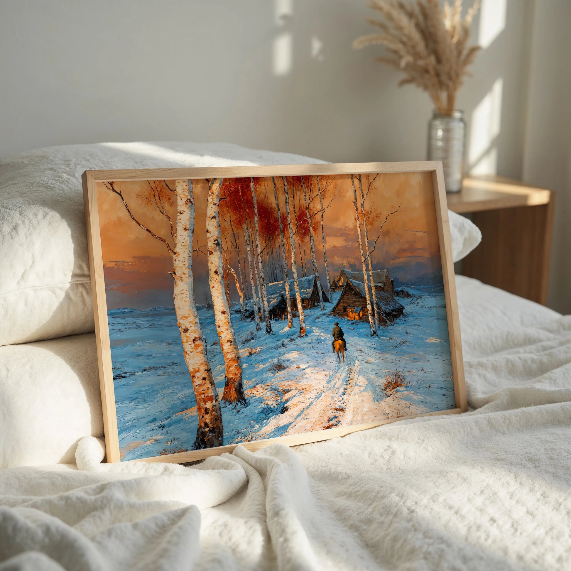 Midnight Cowboy lends story and spirit to study walls, quiet halls, or rustic interiors. Its gallery presence breathes calm and movement alike—an eternal return, where every trail leads home beneath the hush of dusk.