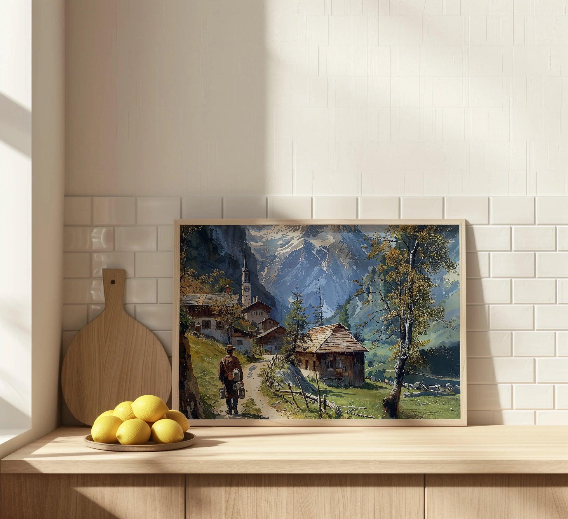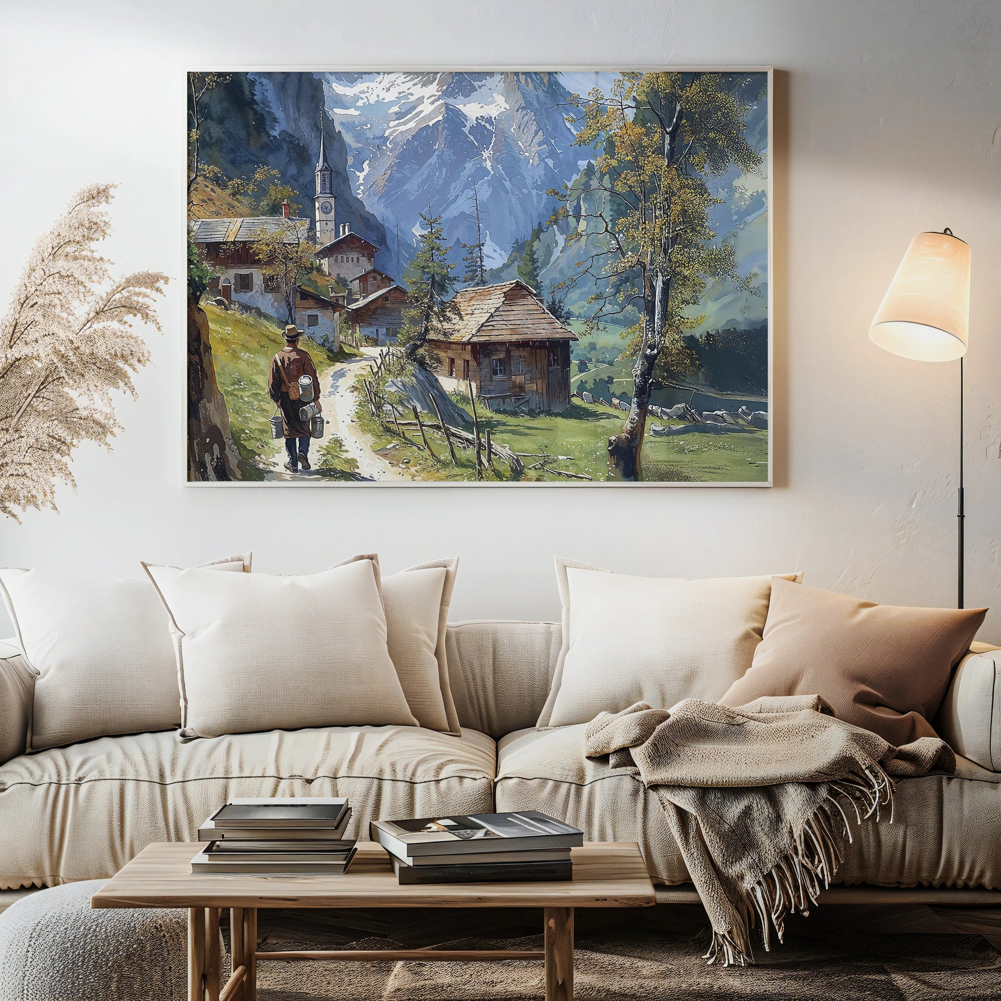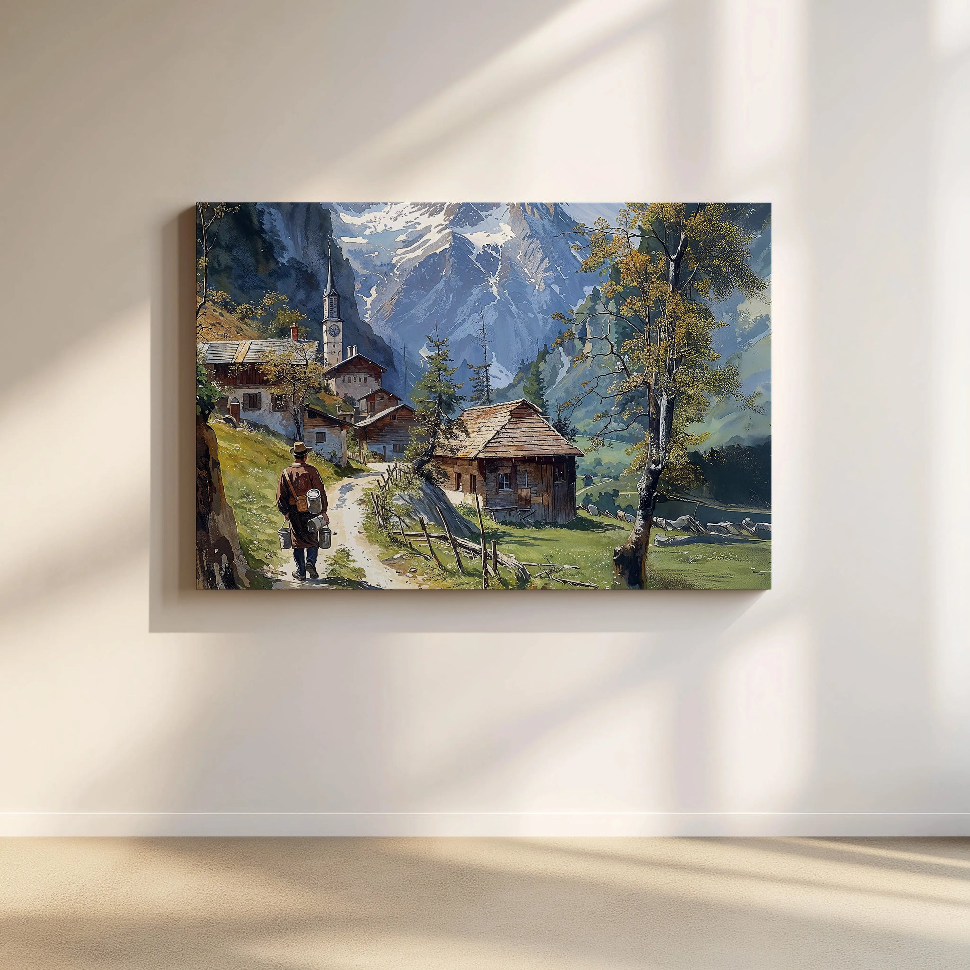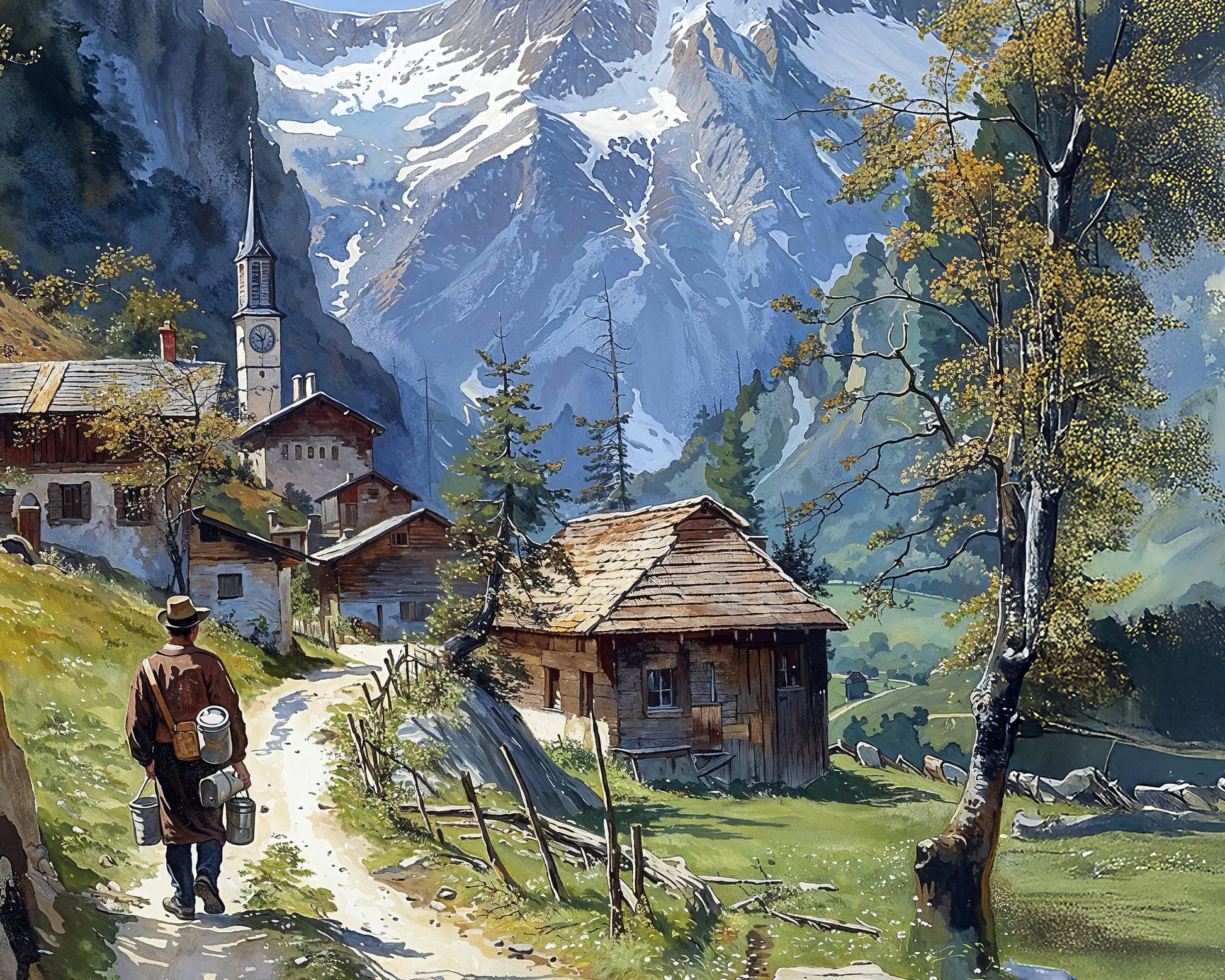 Step into the tranquil charm of Milk Man, where a lone traveler walks through a picturesque alpine village. Surrounded by wooden cottages and watched over by a tall church spire, this serene mountain path unfolds beneath snow-capped peaks and golden autumn trees.