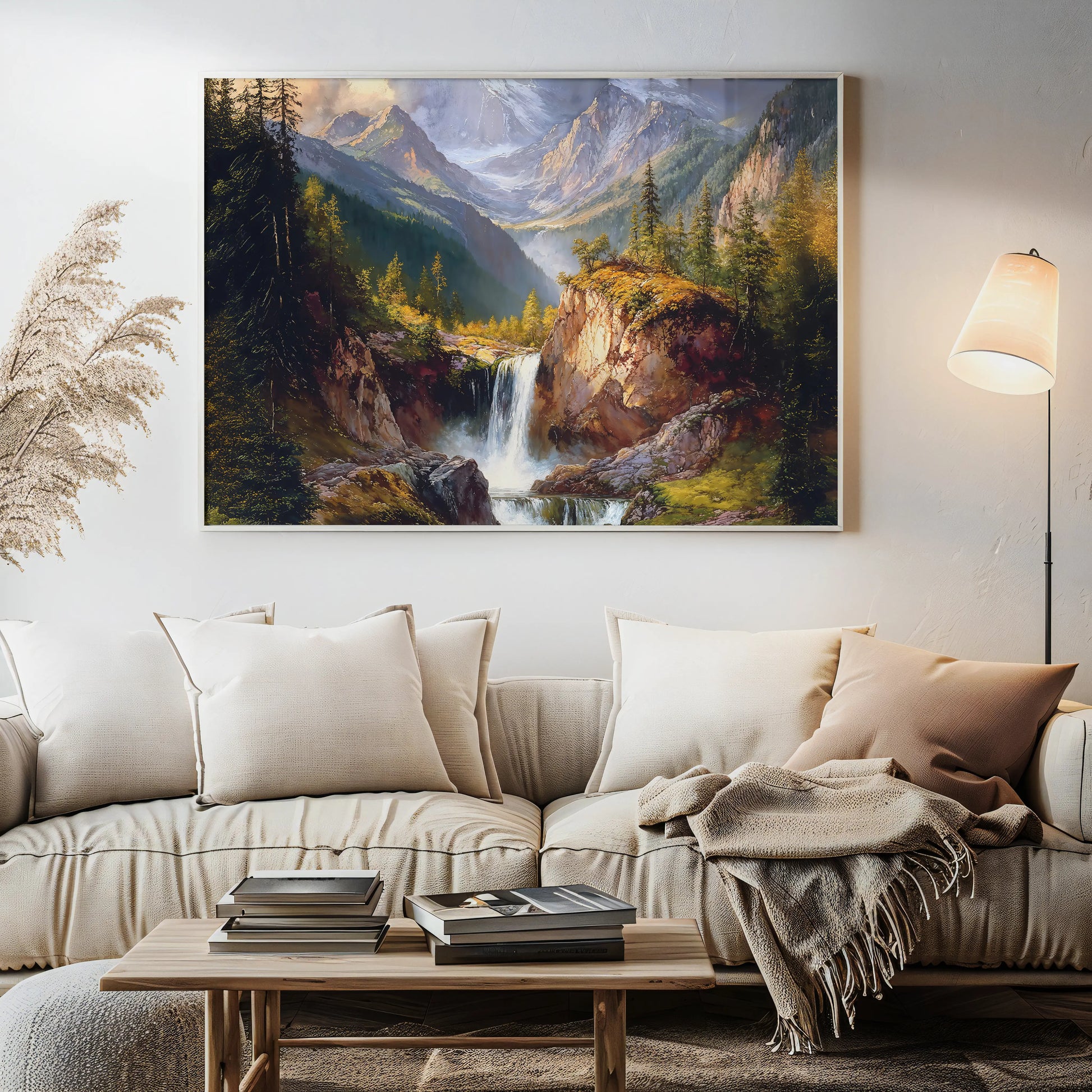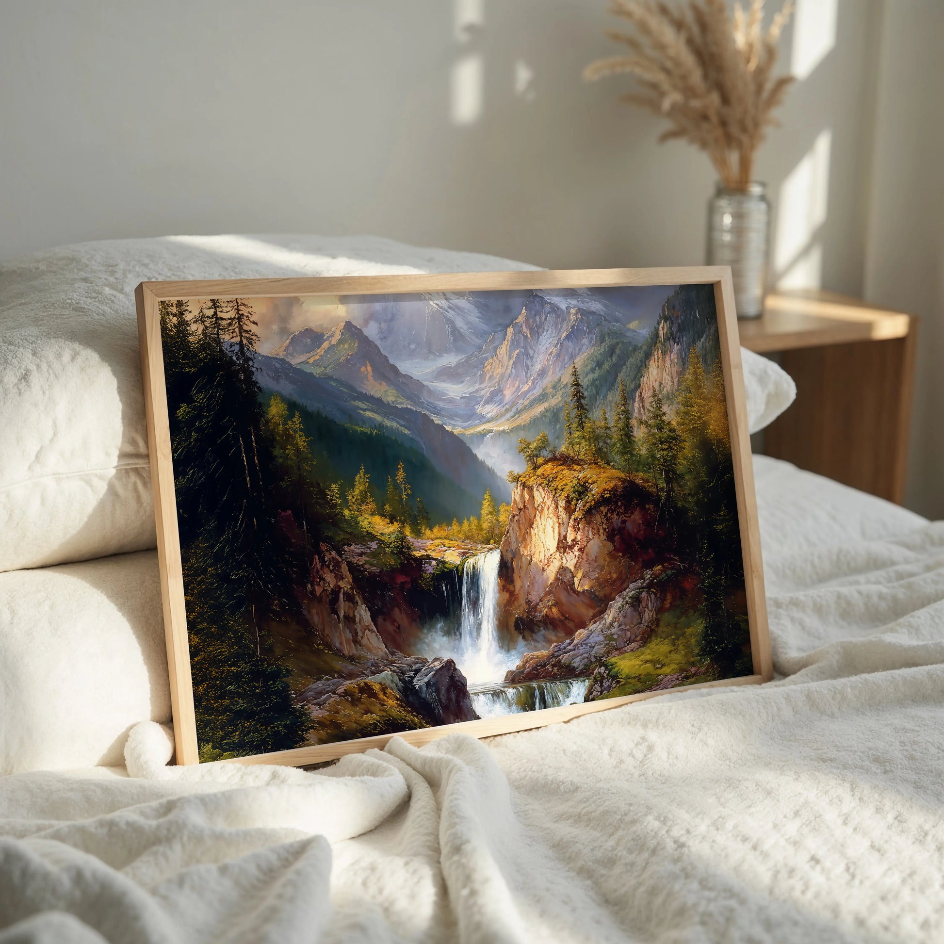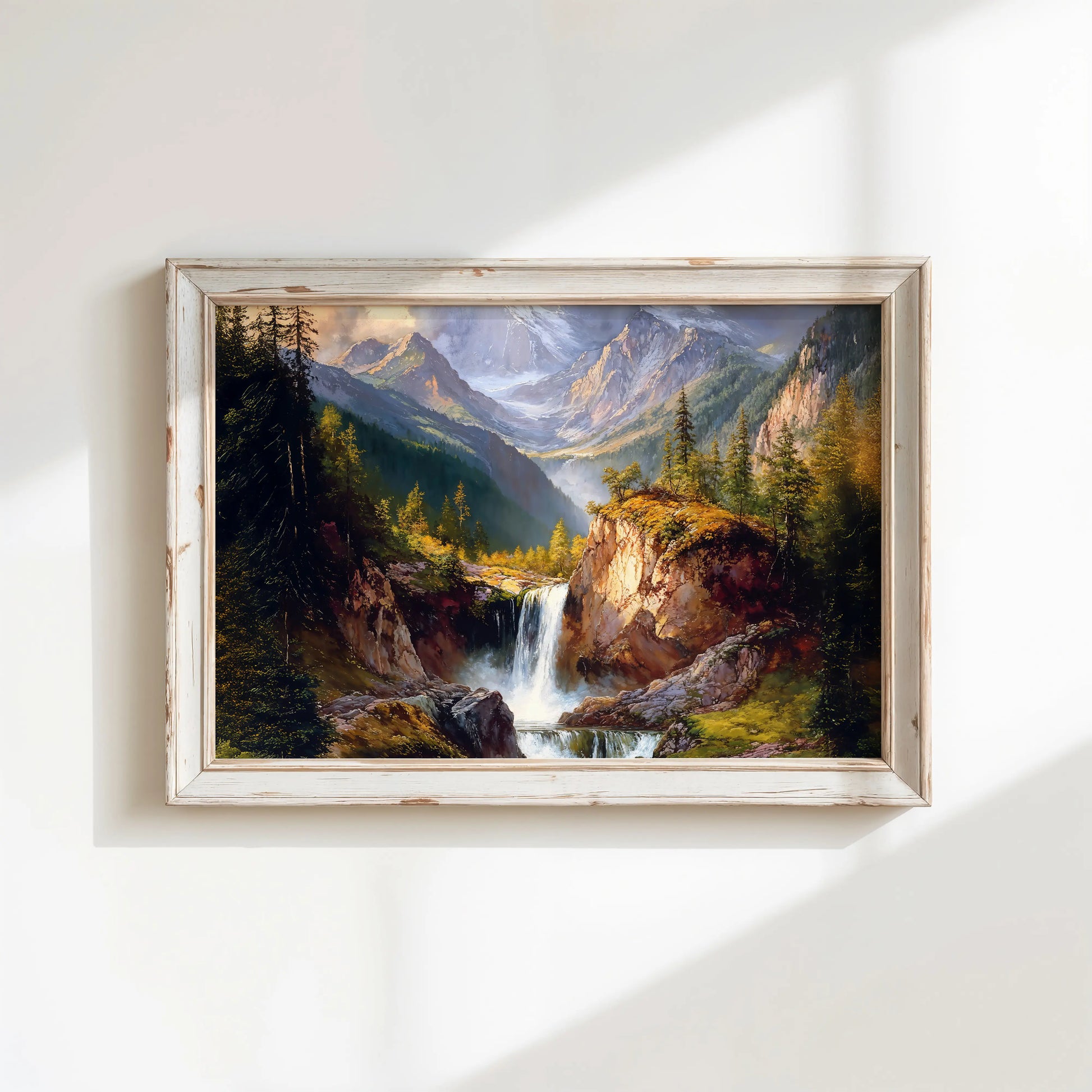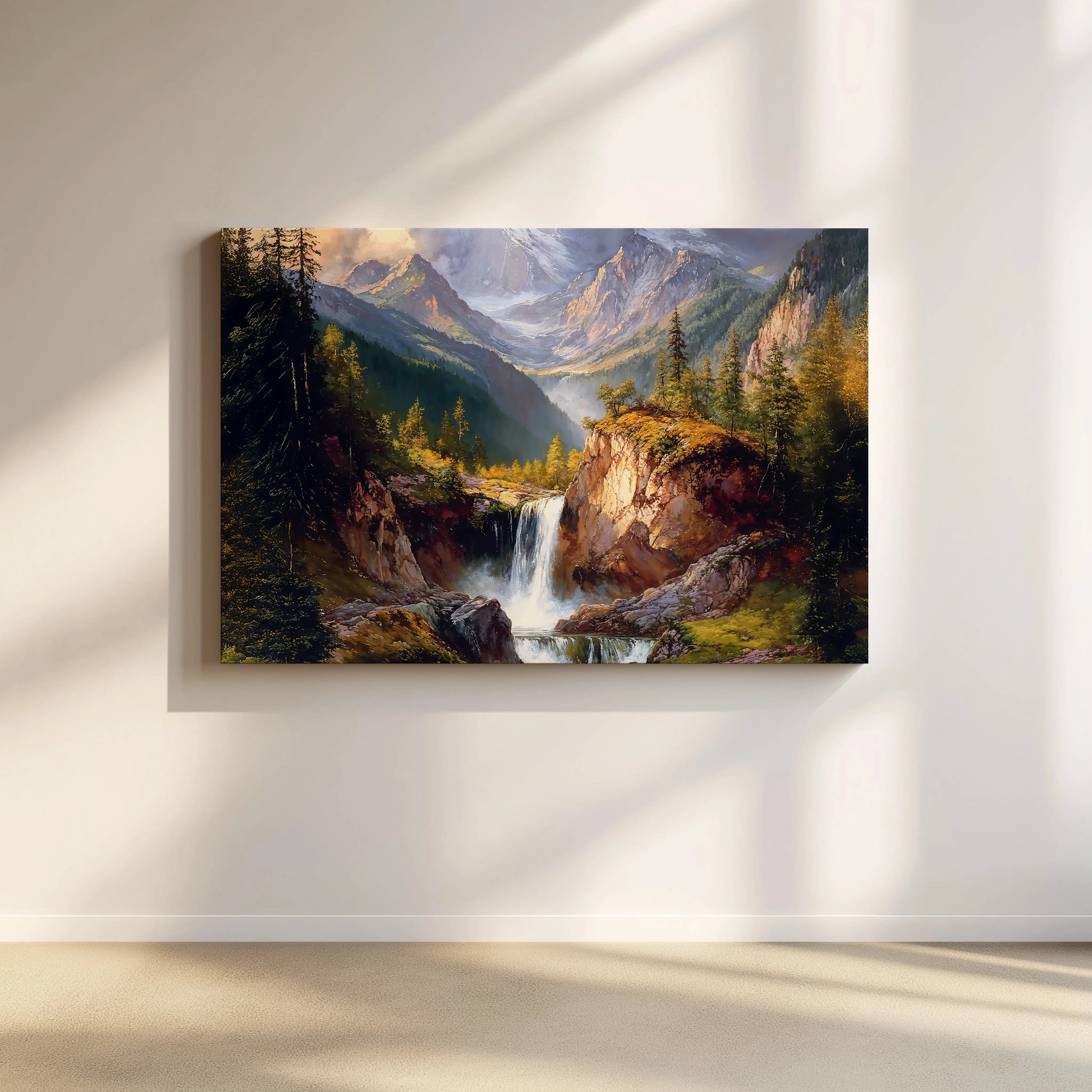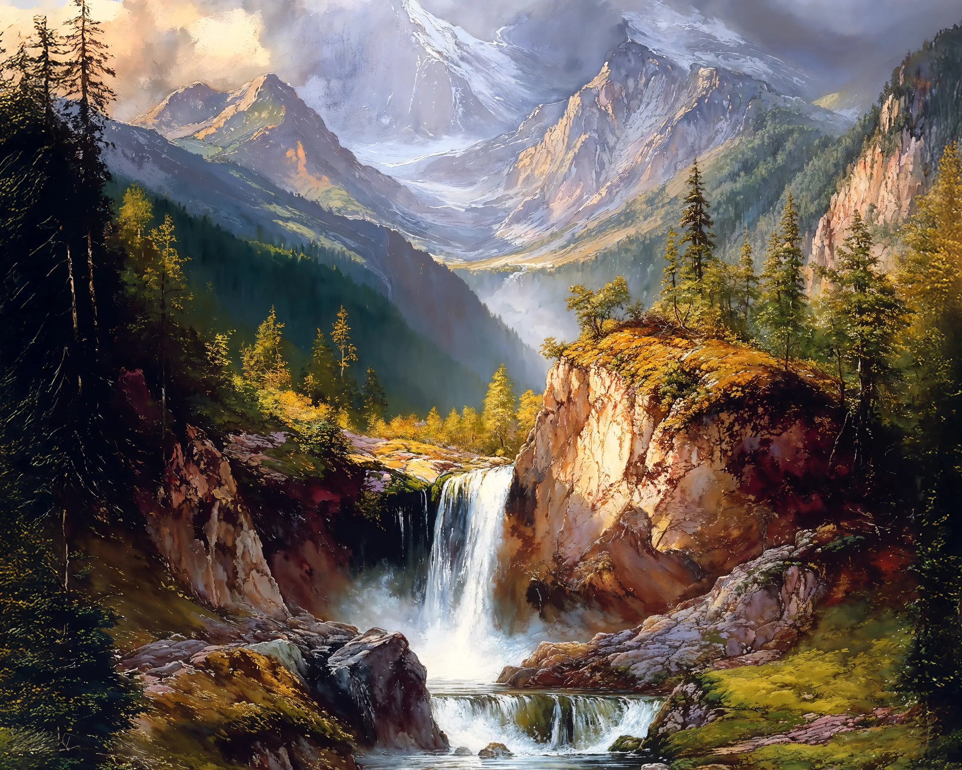 Mistica transports you to a serene mountain valley, where crystal-clear waters tumble from rocky ledges into a quiet forest stream. Surrounded by towering pine trees and snow-kissed peaks, this artwork evokes both majesty and tranquility.