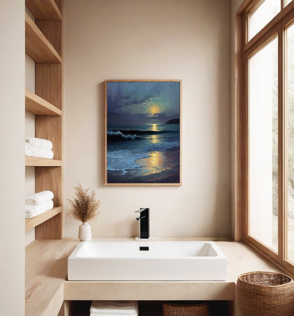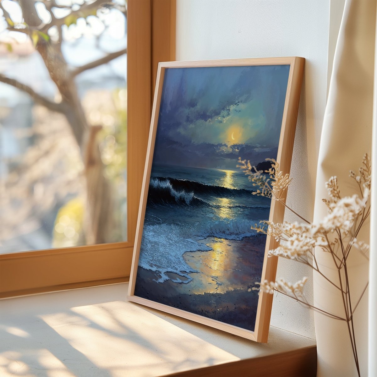 Golden Crescent opens with a luminous crescent rising above a hushed ocean, casting gentle silver across the rolling tide. The shoreline, kissed by reflected moonlight, feels untouched and sacred—where each wave arrives like a whisper. The palette blends atmospheric blues with gold and rose-toned highlights, creating a nightscape suspended between serenity and wonder.