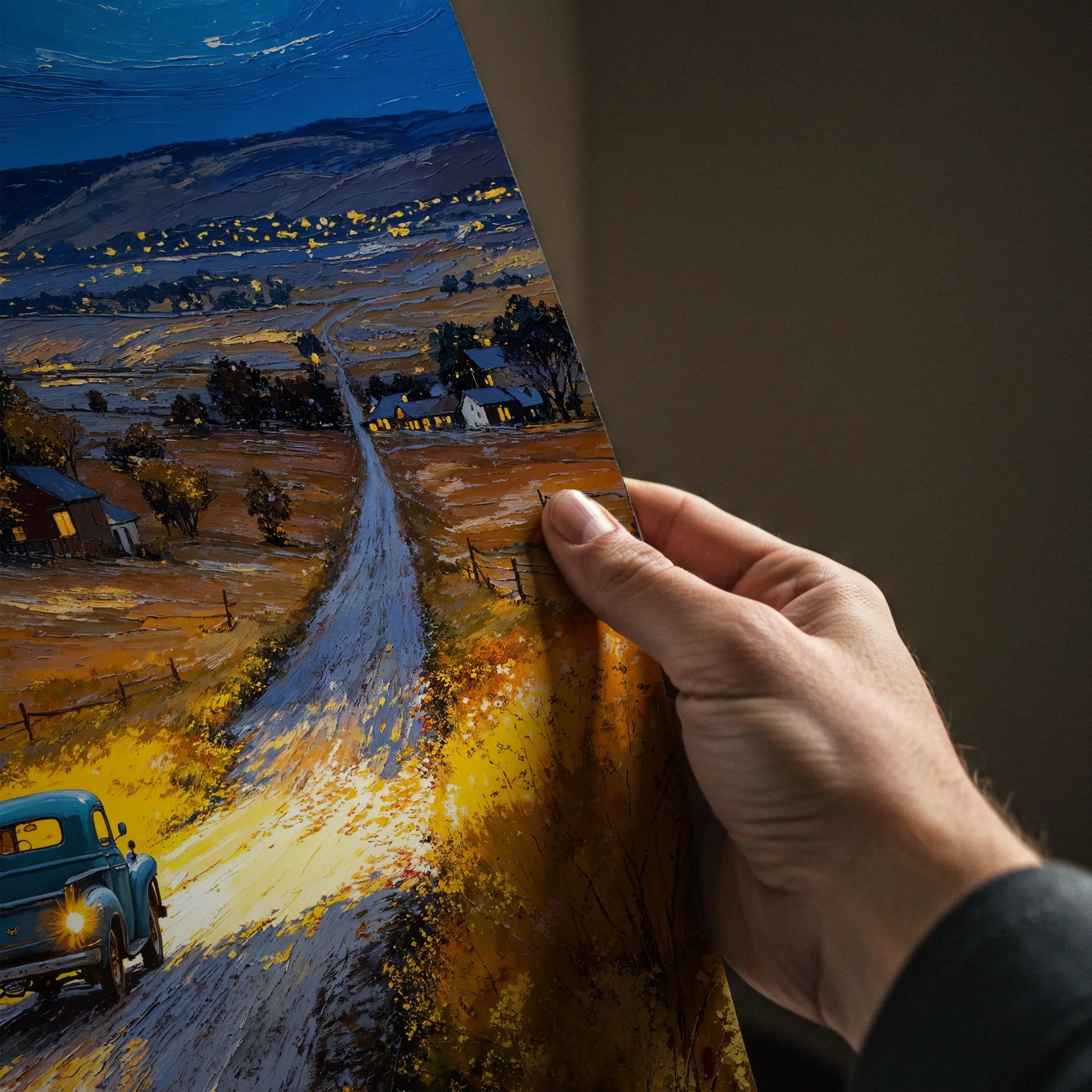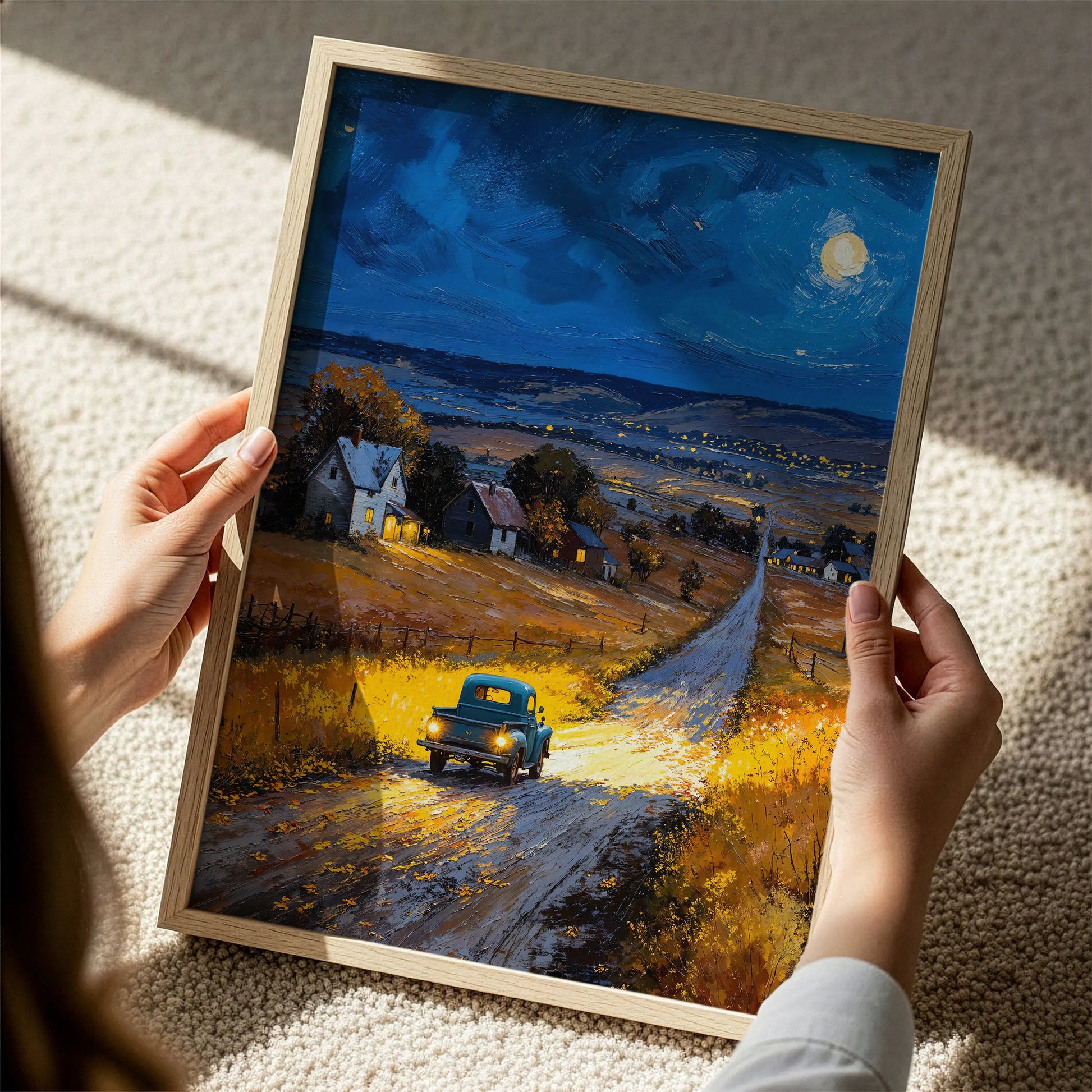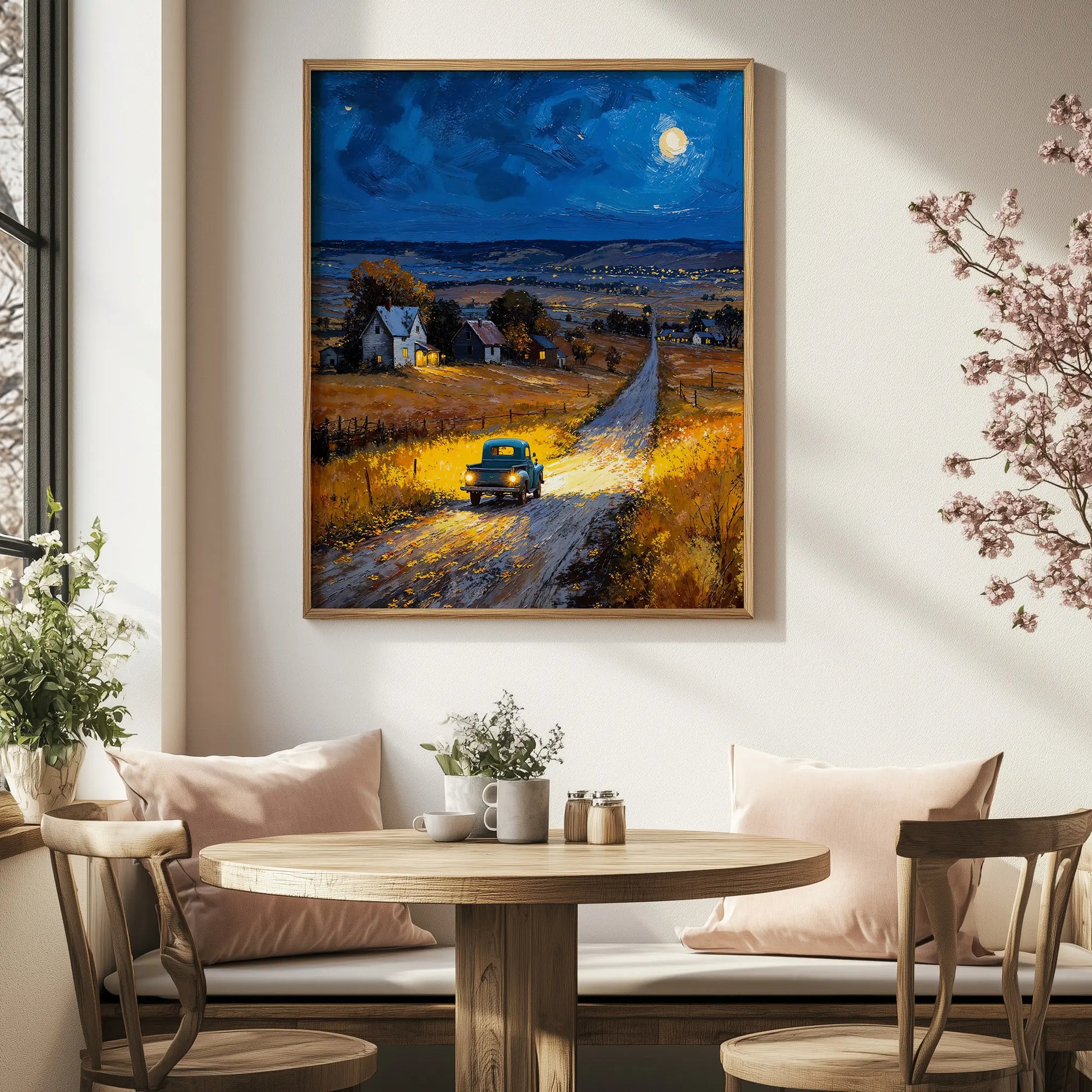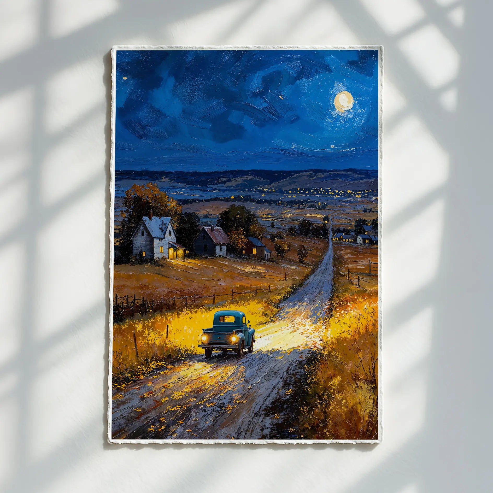 Nebraska’s Moonlight II drifts between memory and dream—a turquoise vintage truck winds its way along a glowing dirt road, the moon suspended in an indigo sky above golden fields.