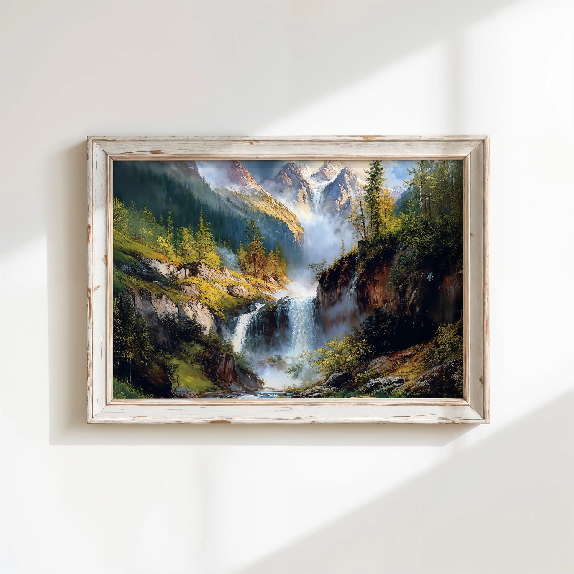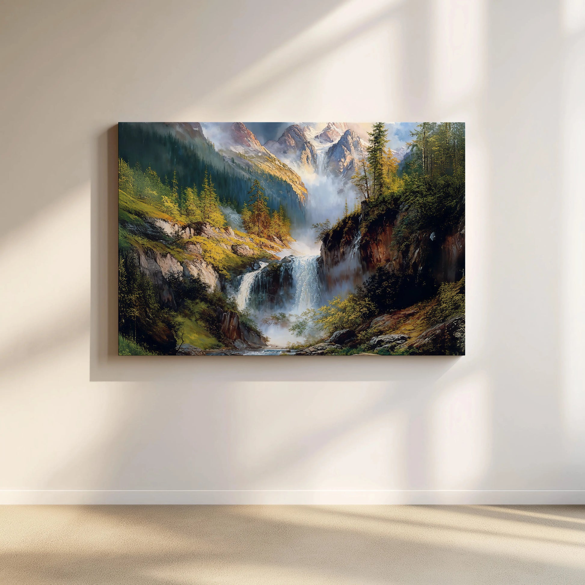 Niagara brings the breathtaking grandeur of wilderness to life with its towering peaks, cascading waterfalls, and mist-draped cliffs. This scene captures a raw, untouched serenity — with sunlight kissing treetops and glacial waters carving through layers of forested rock.