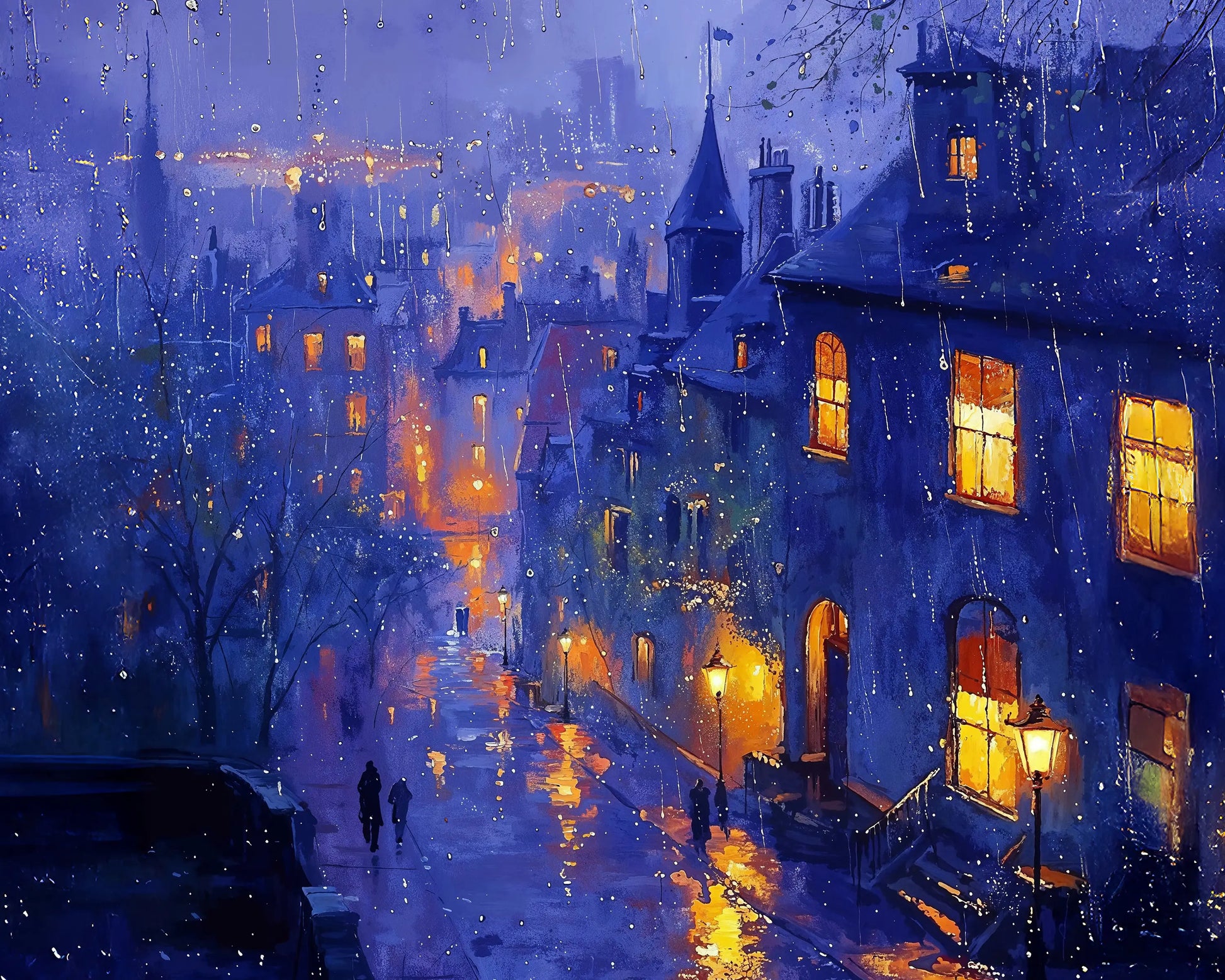 Nocturne de Pluie invites you into a dreamlike city at twilight, where golden lamplight and cozy windows glow against deep indigo and violet skies. Rain gently falls on cobblestone streets, reflecting warm tones and creating a magical, cinematic ambiance.