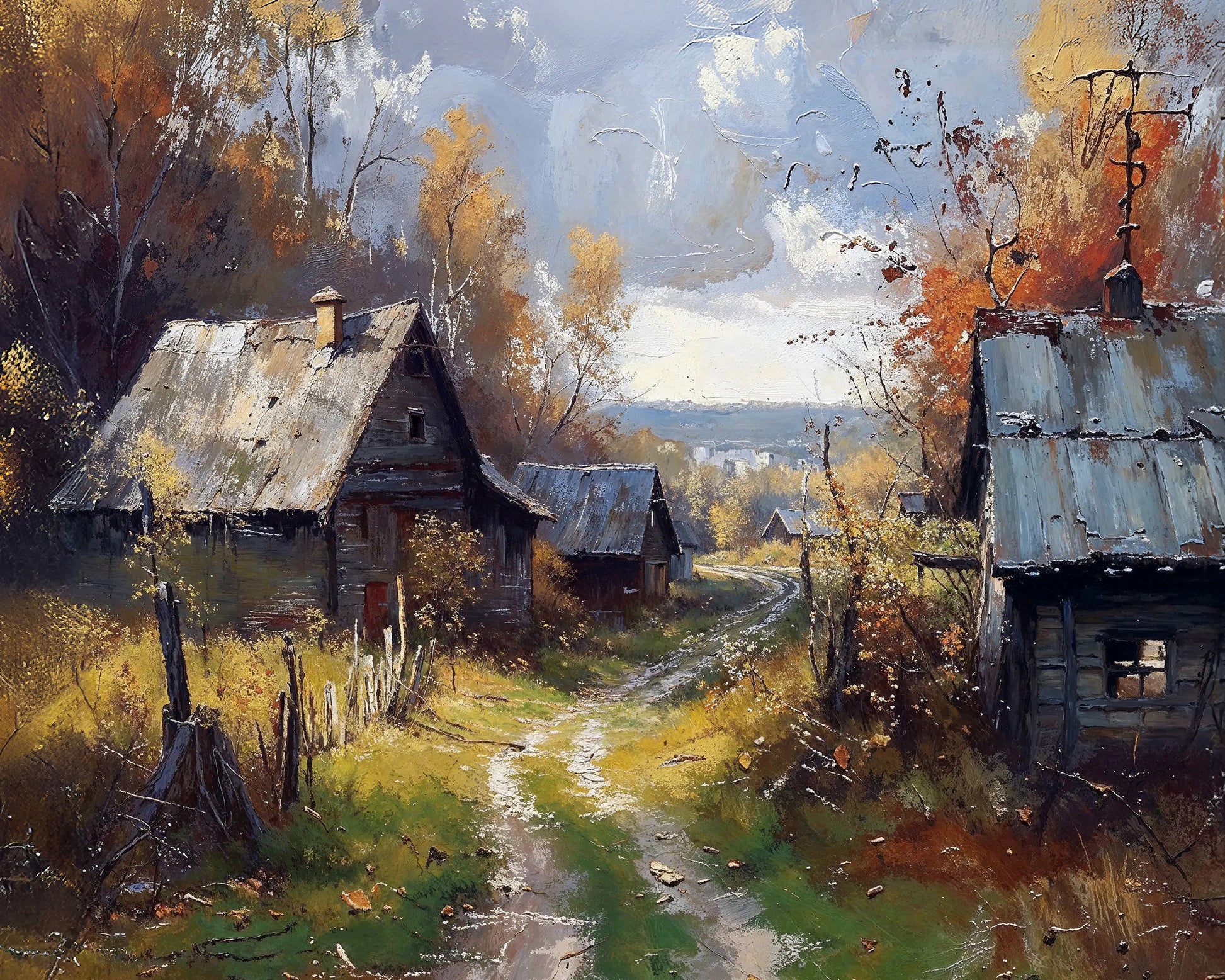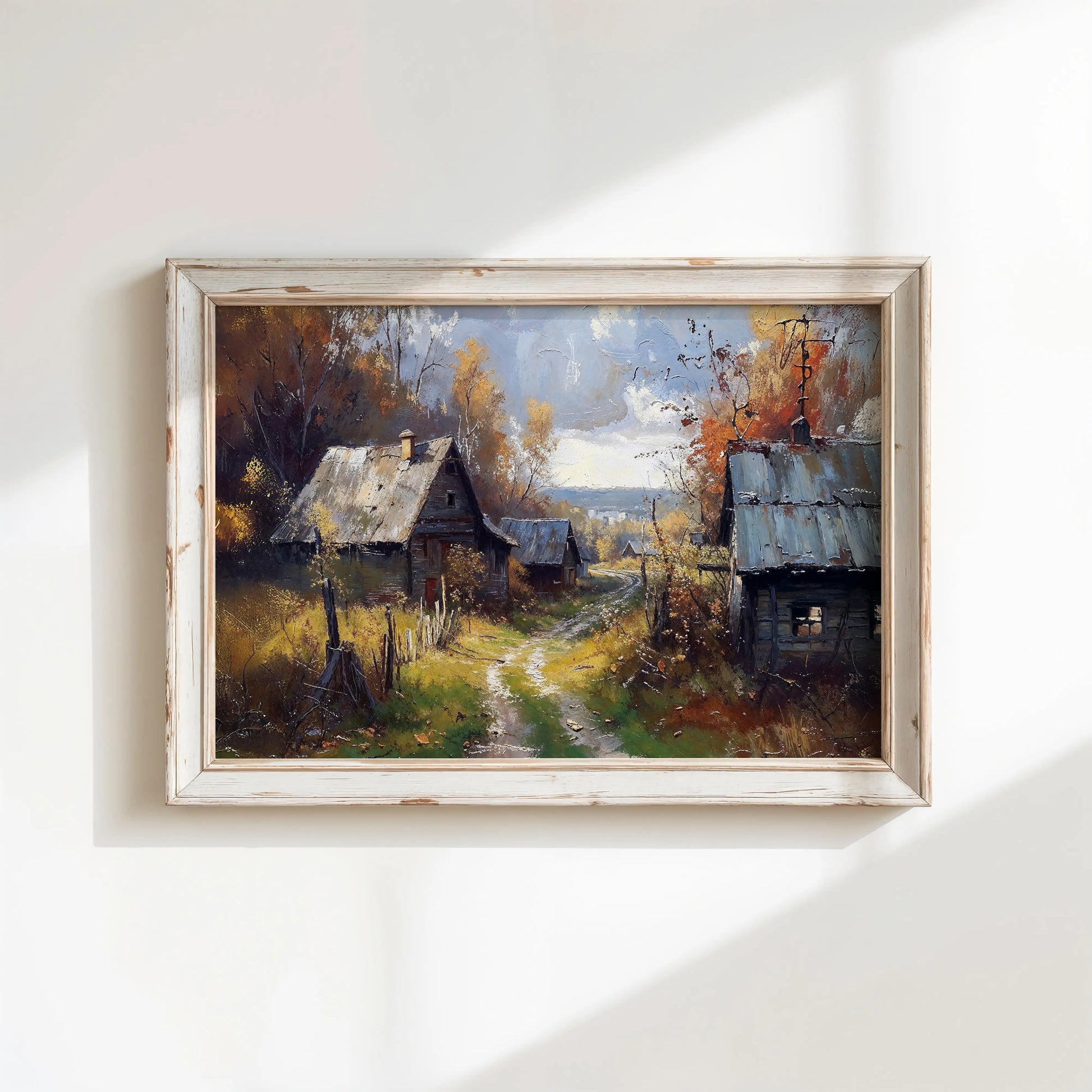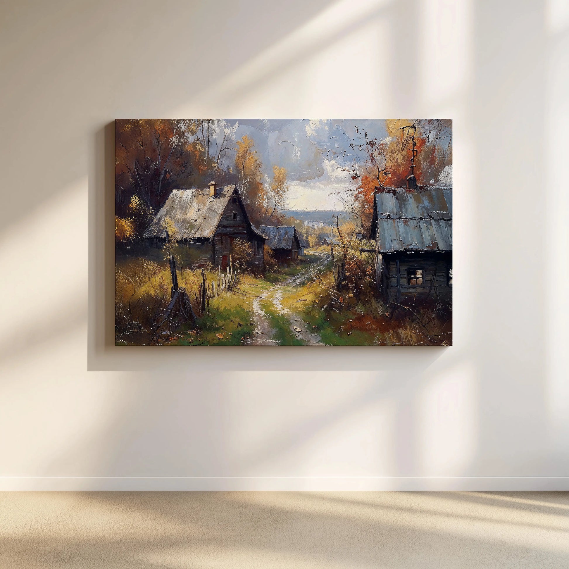 Capture the nostalgia of a quiet autumn countryside with Nostalgia, a richly textured stretched-canvas artwork. This scene shows rustic cabins tucked along a winding path, set amidst golden foliage and soft sunlight.