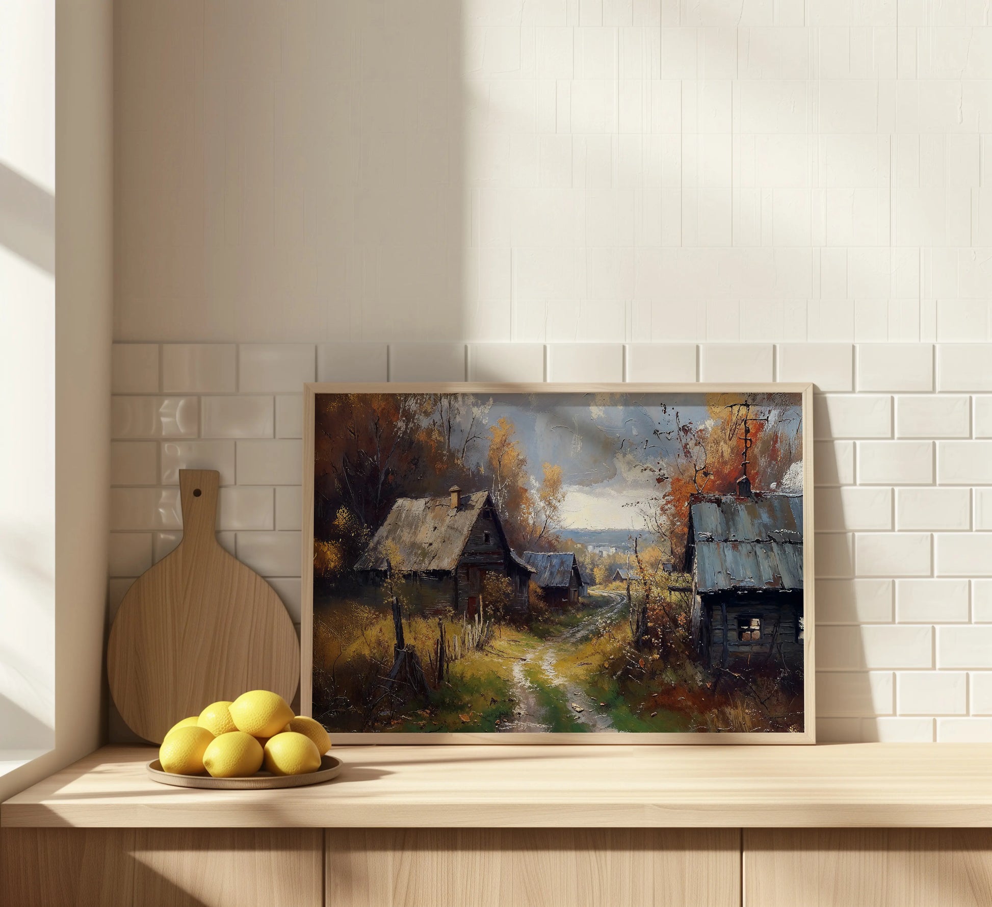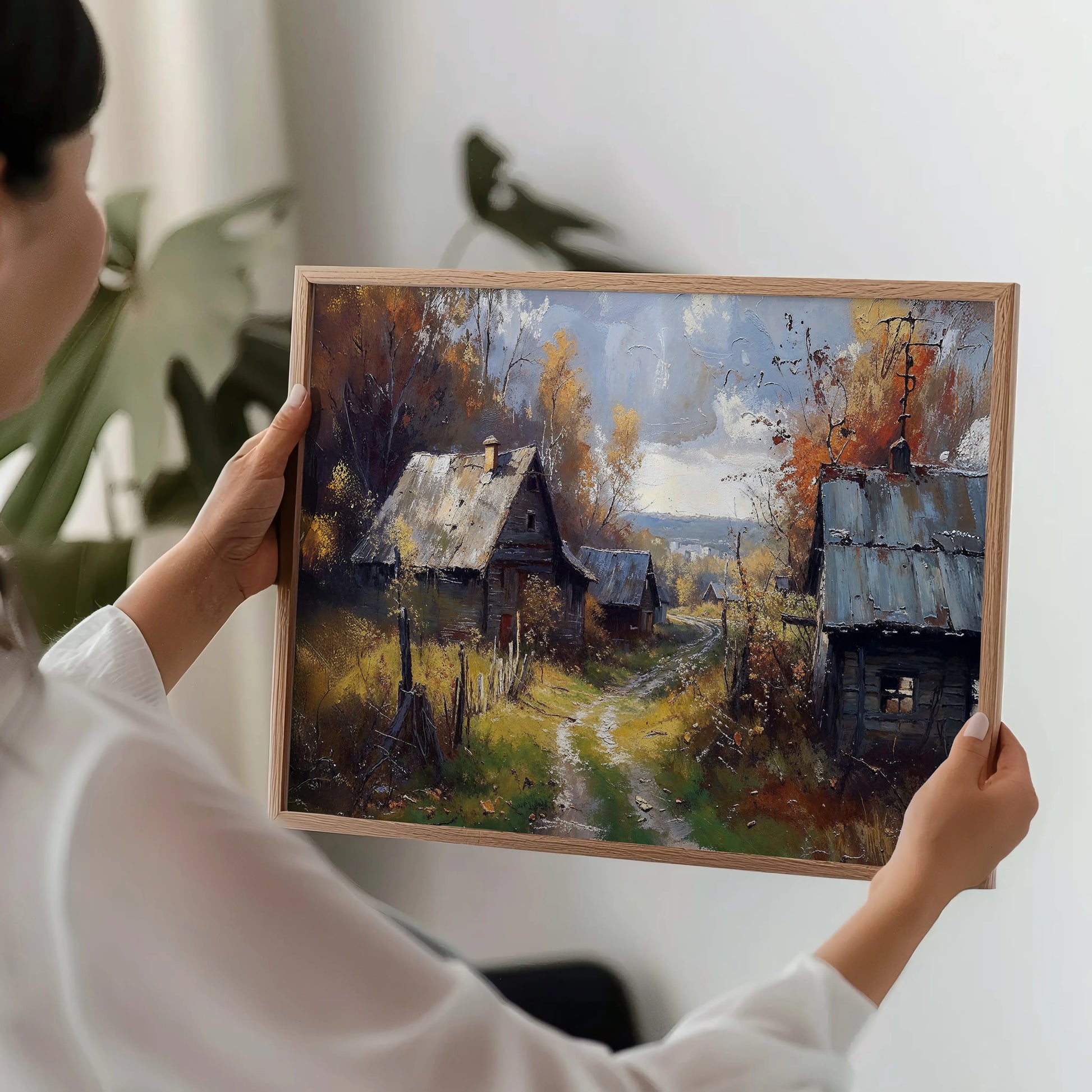 The painting invites feelings of warmth and simpler times, perfect for cozy interiors, rustic-themed rooms, or seasonal wall displays. Let it transport you to a peaceful rural retreat in the heart of fall.