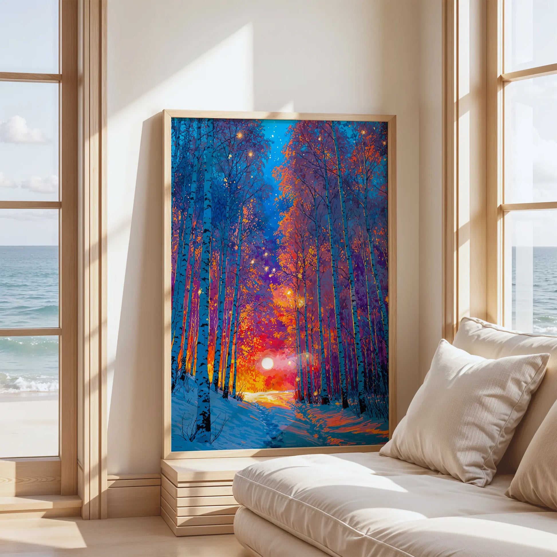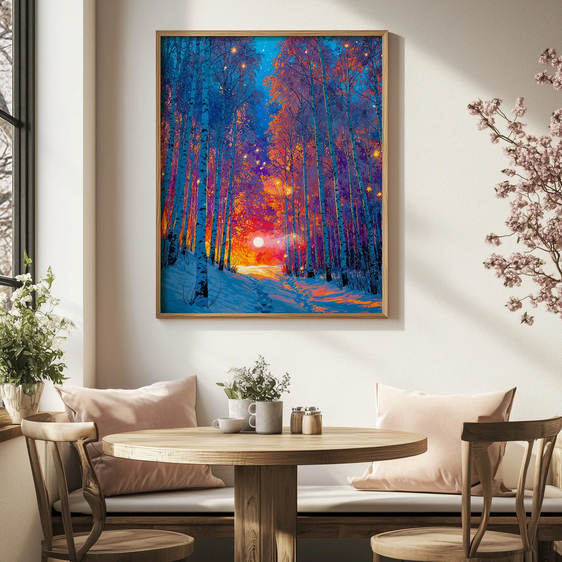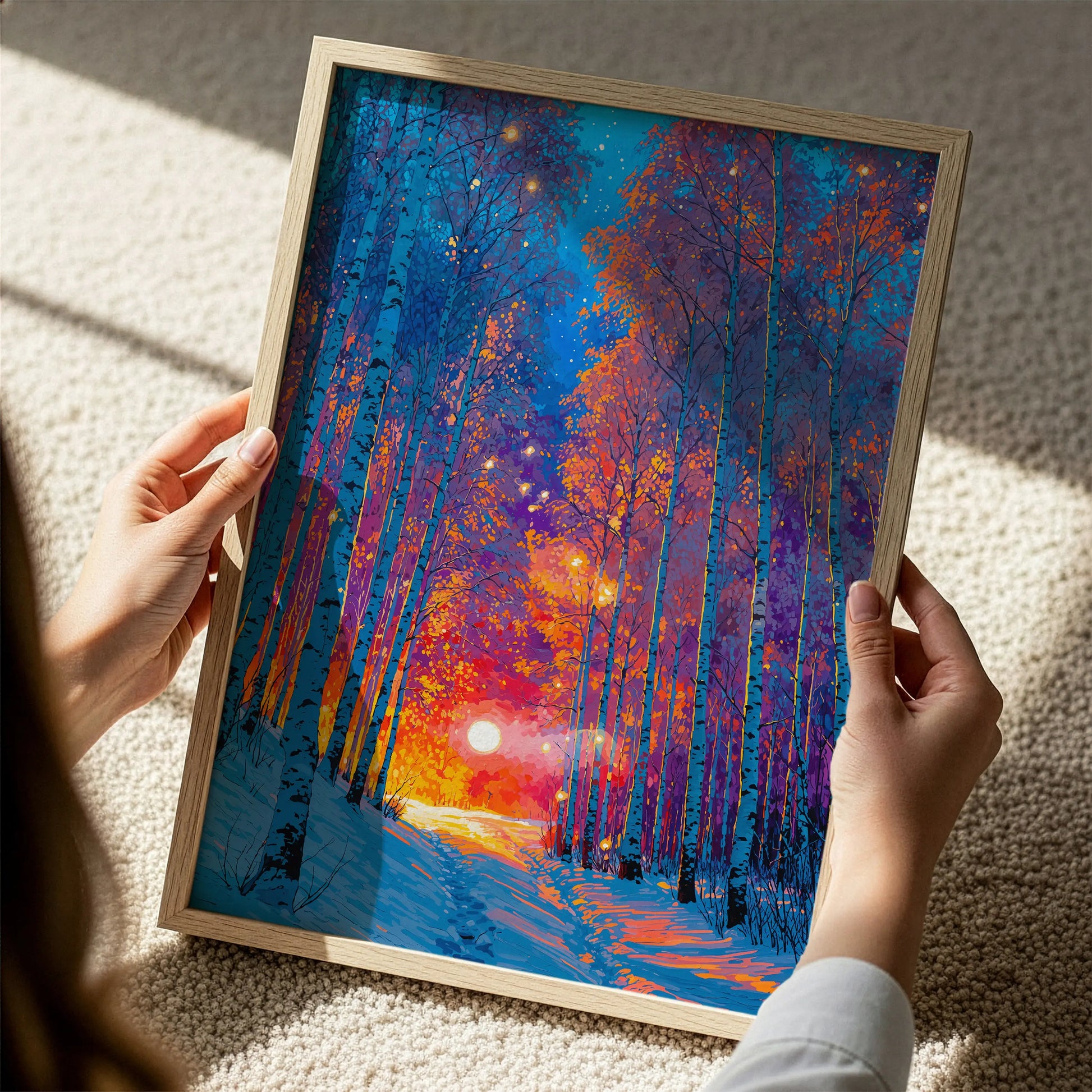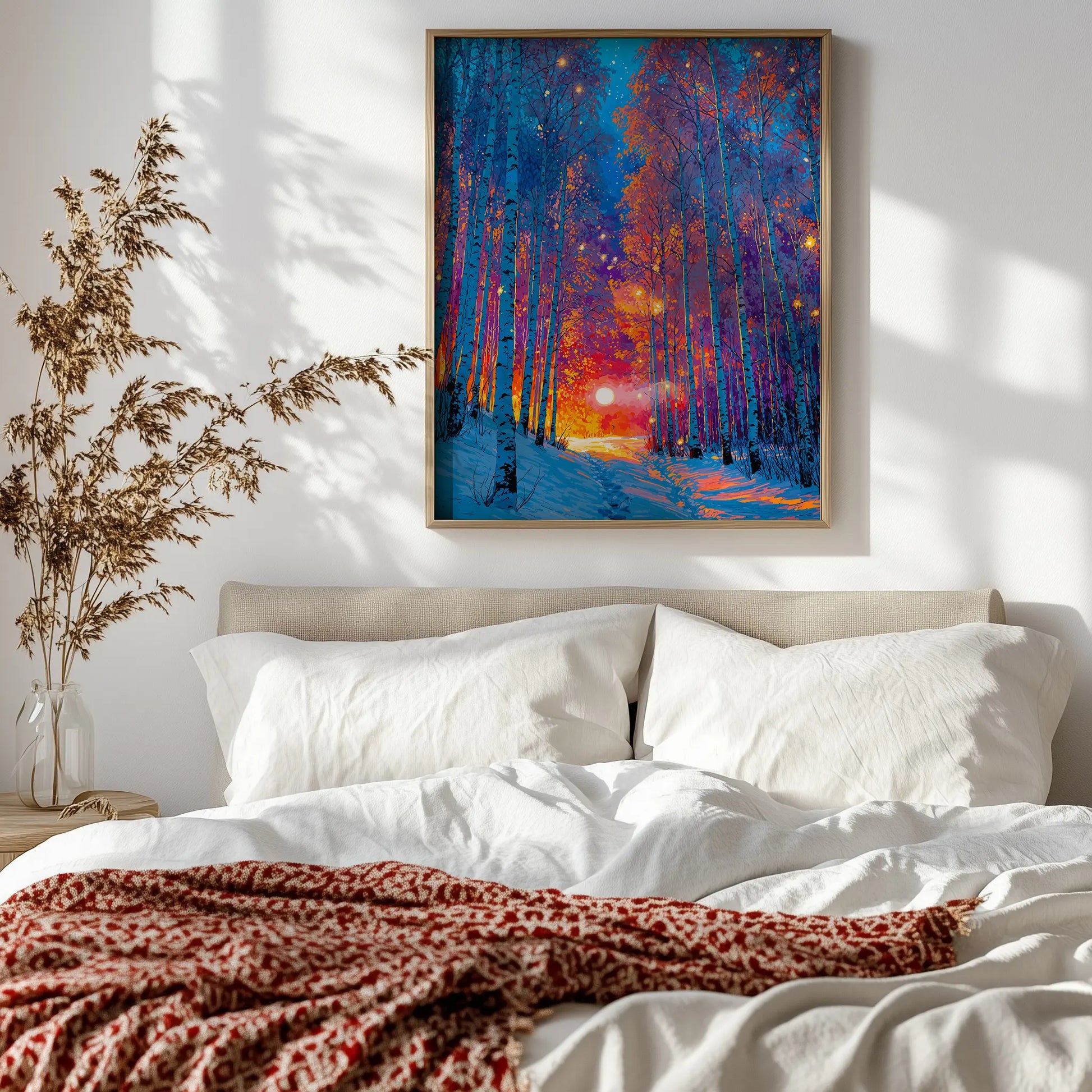 This piece brings a radiant, fairy-tale stillness to any space — a bedroom longing for softness, a meditation corner, a child’s reading nook, or a winter-themed living room where someone might sit for a moment and feel the hush of a forest lit from within.