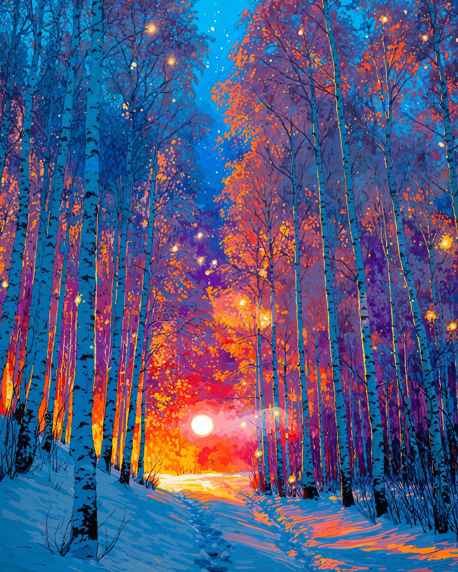 Small floating lights drift between birch trunks, the snow glowing softly beneath a rising moon. In Orbs, the world feels briefly magical: that even in the coldest season, something luminous wakes in the dark and refuses to fade.