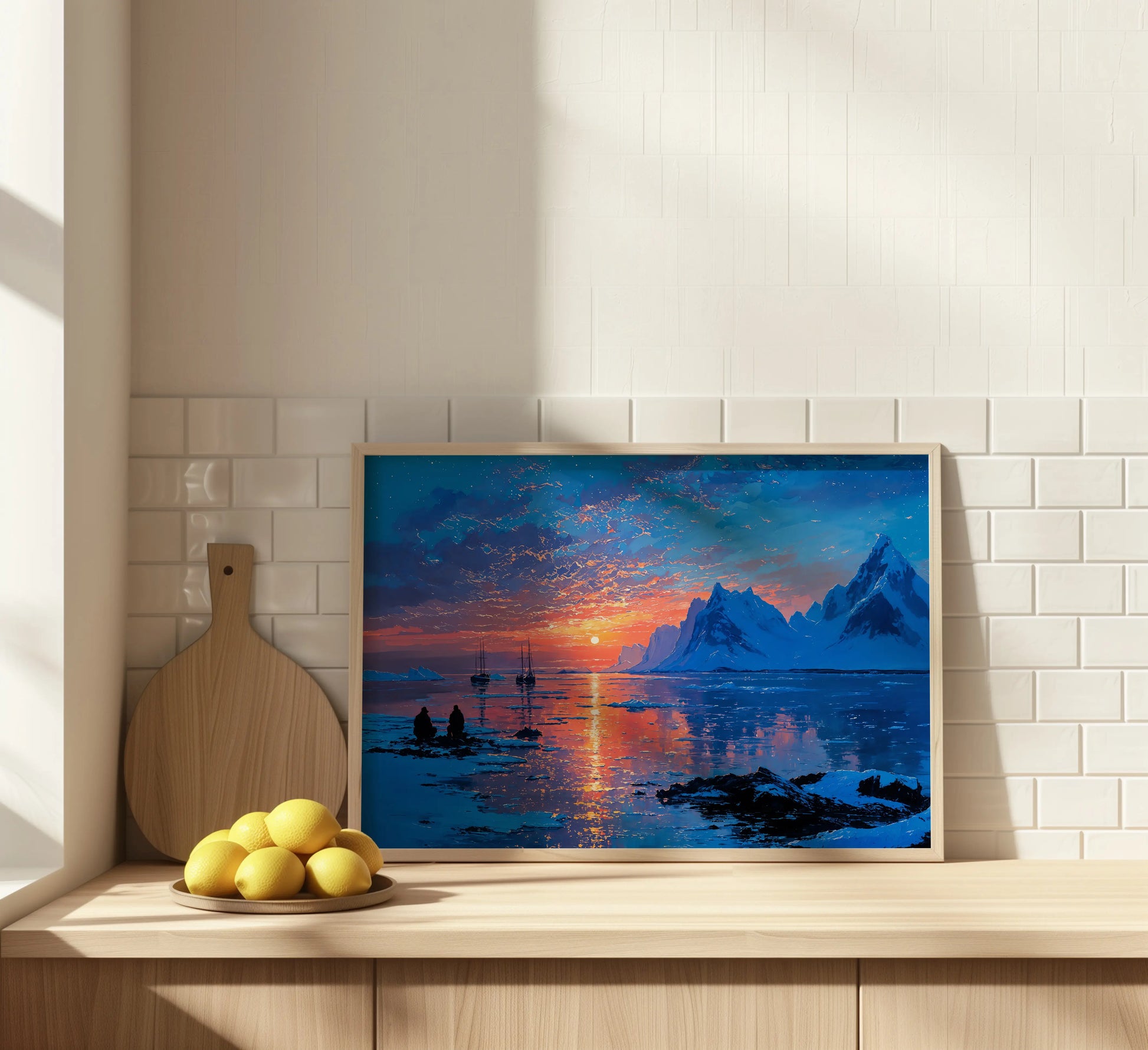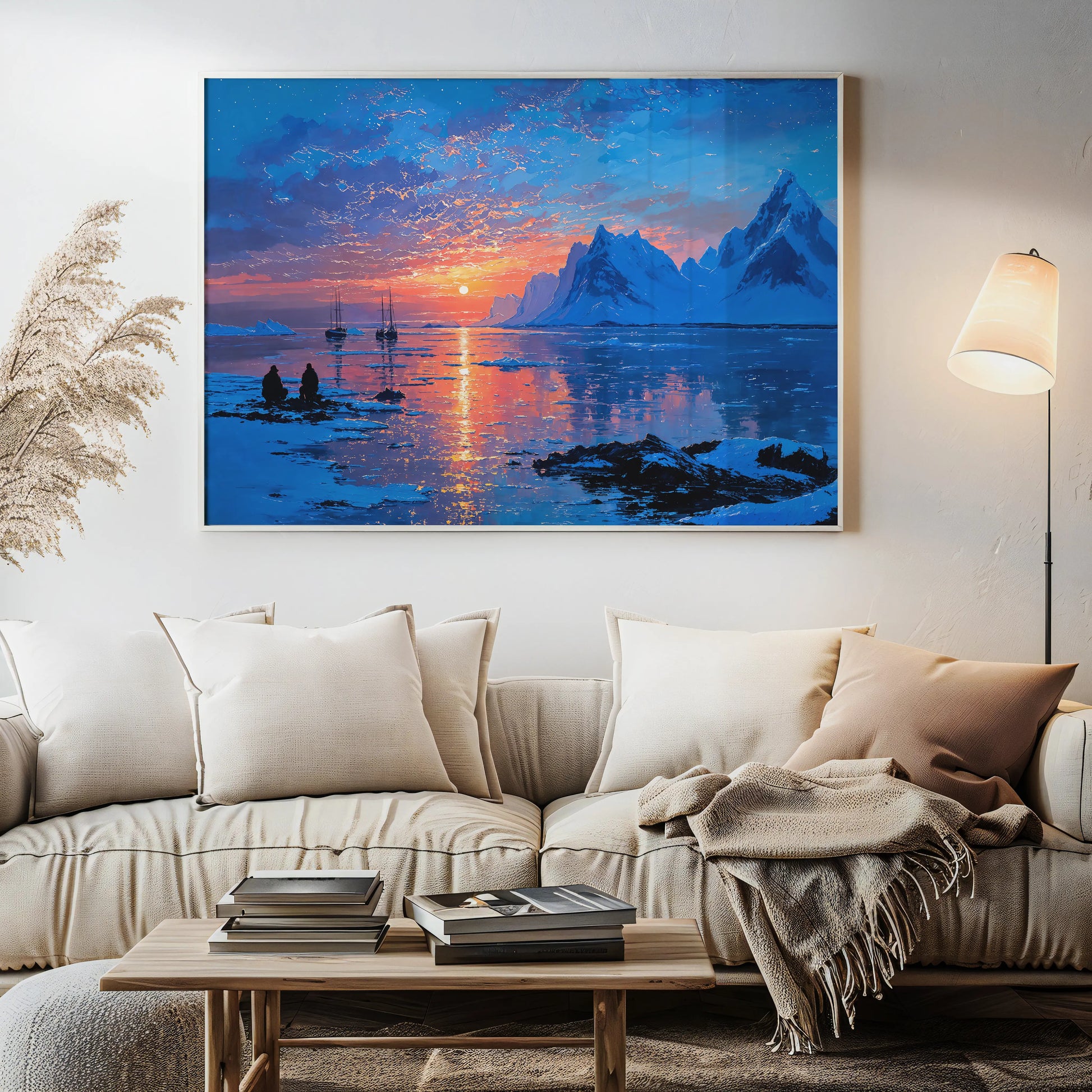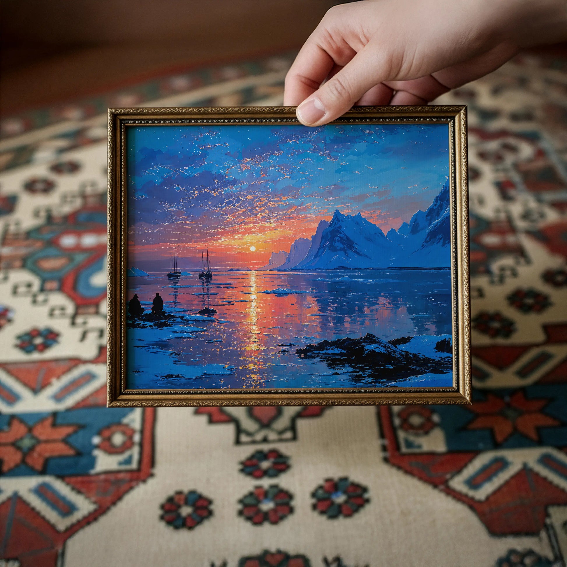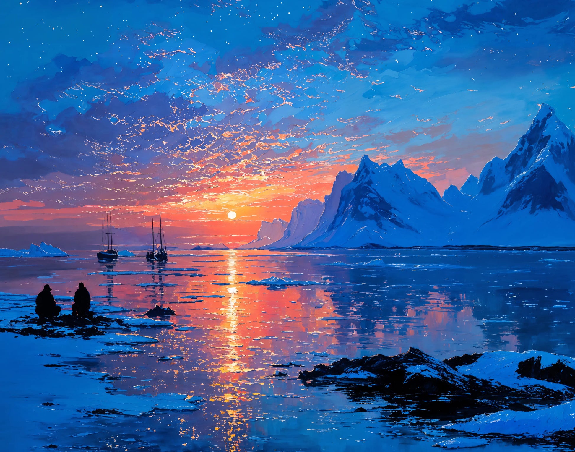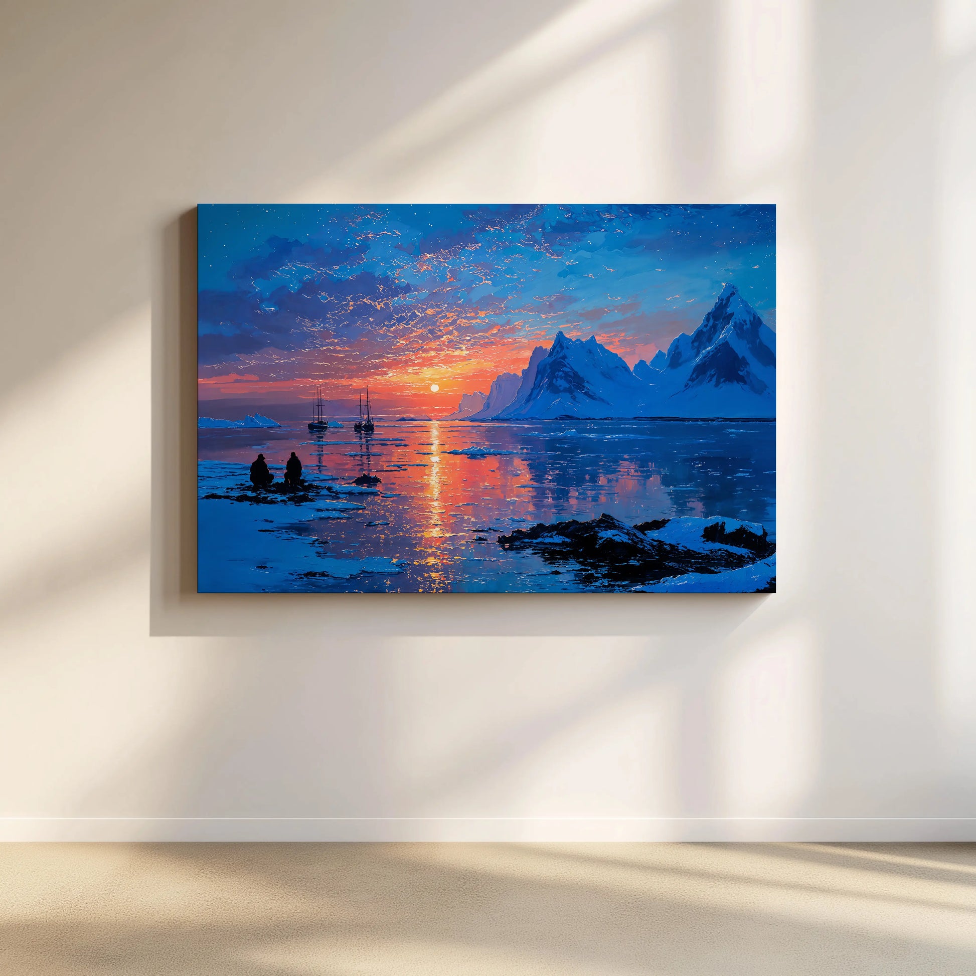 Polaris captures an arctic expanse alive with soft fire—reflections dancing on fractured ice, sailing ships adrift in silence, and two dark figures bearing witness. The mountains rise like sentinels, bathed in indigo and flame, where solitude and sublimity converge.