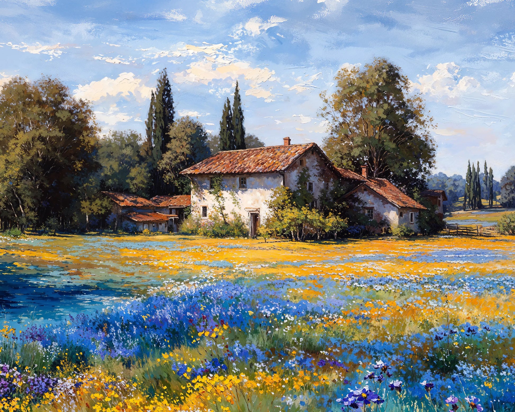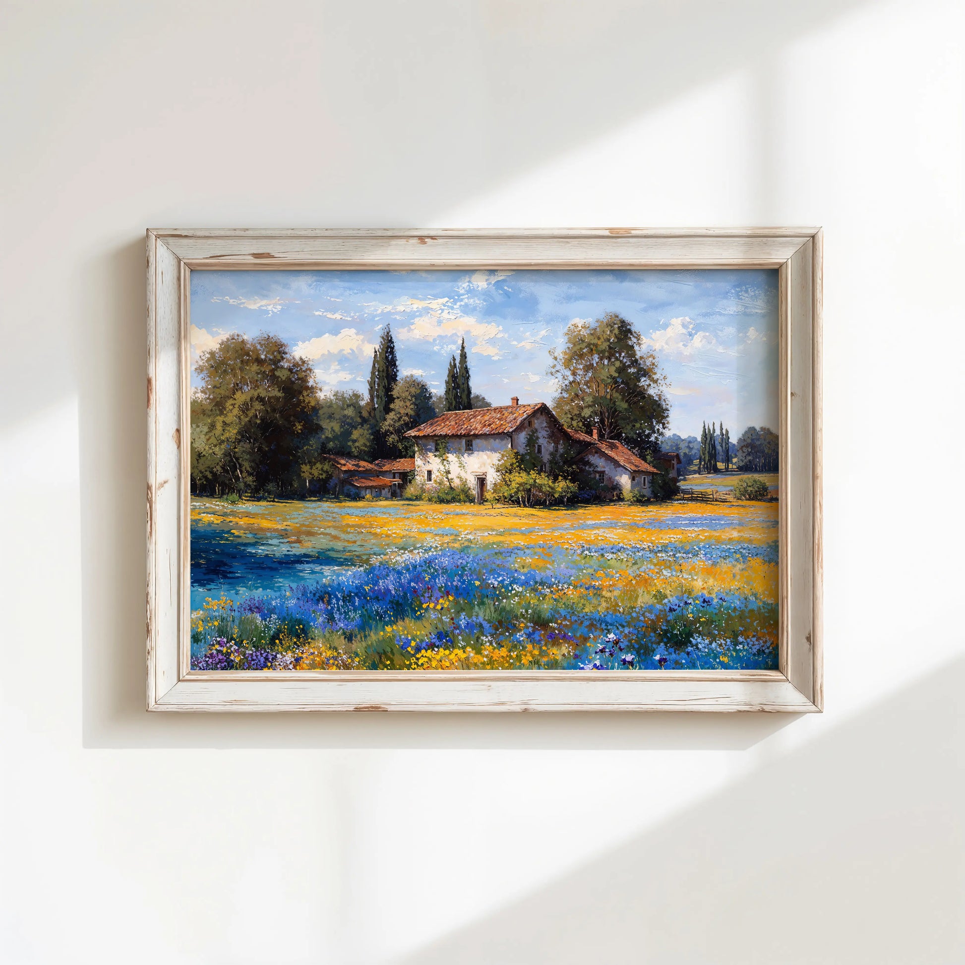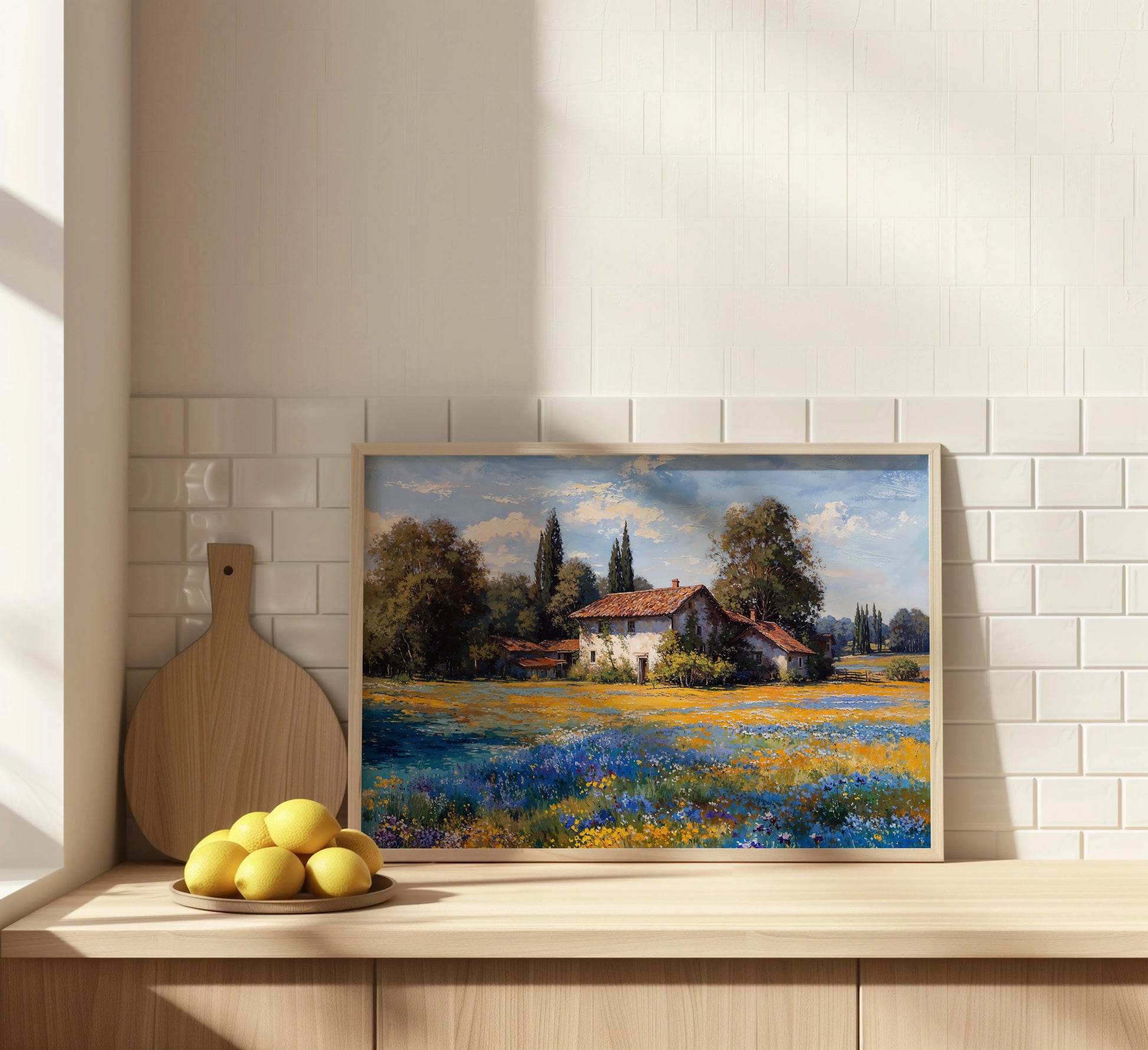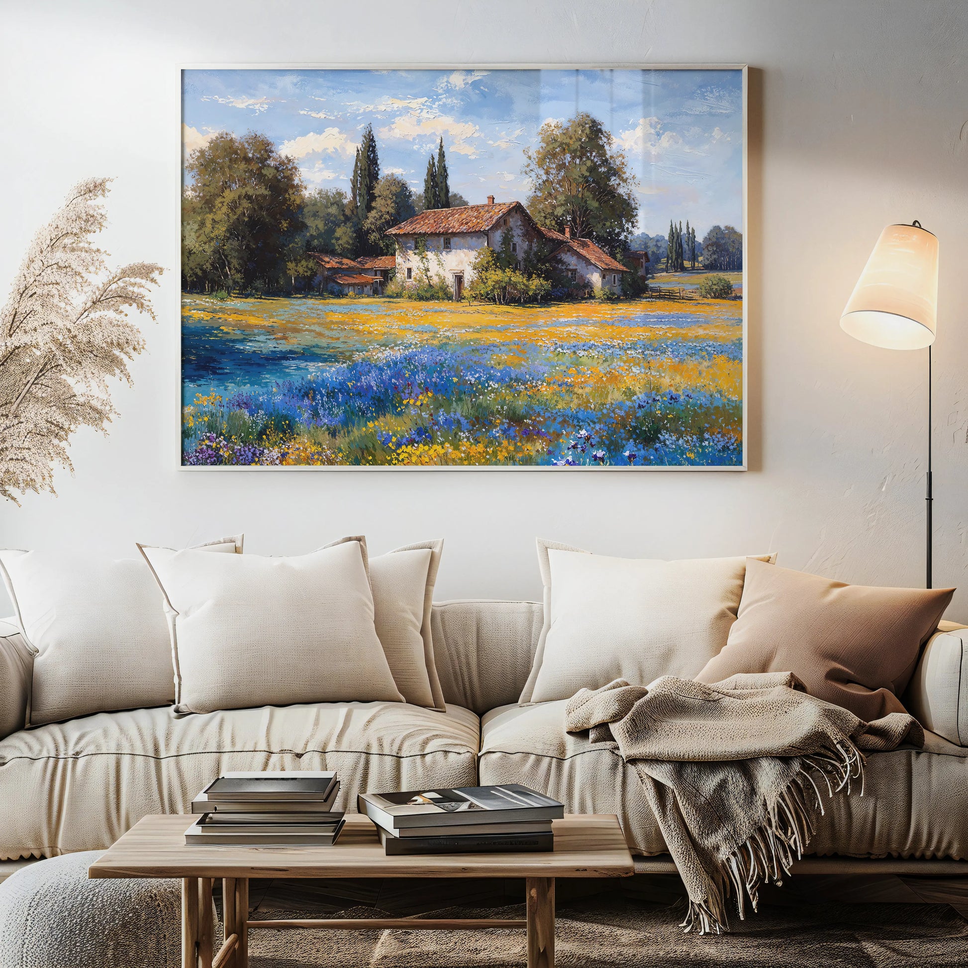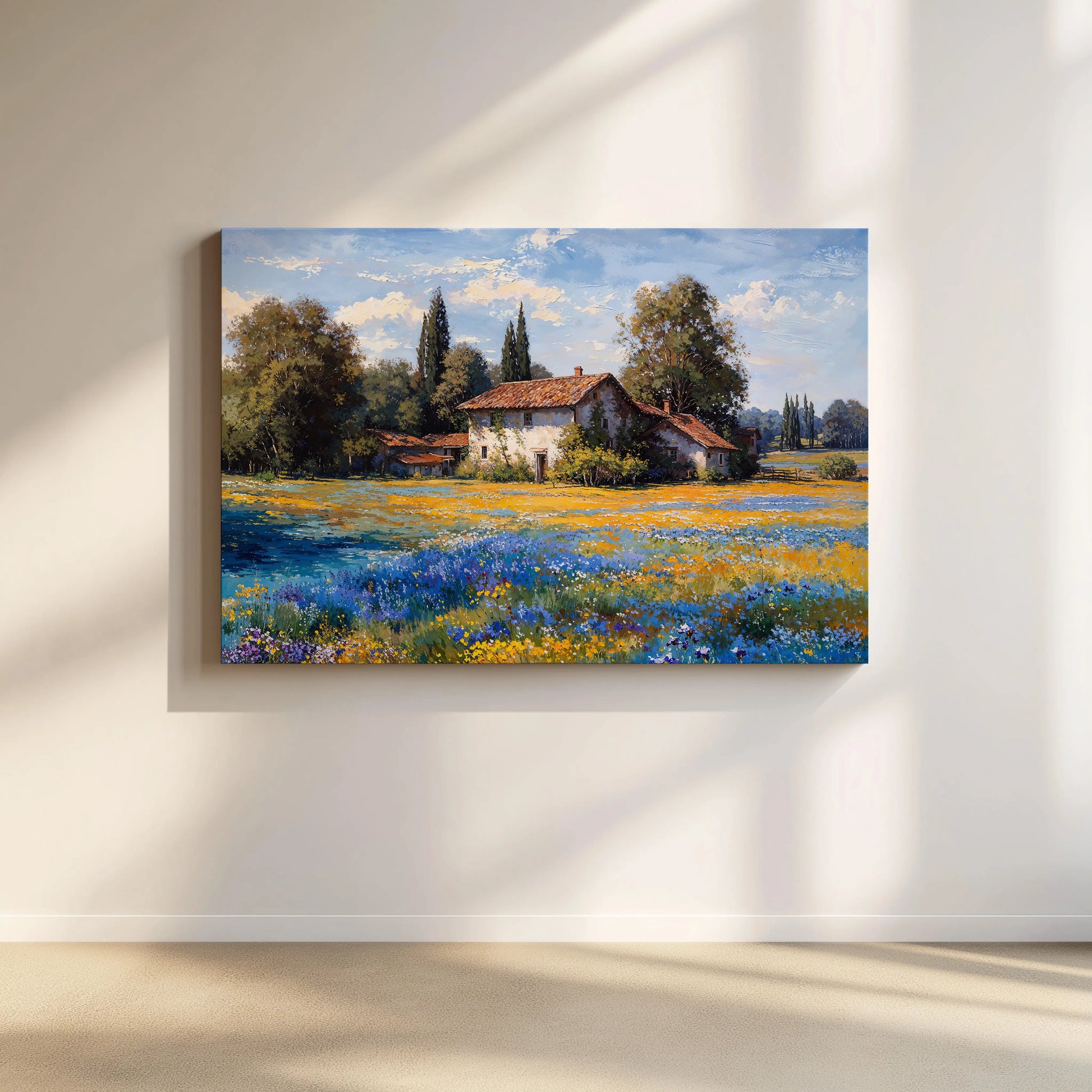 Prairie in Bloom 2 is a breathtaking canvas print that transports you to the sun-drenched hills of Tuscany. A rustic farmhouse with weathered clay-tile roofs sits nestled among rolling fields of vivid yellow and blue wildflowers.