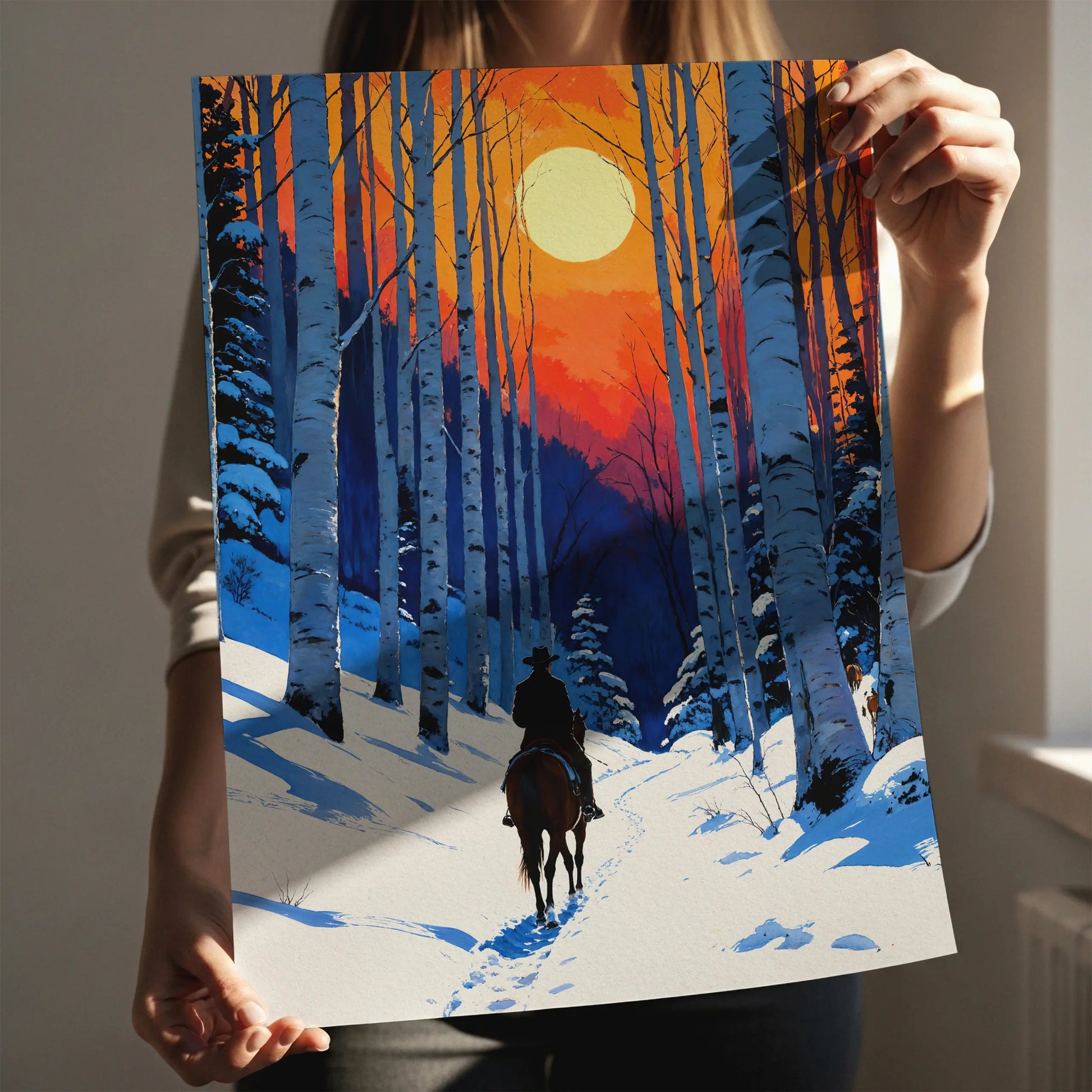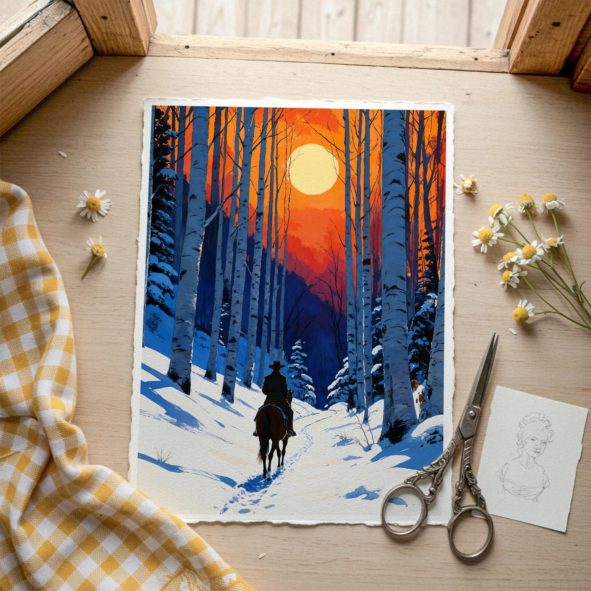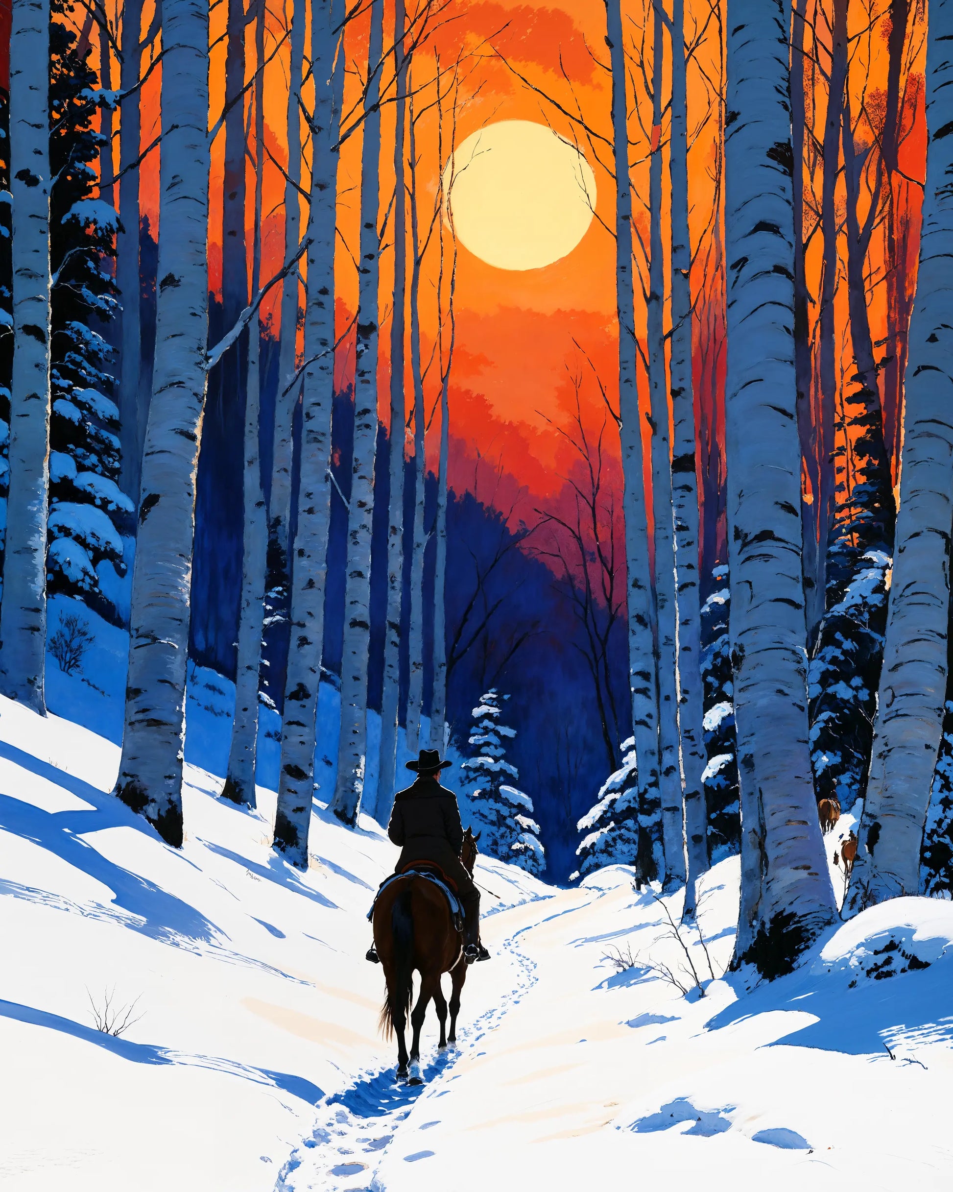 Prestige captures the power and solitude of a lone rider journeying through a snow-draped forest beneath a blazing sunset. The towering birch trees stand like sentinels, their pale trunks gleaming against the deep amber sky.