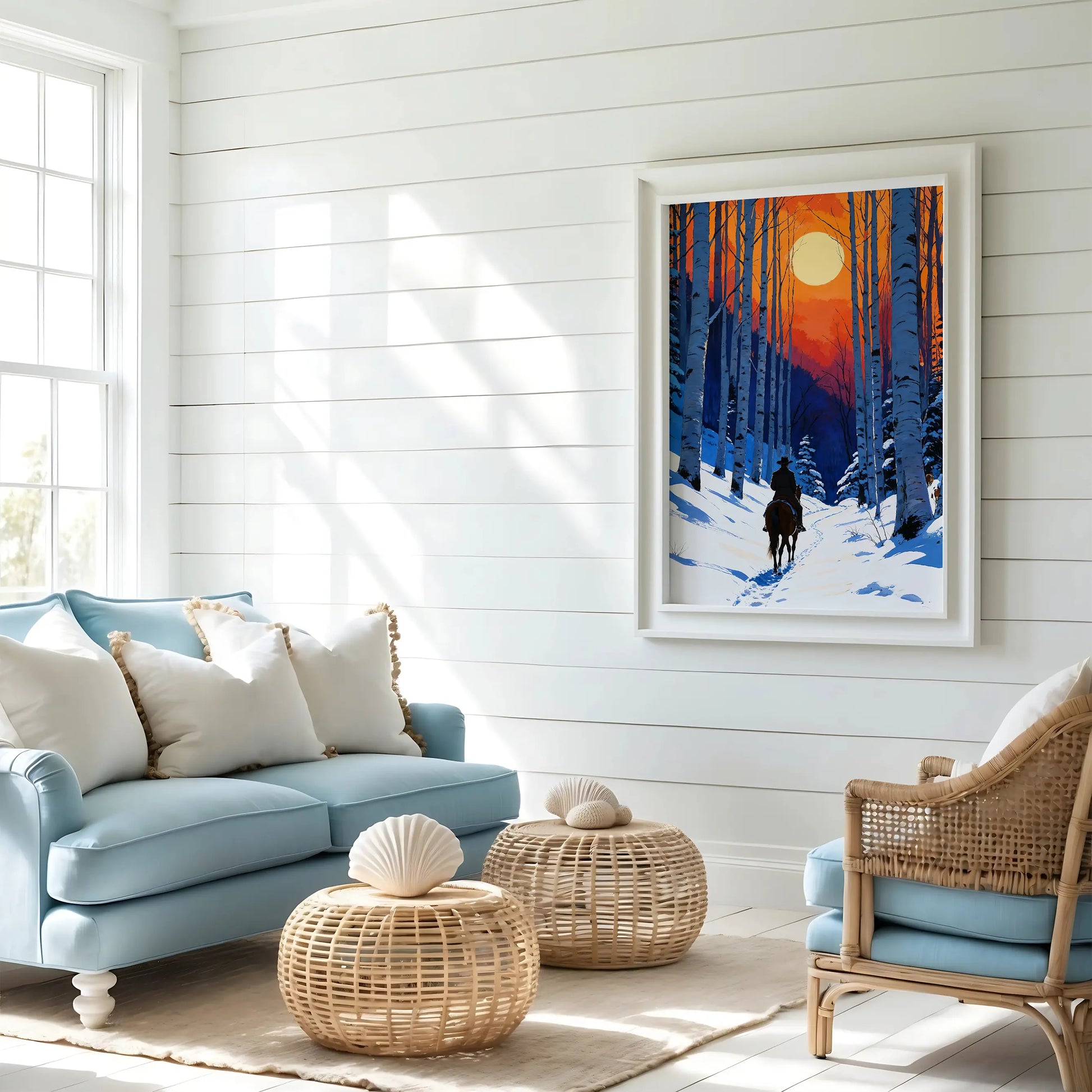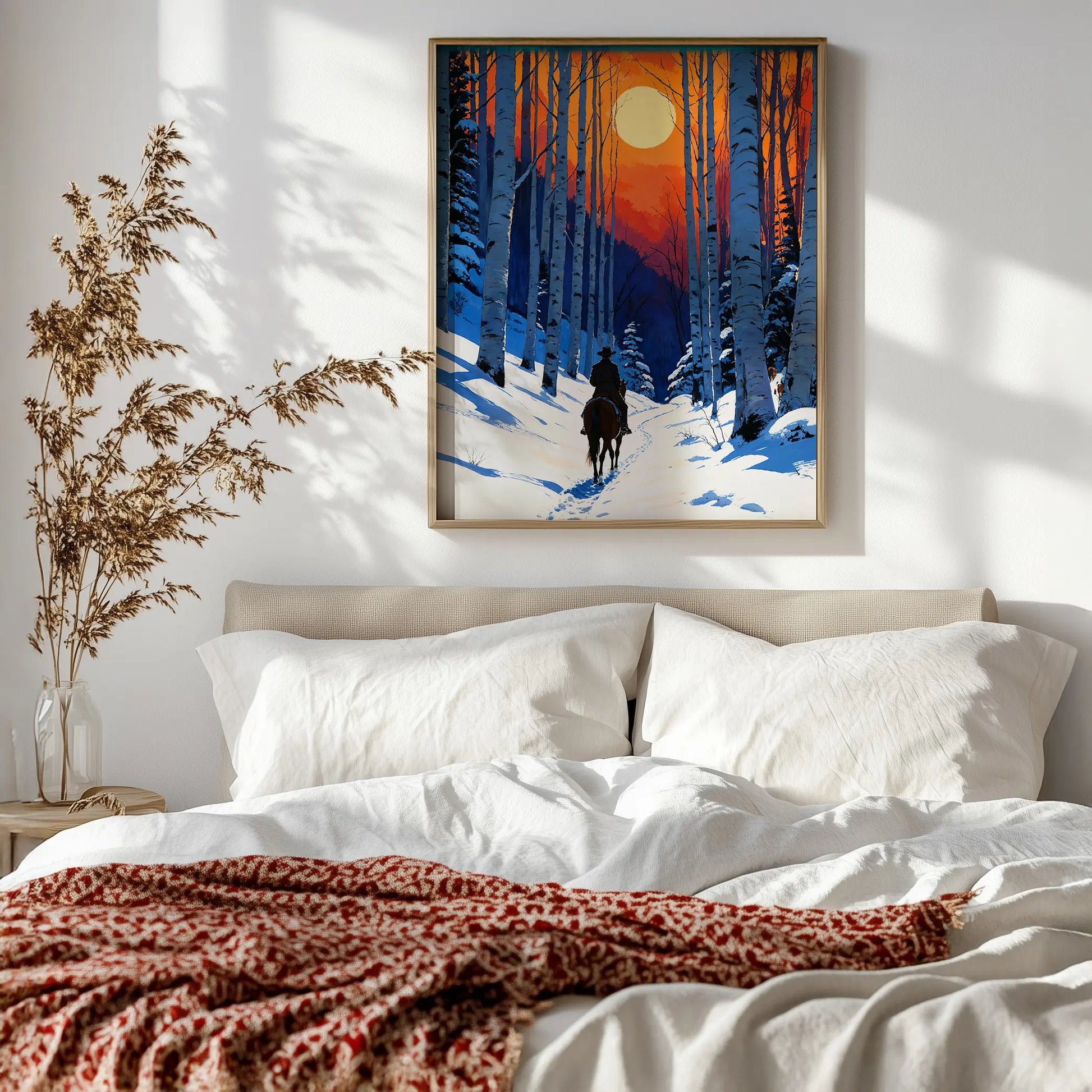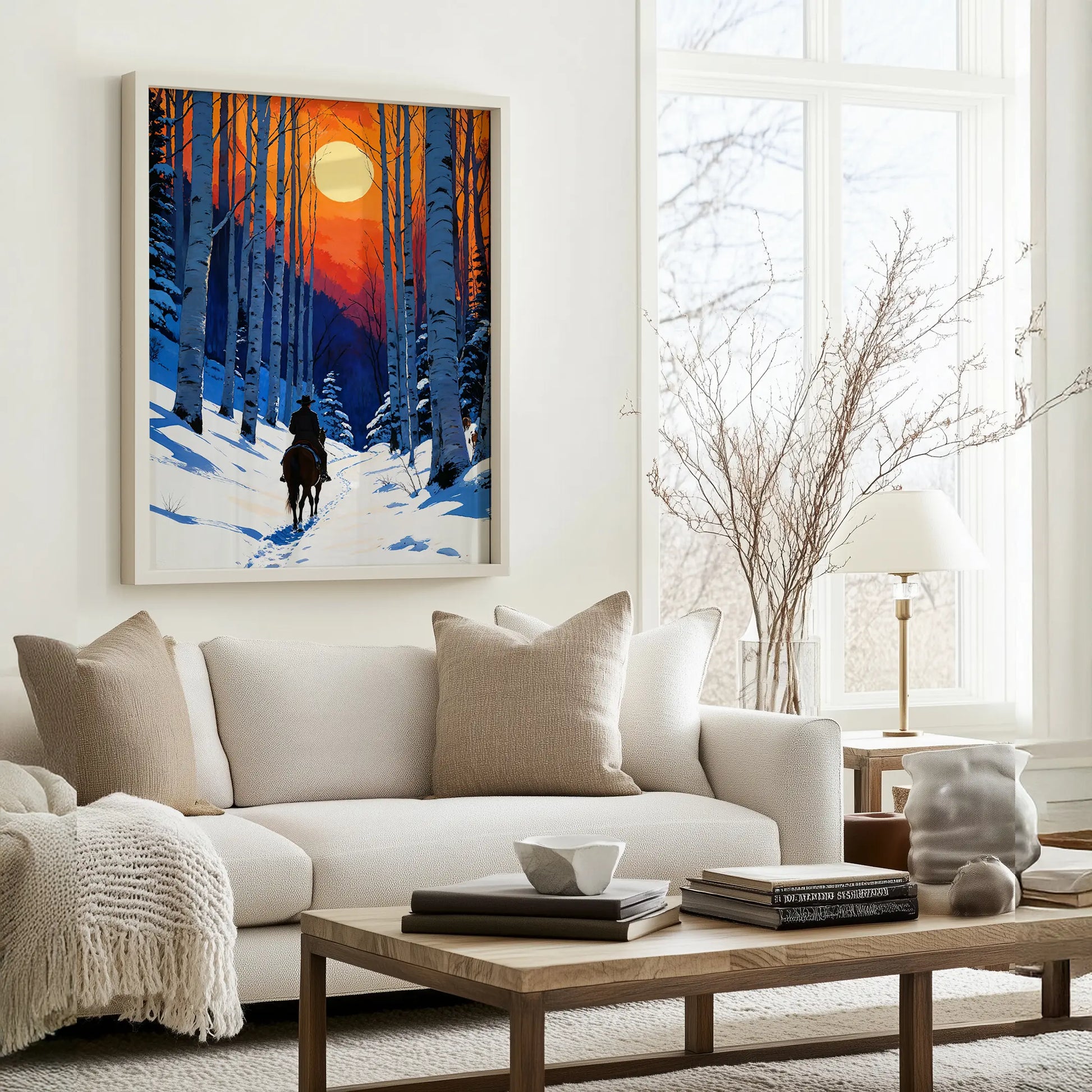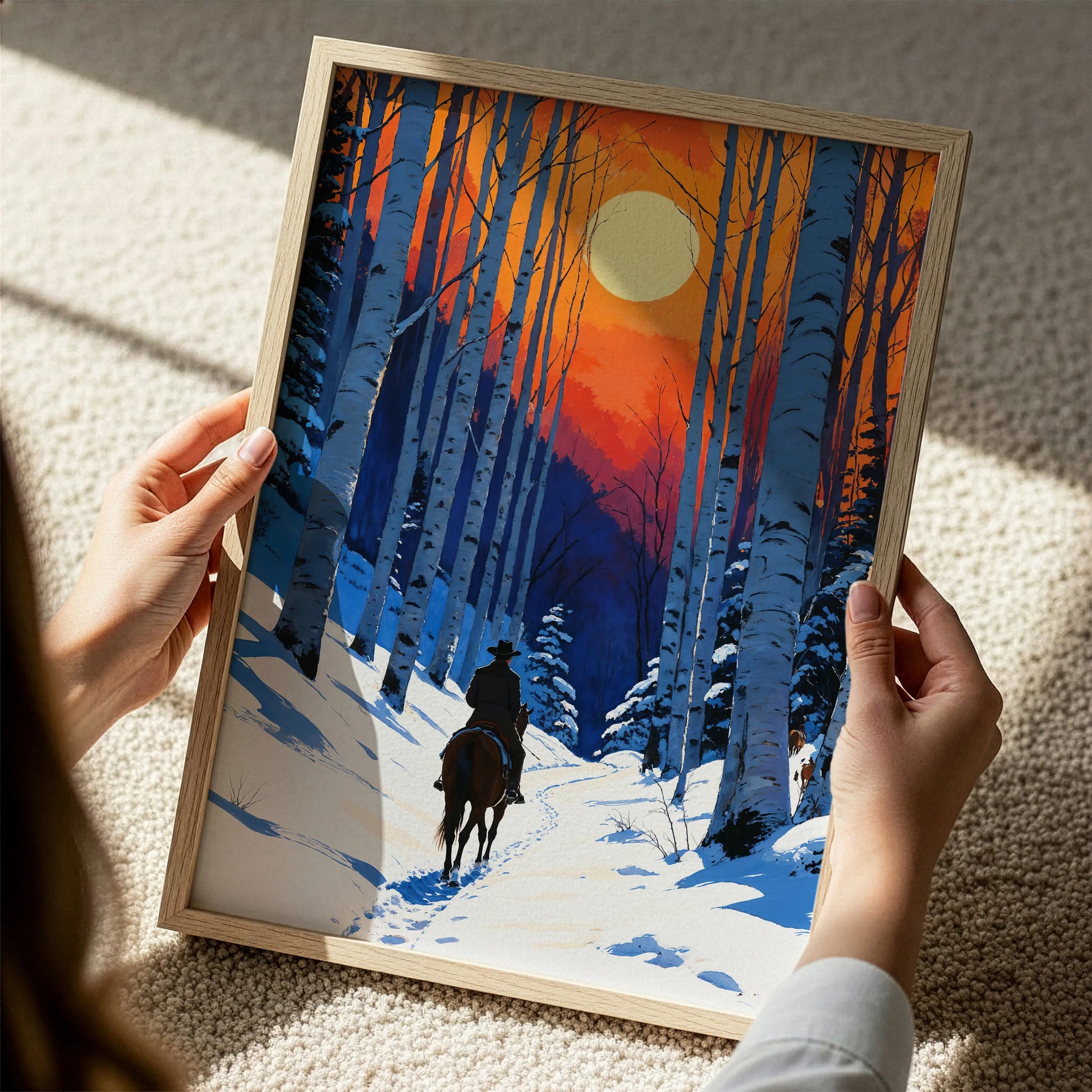 Prestige captures the power and solitude of a lone rider journeying through a snow-draped forest beneath a blazing sunset. The towering birch trees stand like sentinels, their pale trunks gleaming against the deep amber sky.