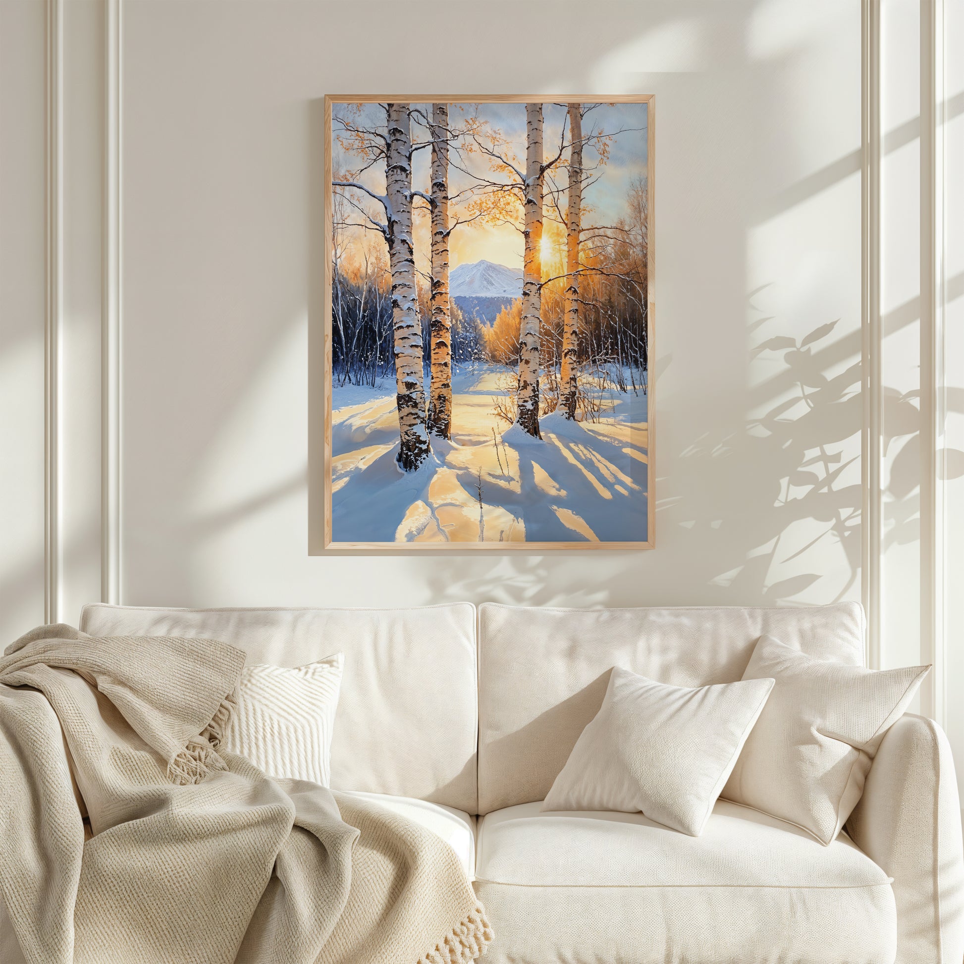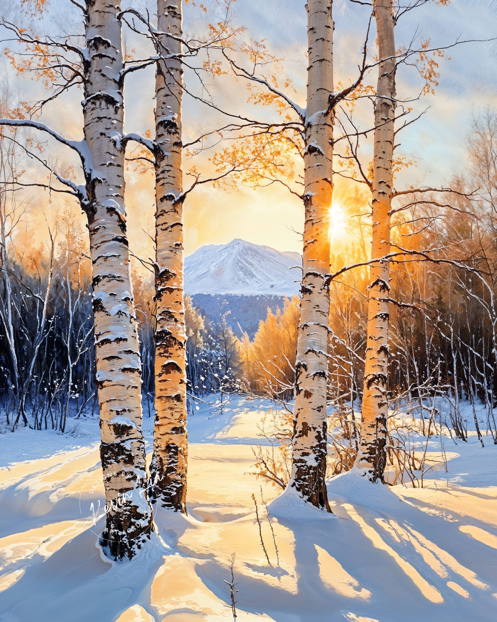 Rays of Light suspends the viewer in the golden breath of winter—where warmth presses through frost, and the forest stands as both frame and witness. Tall birch trees rise like quiet sentinels, their bark marked in textured contrast, casting elongated shadows across snow lit with tonal gradation and subtle chromatic layering.