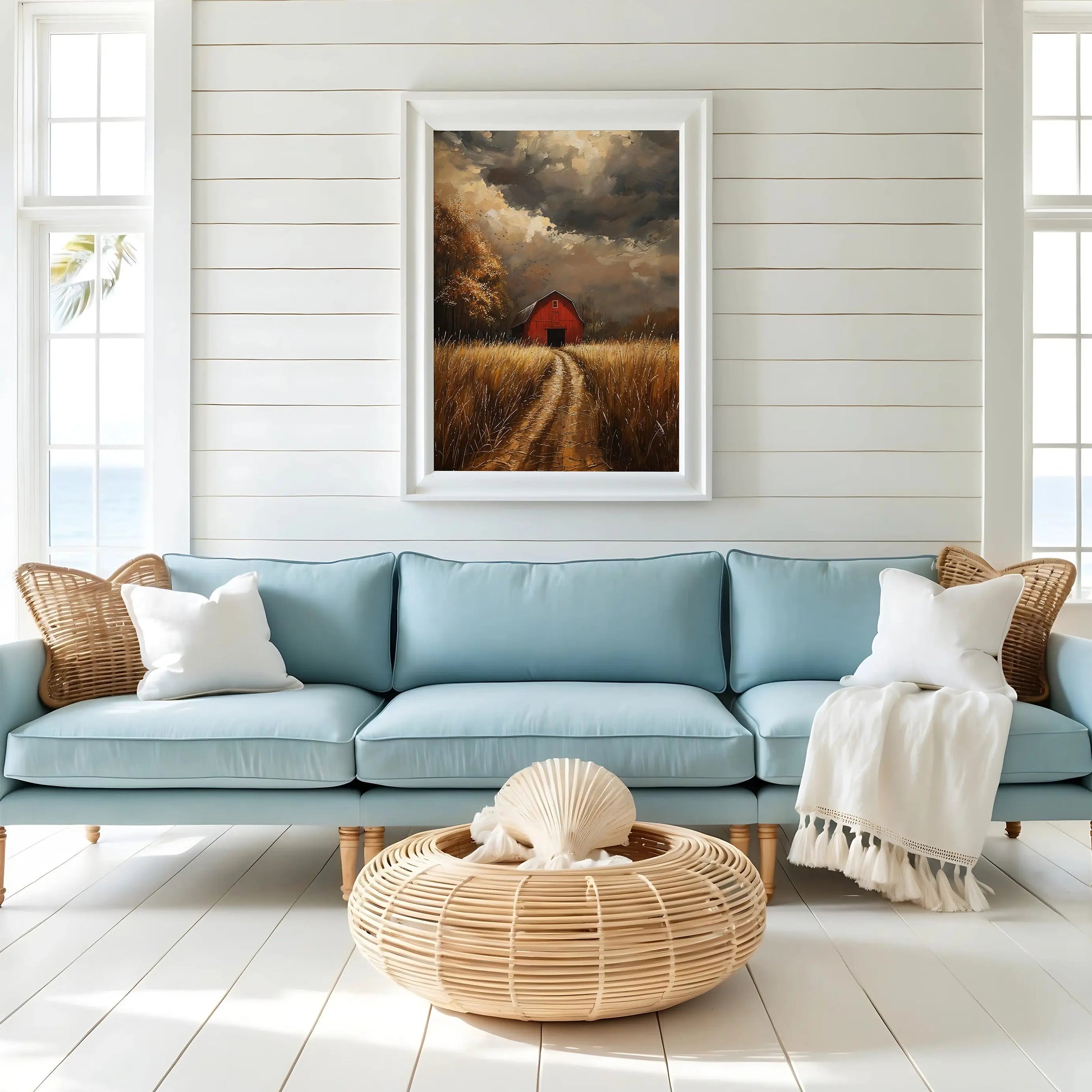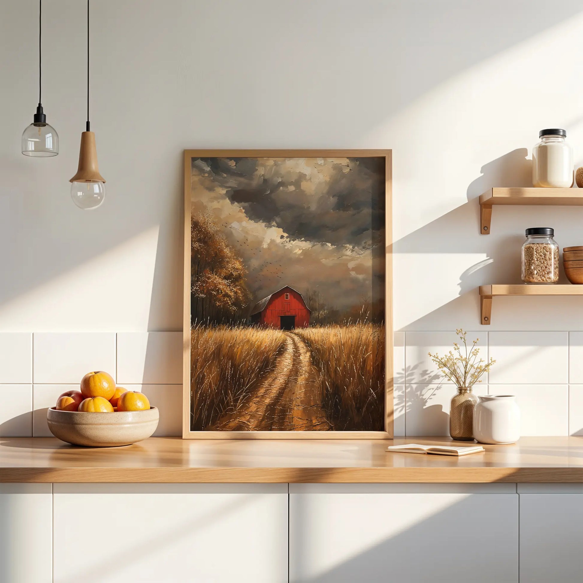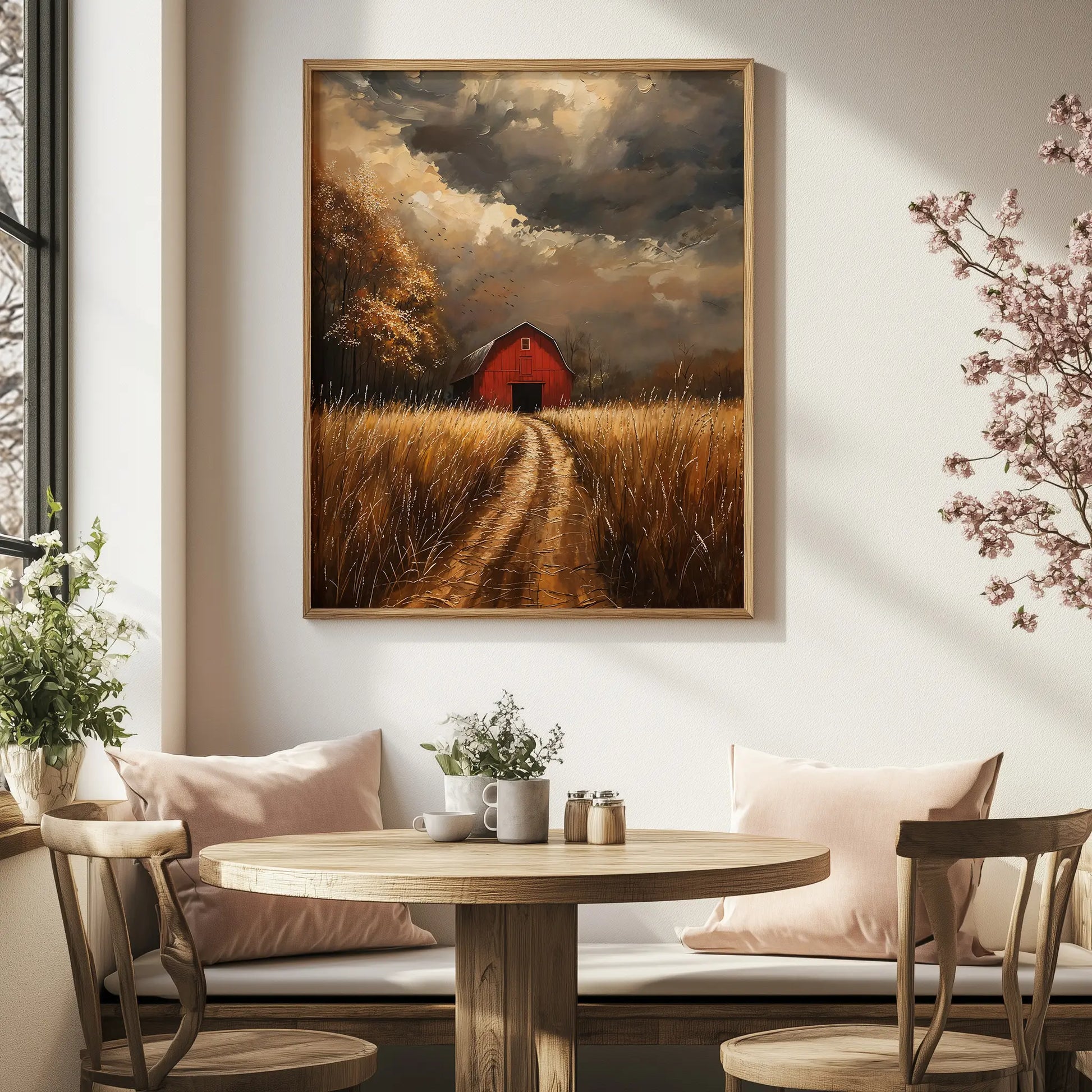 In Red Barn, the scene feels grounded and contemplative, offering steadiness without weight. Layered surfaces and restrained texture give the work presence, allowing it to settle into a living room, bring warmth to a bedroom, or lend focus to a study.