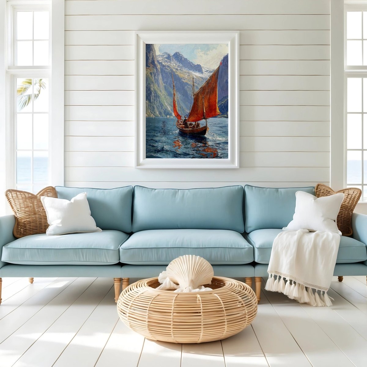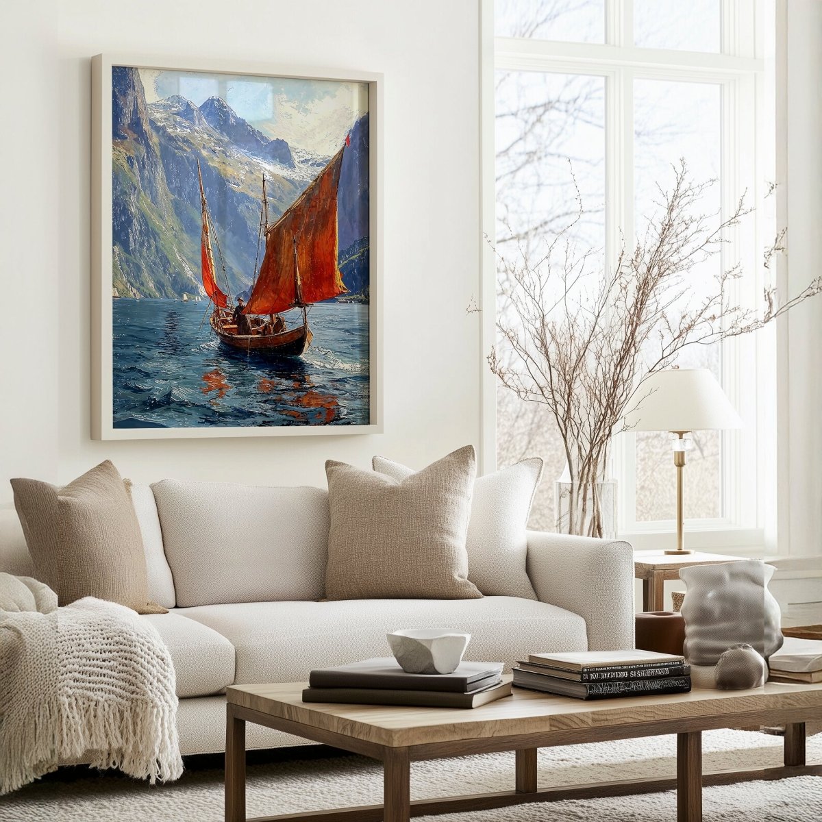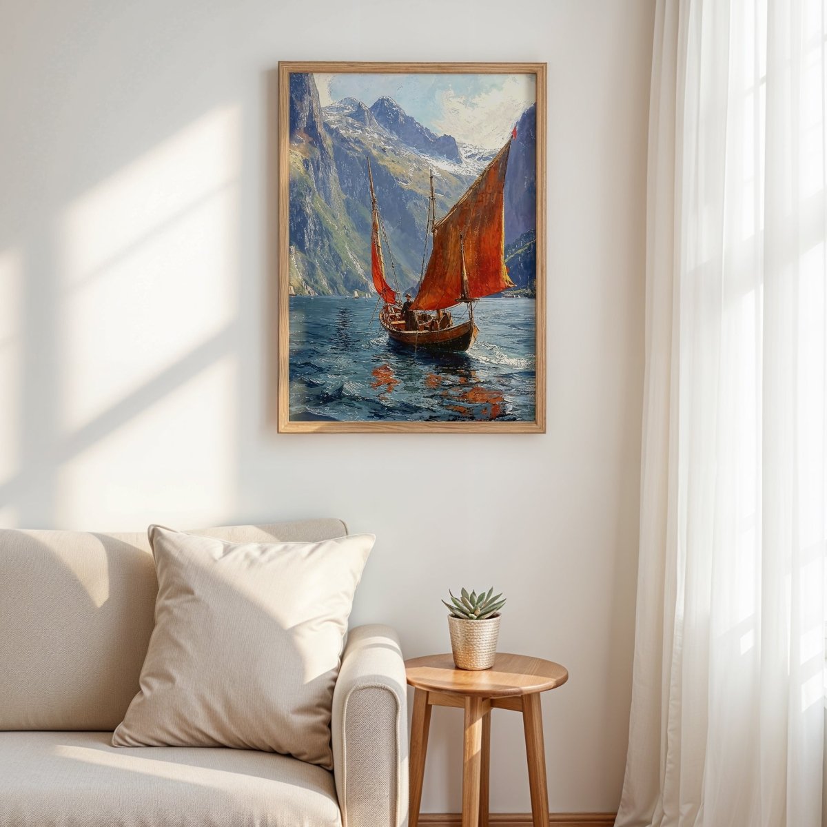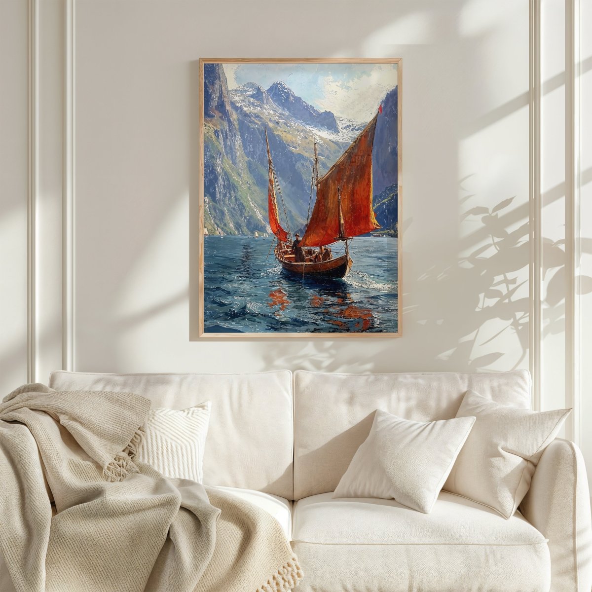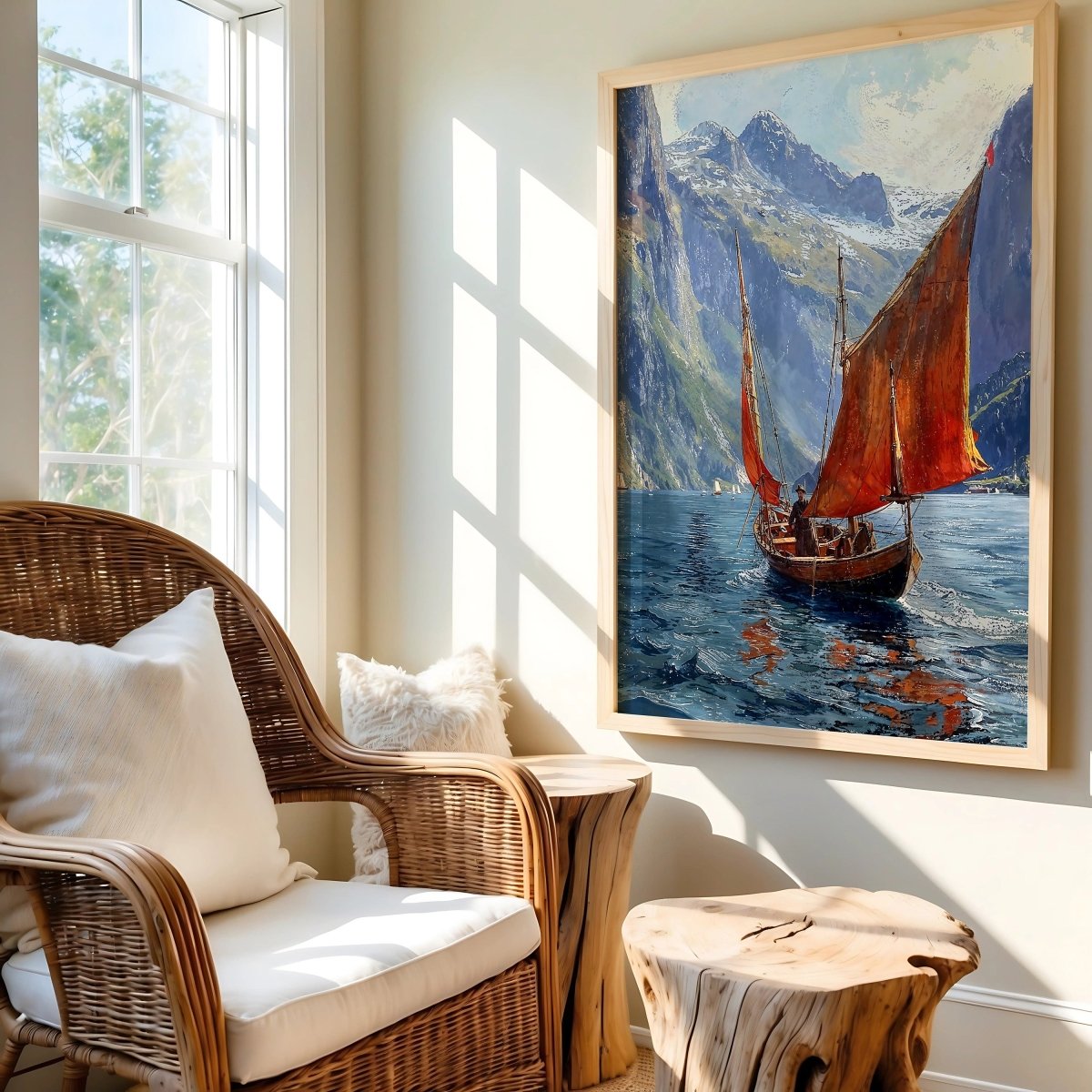 Crimson Voyage sails into silence, where red canvas carves its path through the cool serenity of fjord waters. Towering cliffs and distant snowcaps stand sentinel, yet the lone vessel—modest in form, immense in presence—moves with quiet intent; reflection dances beneath, echoing the sail’s fiery arc.