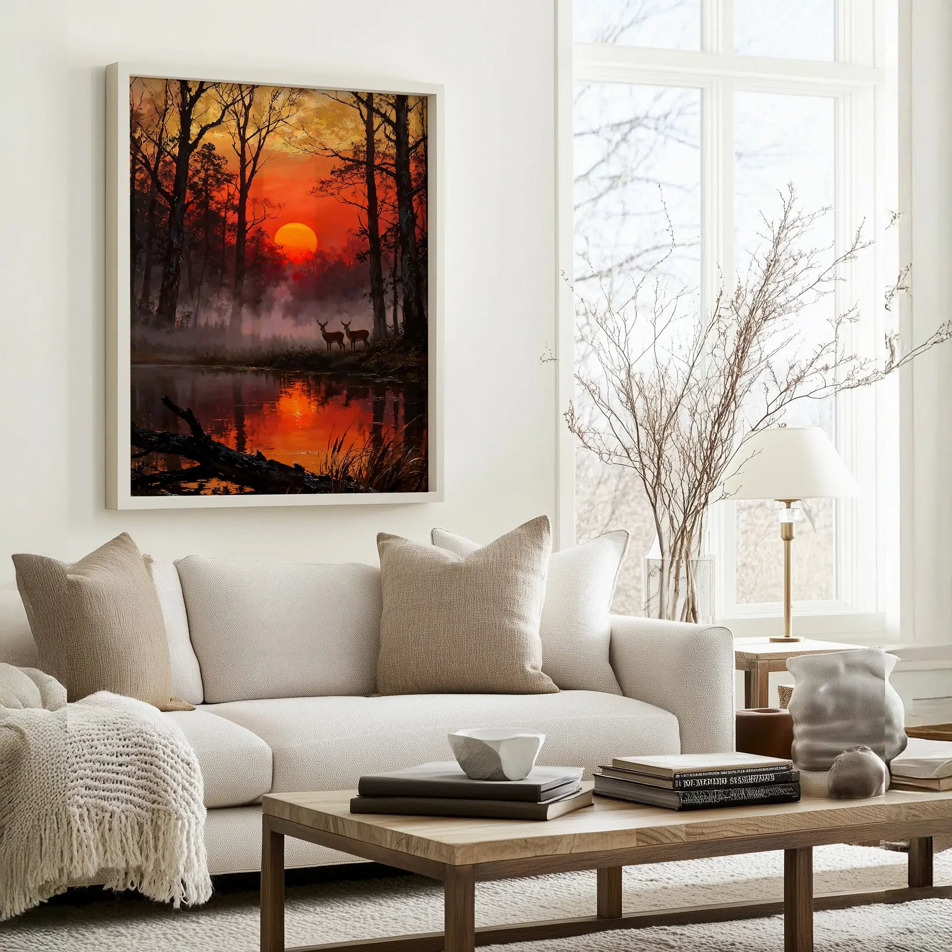 A deep red sun sinks behind tall trees, flooding a misted forest with fire and shadow. Still water mirrors the glow as fog drifts low, softening trunks and branches. Two deer pause at the bank, held in the quiet tension of dusk and reflection. The air feels ancient and hushed.