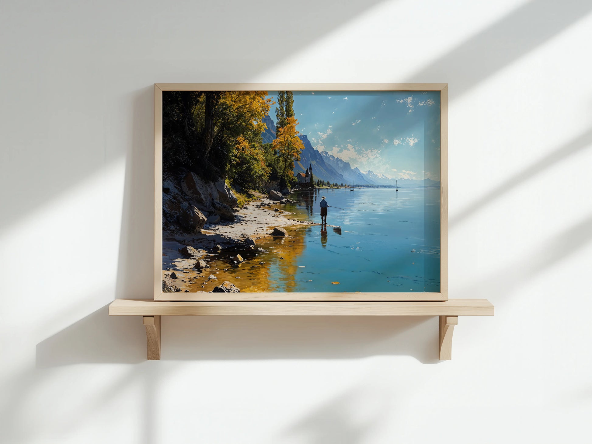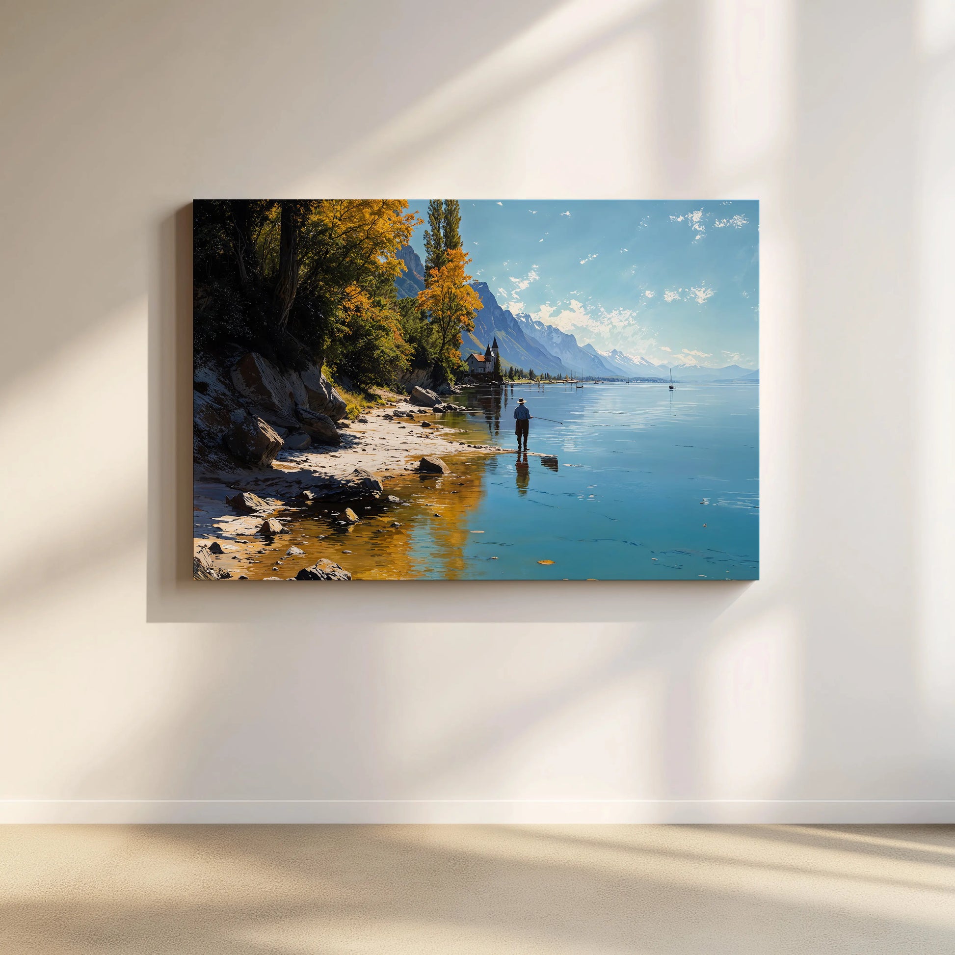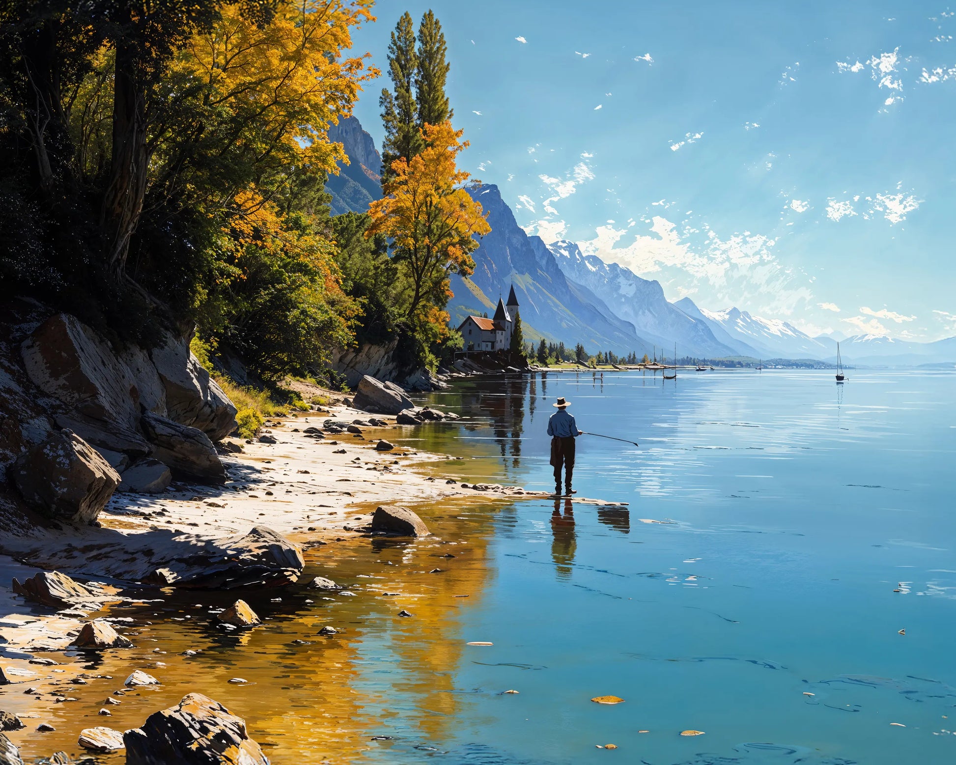 Reflections paints a calm lakeside moment — a lone fisherman casts into crystal-clear waters surrounded by majestic mountains and golden autumn trees. The soft shoreline and distant chapel complete this peaceful alpine scene.