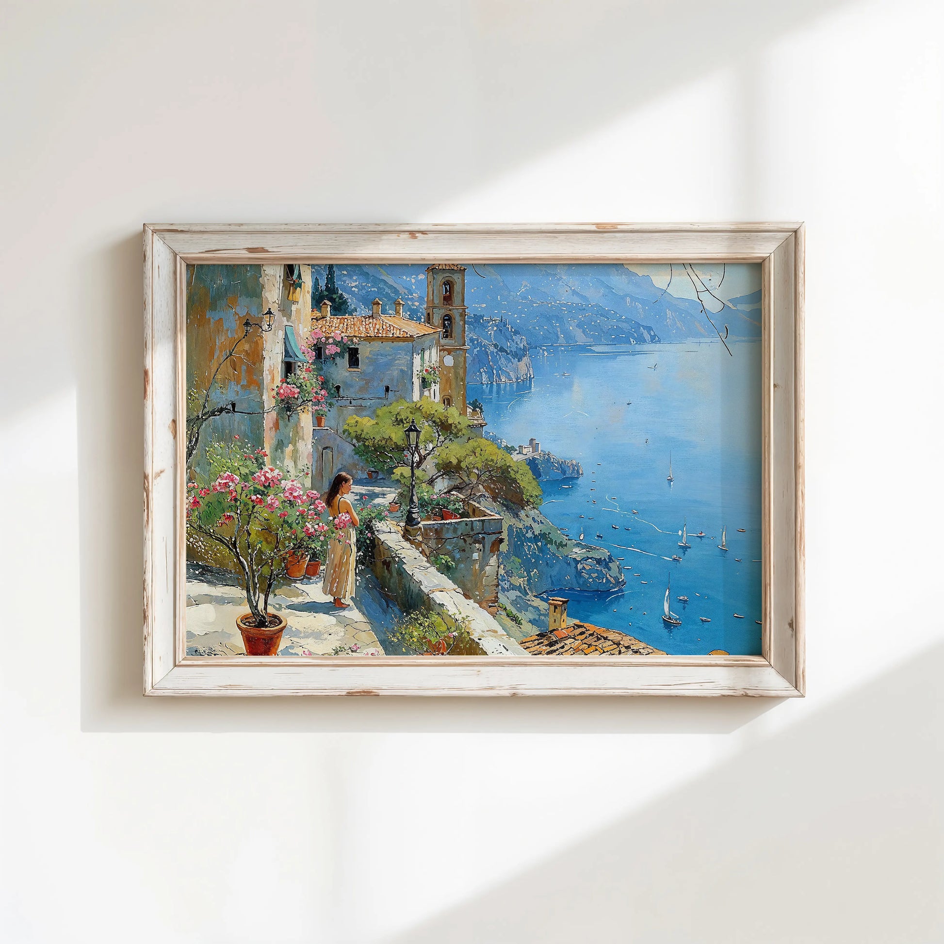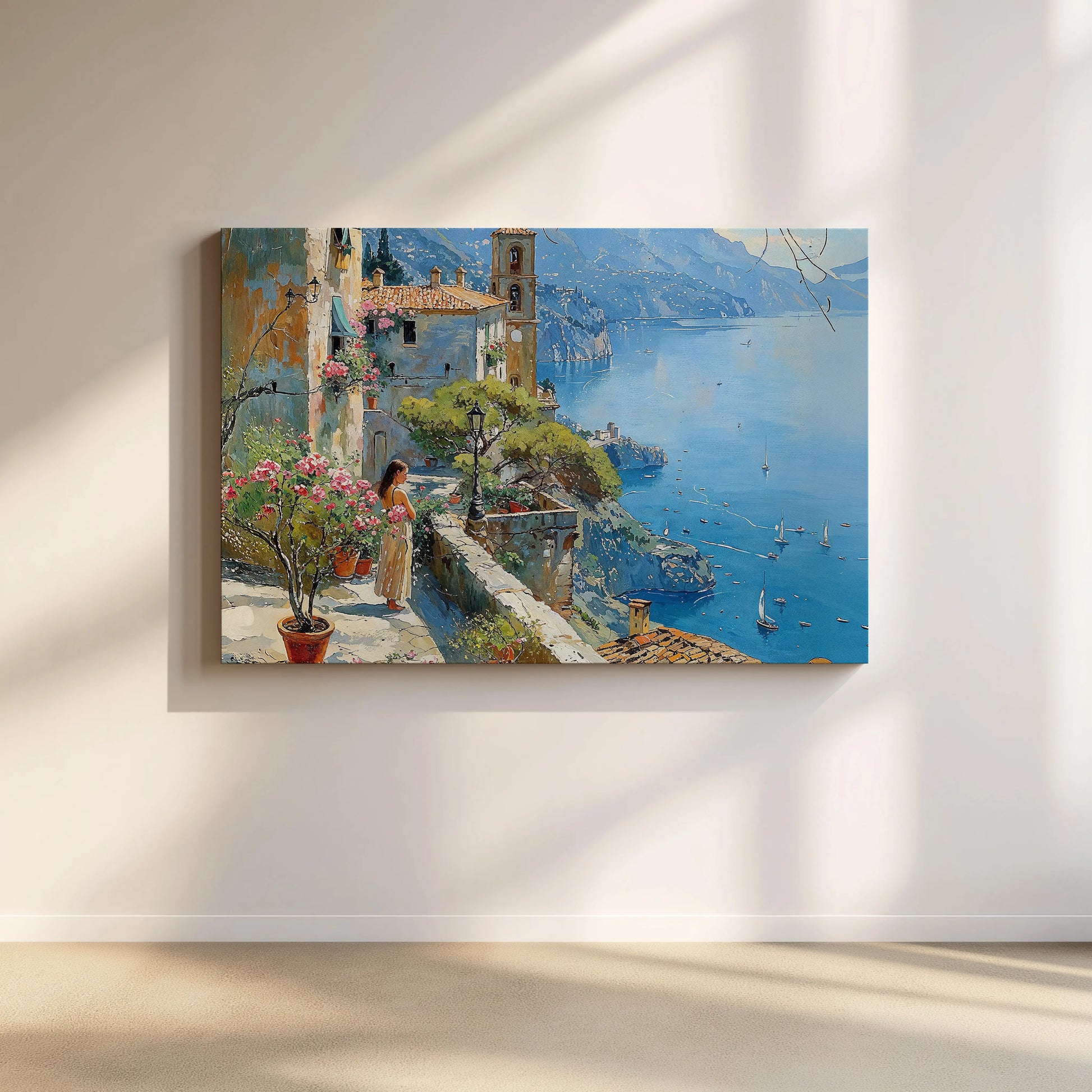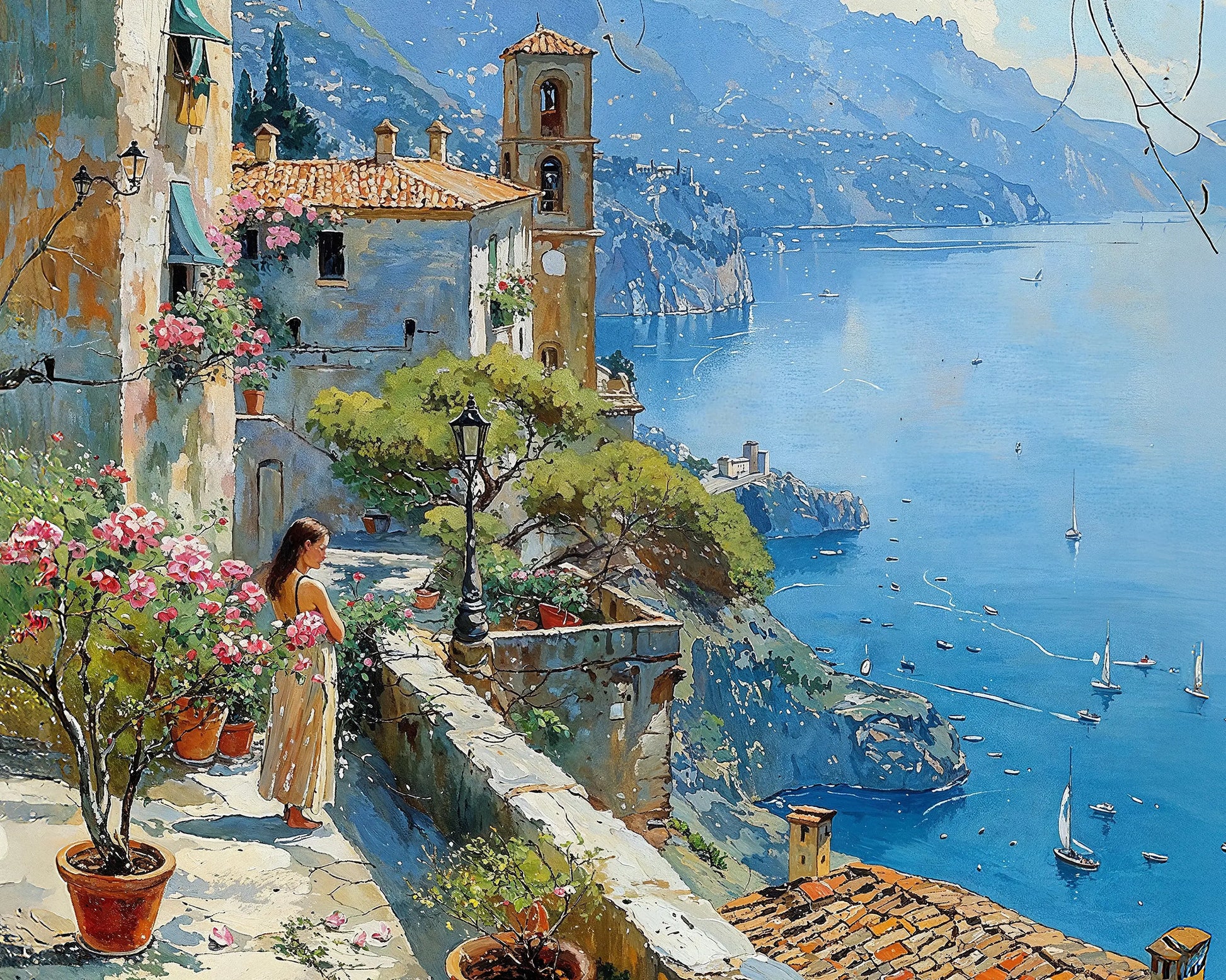 Sometimes beauty stirs the heart in a way that doesn’t quite settle. Restless catches that feeling — a quiet girl standing above the sunlit coast, the sea glittering with boats drifting toward nowhere in particular. Flowers lean into the light, the old walls hold their stories, and the breeze carries the promise of someplace just beyond reach.