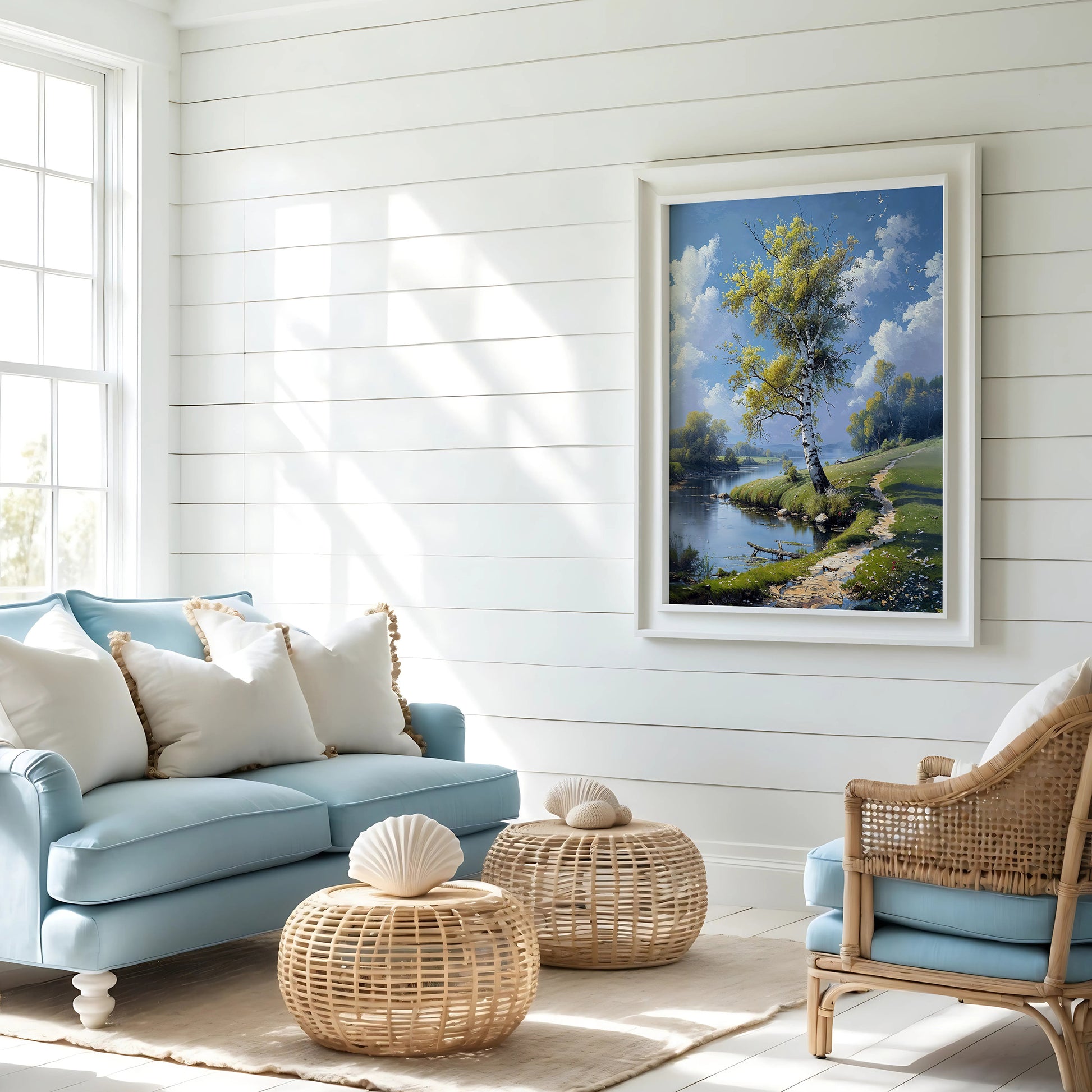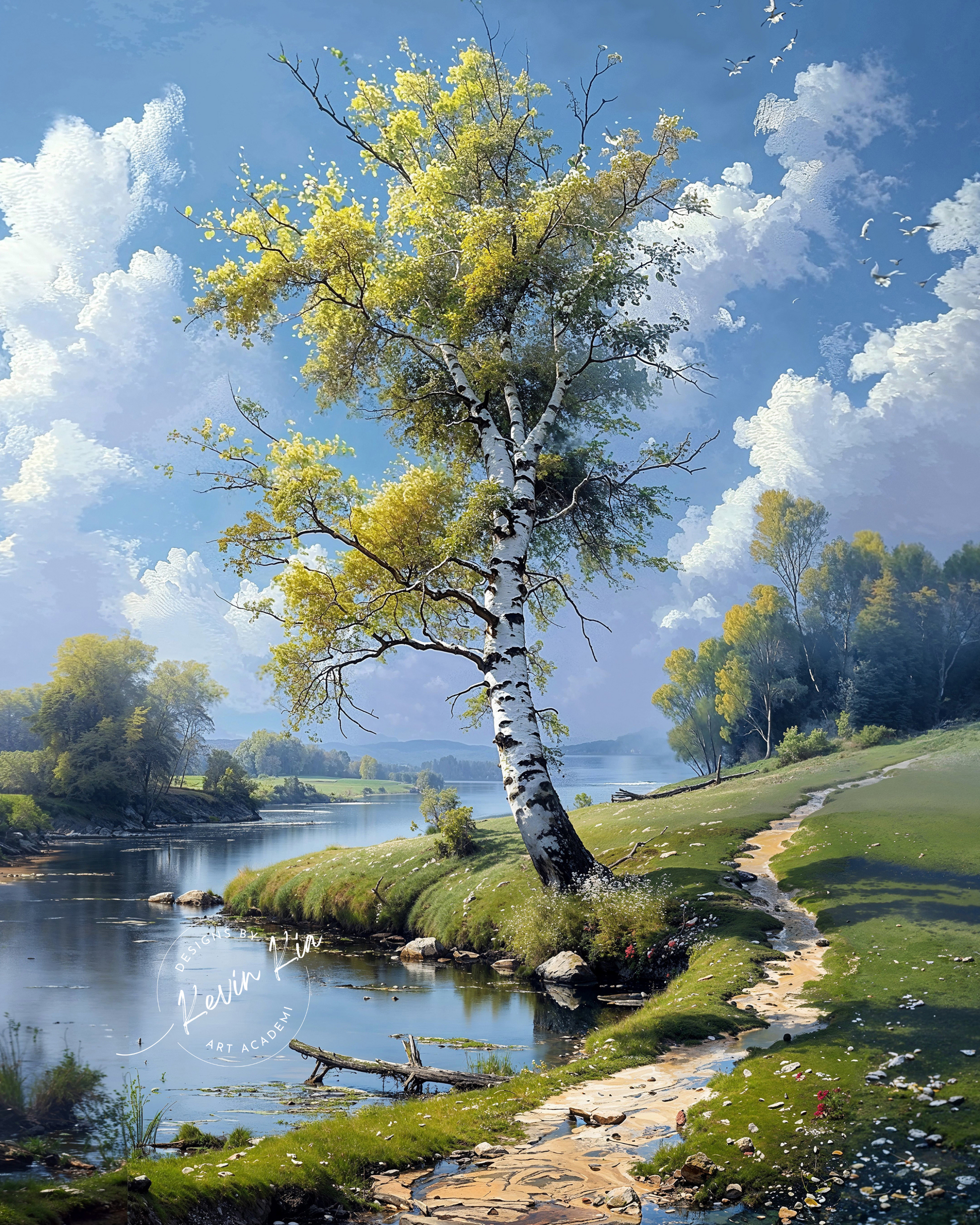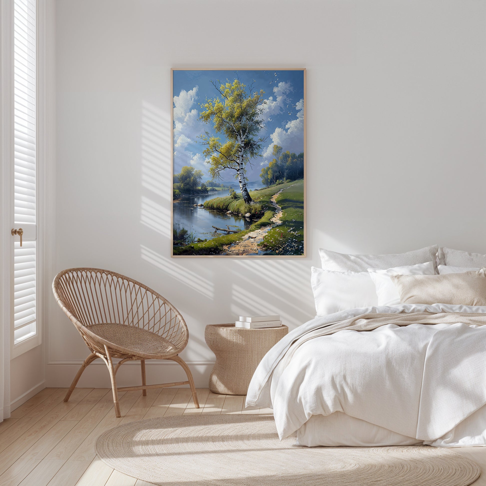 Riverbend invites stillness. A single birch, luminous against the calm, leans gracefully toward the mirrored water, its pale bark echoing the light scattered across the sky and stream. The landscape stretches gently into the distance, carrying breath and quiet along its meandering curve.