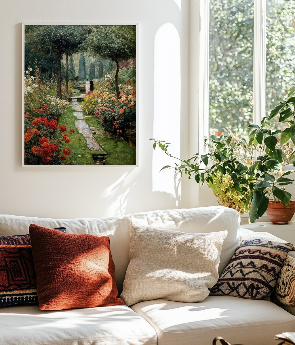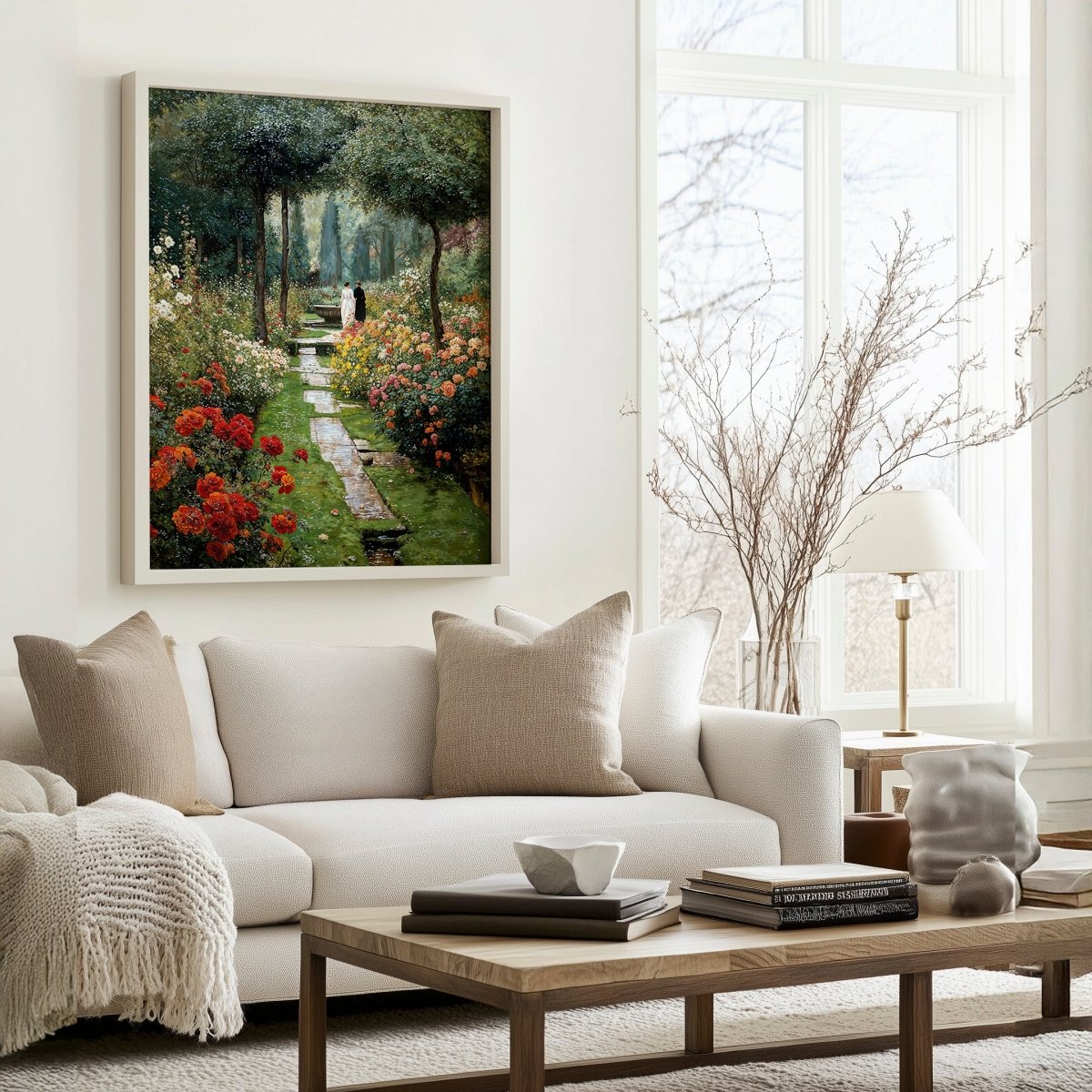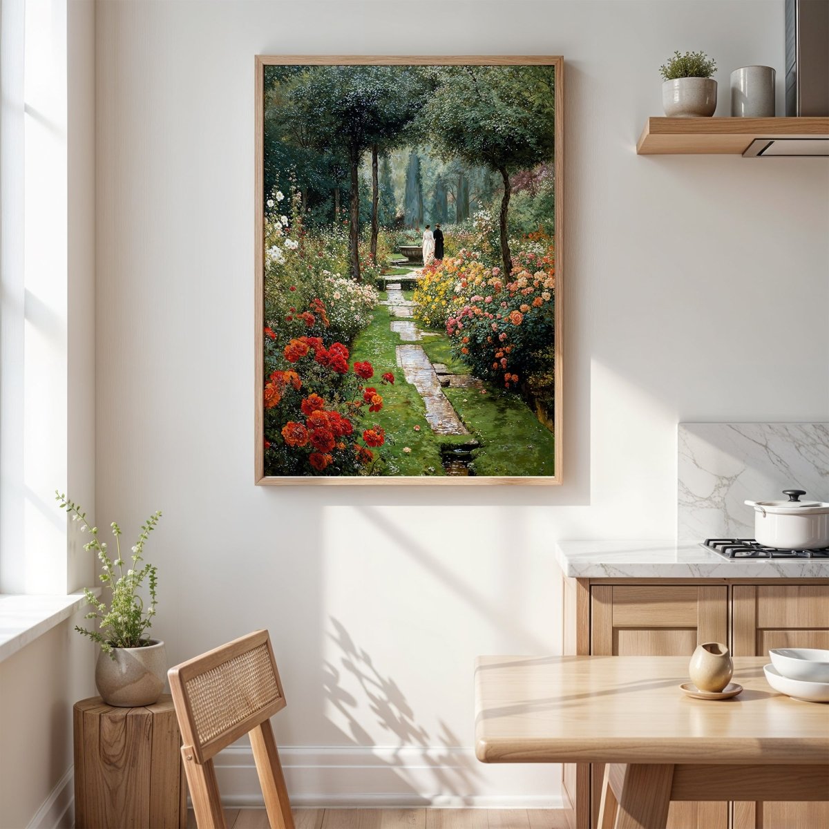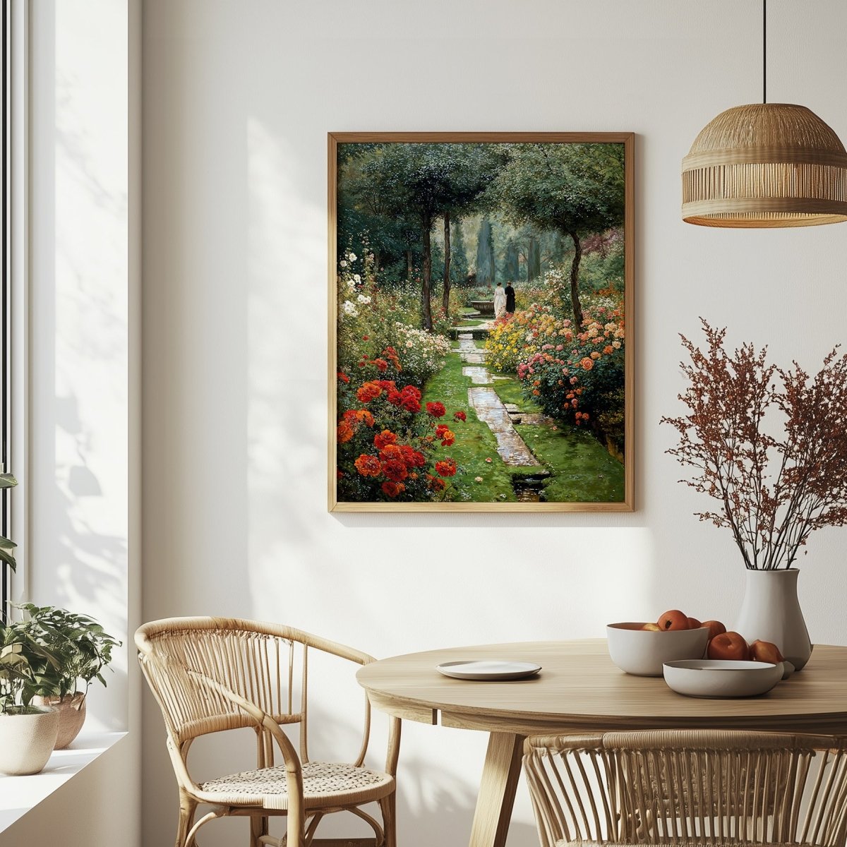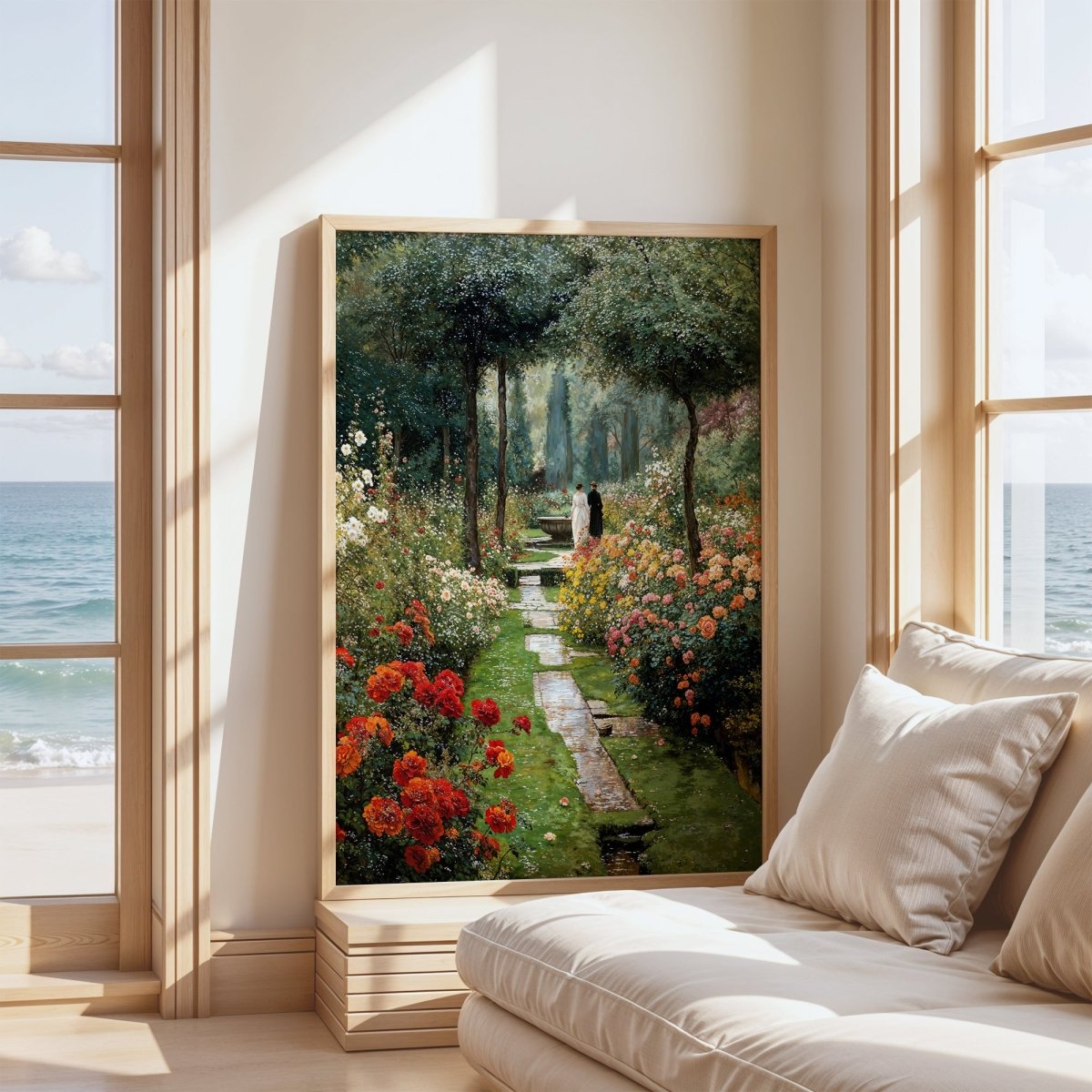 Love in Bloom captures a quiet intimacy—two figures walking beneath twilight, surrounded by roses and golden stone. It favors atmosphere over story, evoking love not through words but through feeling.