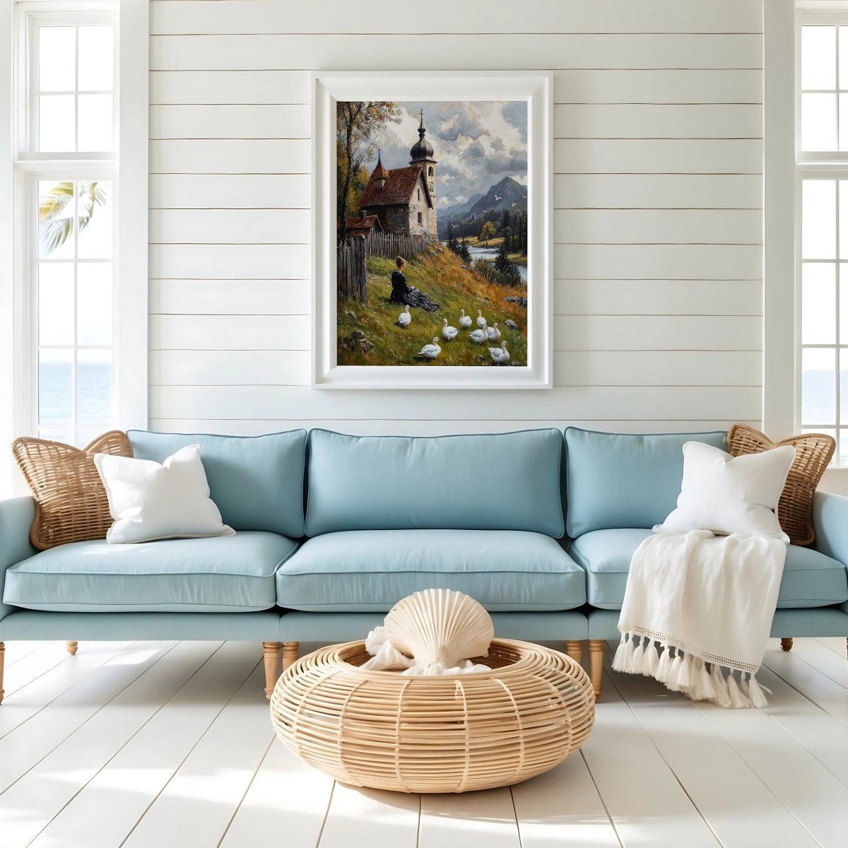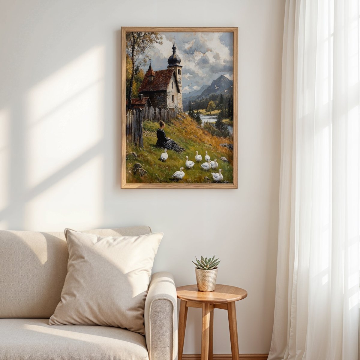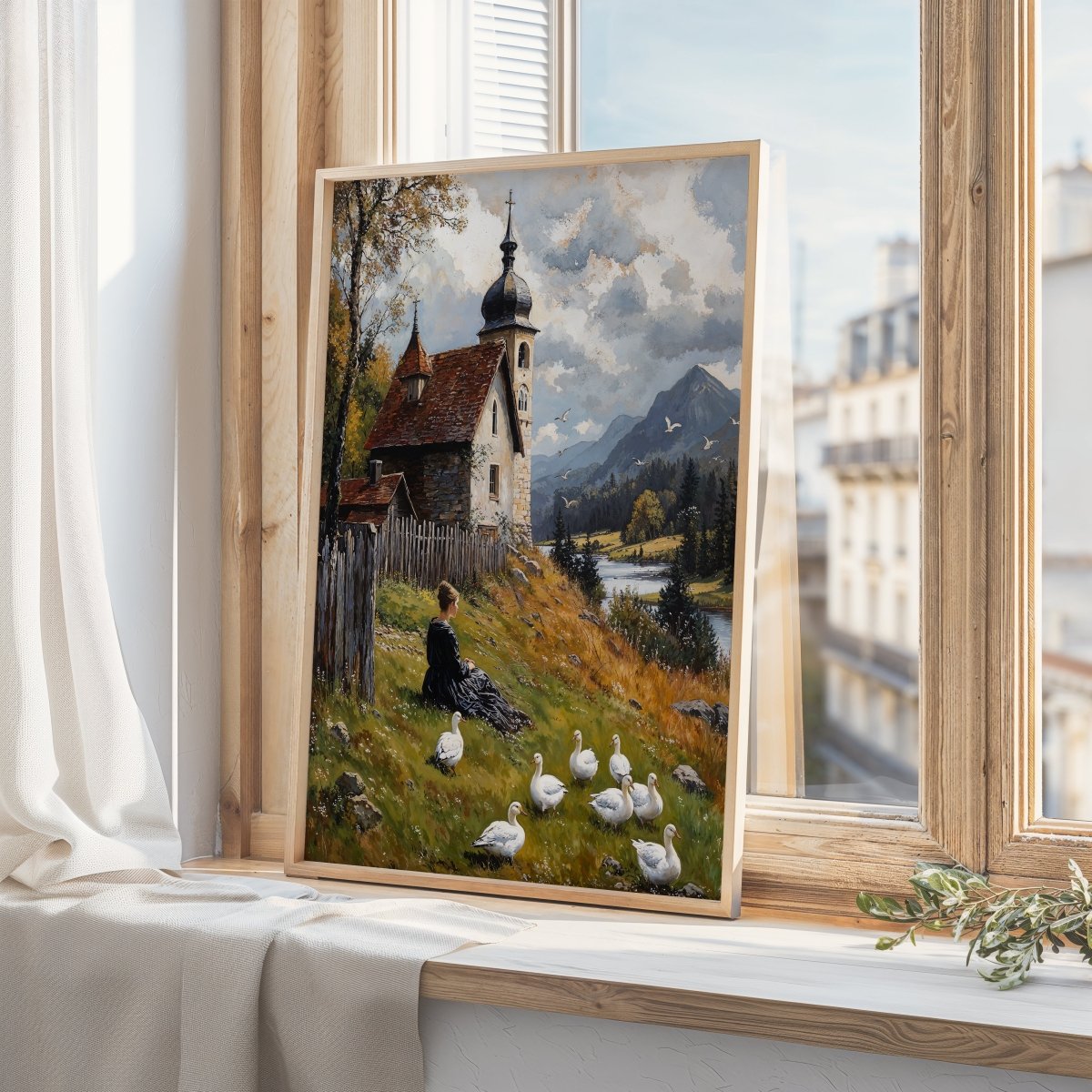 Sacred Hills rests on a golden slope, where a woman in black sits near a weathered chapel, surrounded by quiet geese. Beneath the bell tower, the earth breathes and the mountains whisper through a soft sky.