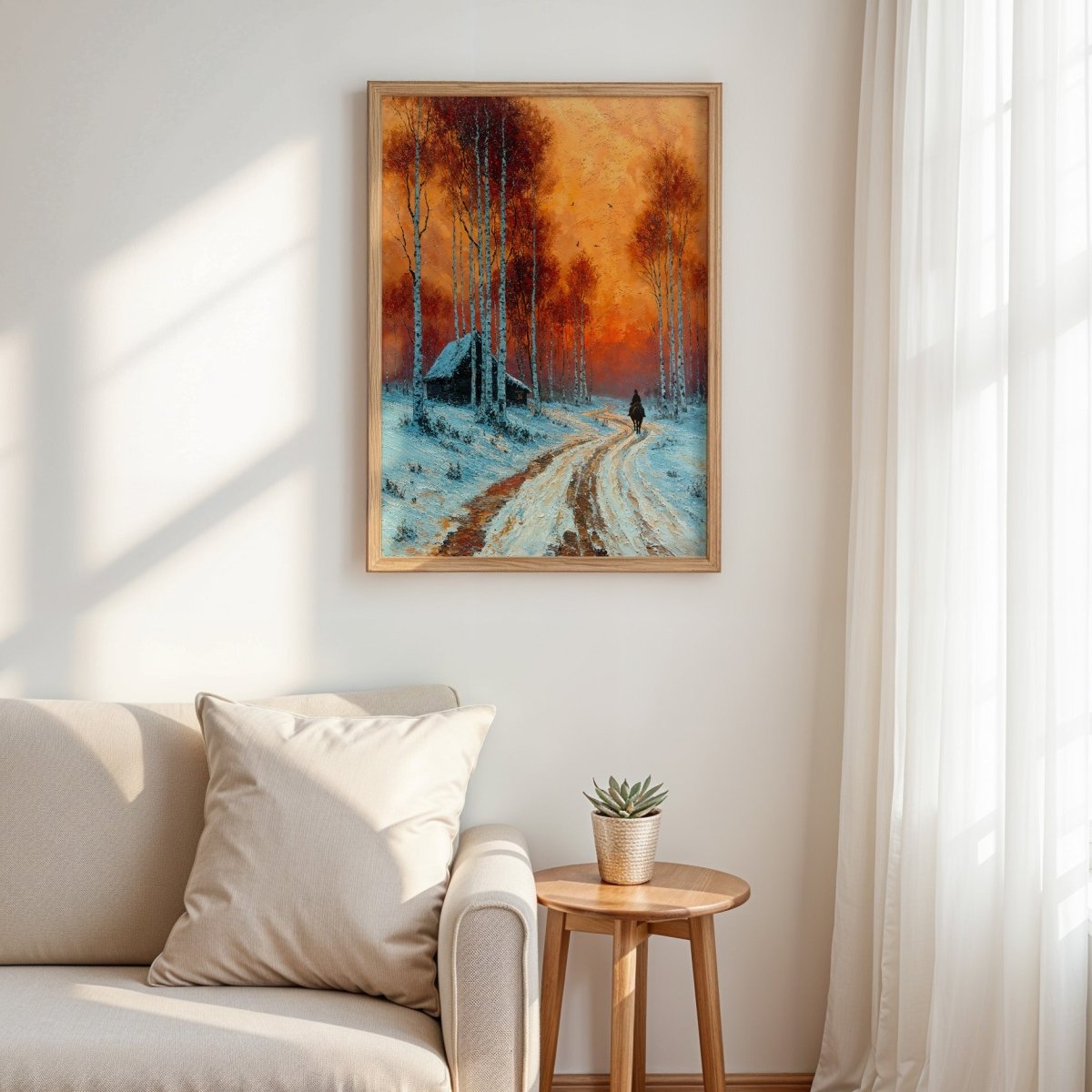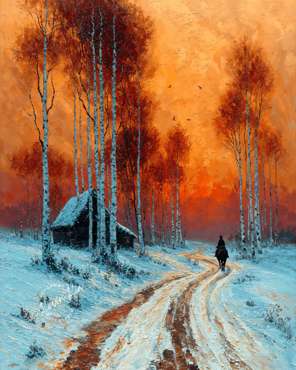 In Scarlet, a lone horseman follows a winding snow-covered path, the crisp air tinged with the glow of a blazing crimson sunset. Tall birch trees, their pale trunks etched in sharp relief, rise like guardians along the road, their rust-red crowns ablaze in the dying light.
