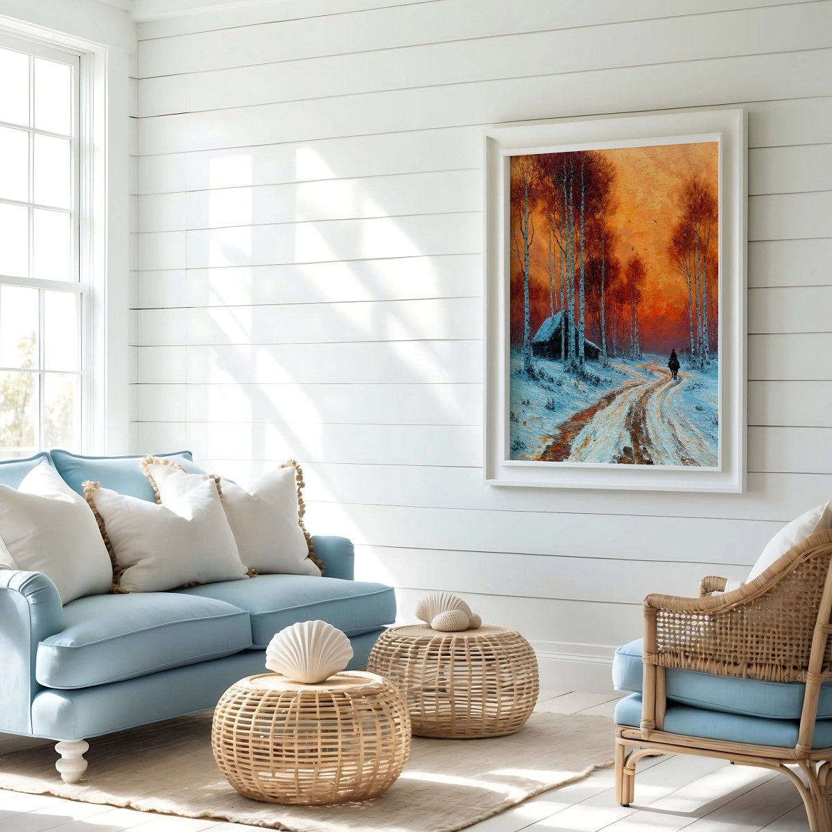 Nestled at the edge of the woods, a weathered cabin stands in quiet shadow, a place of mystery and shelter amidst the vast winter expanse. The sky burns with layered hues of amber and scarlet, its intensity mirrored in the warm undertones of the snowy ground.