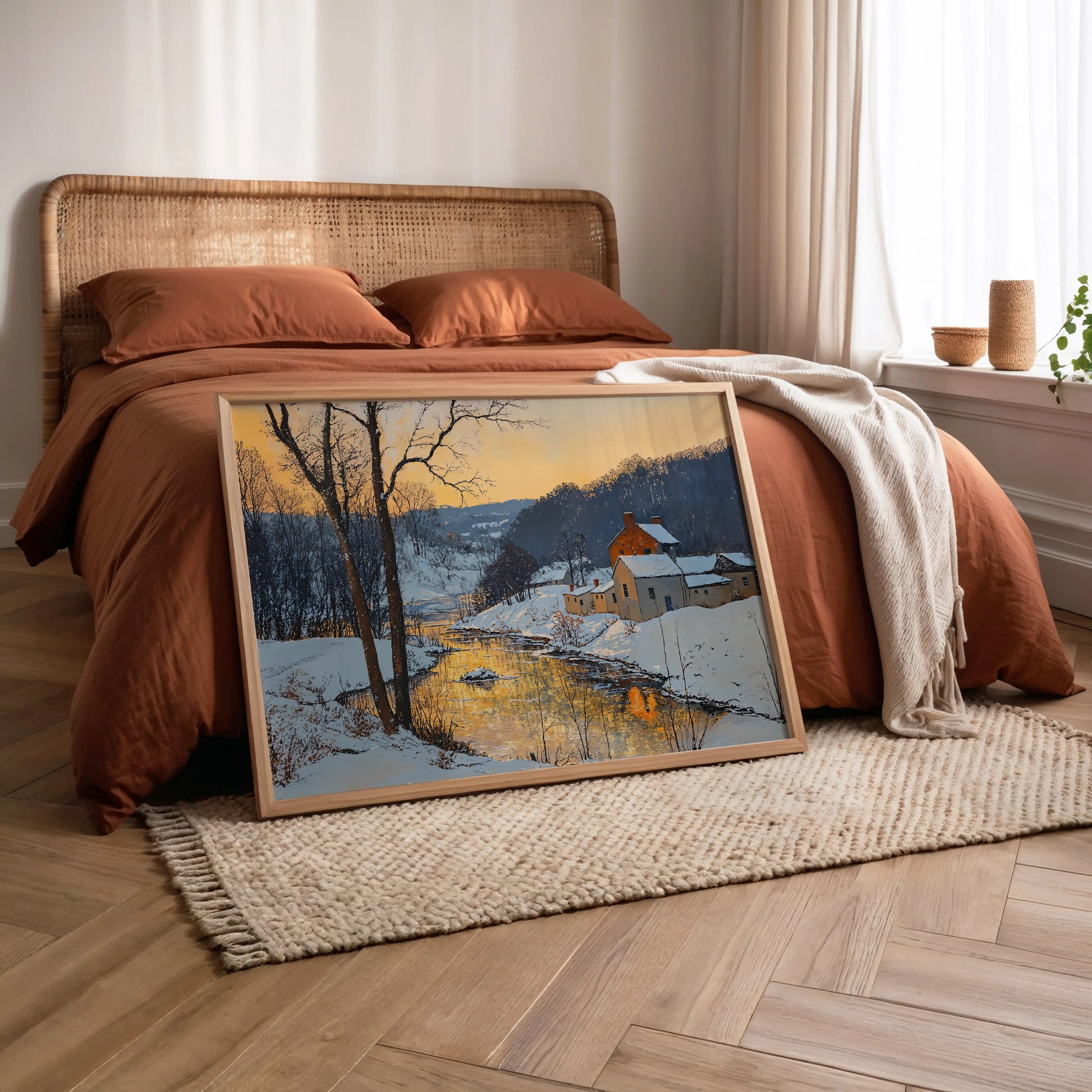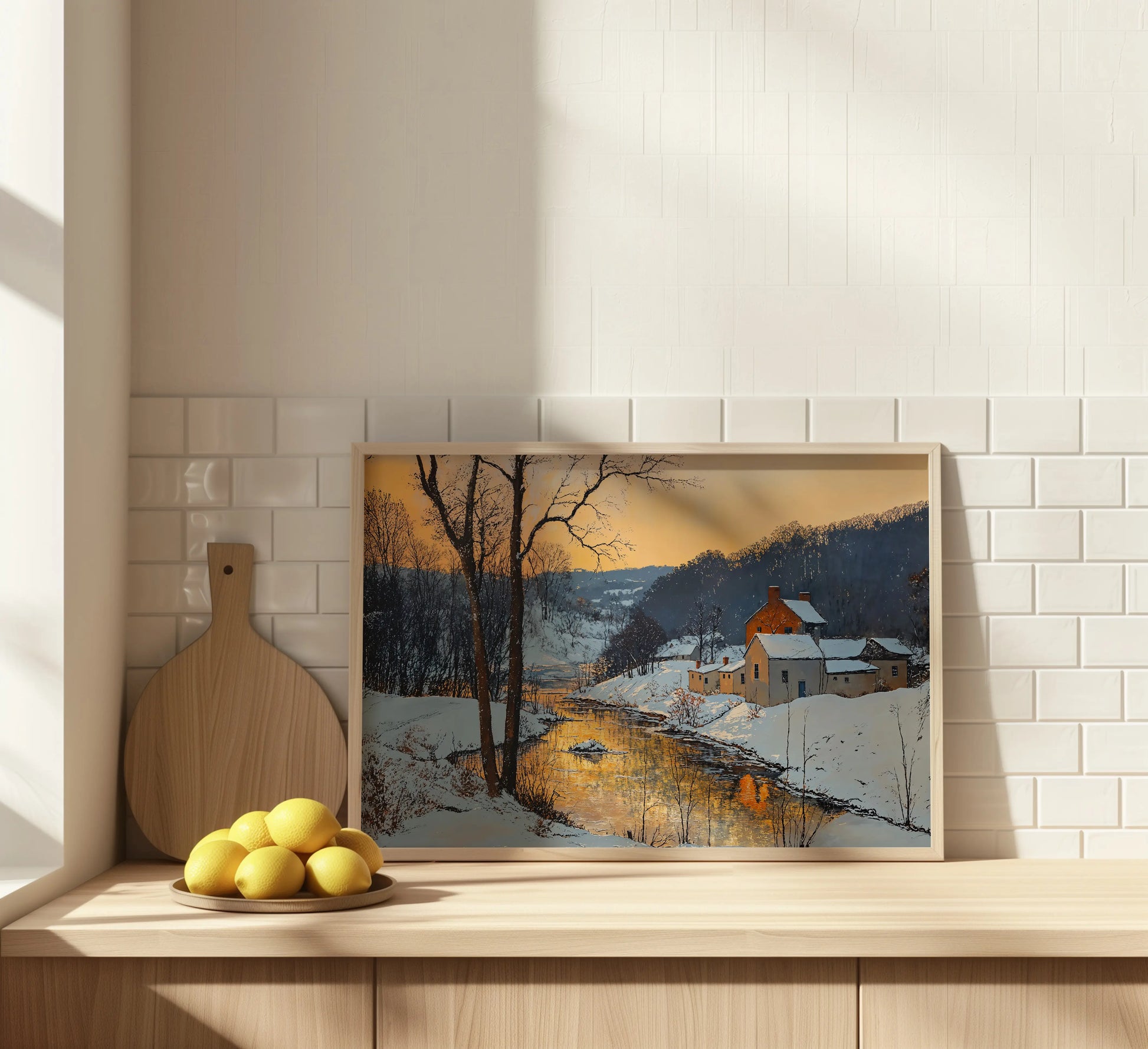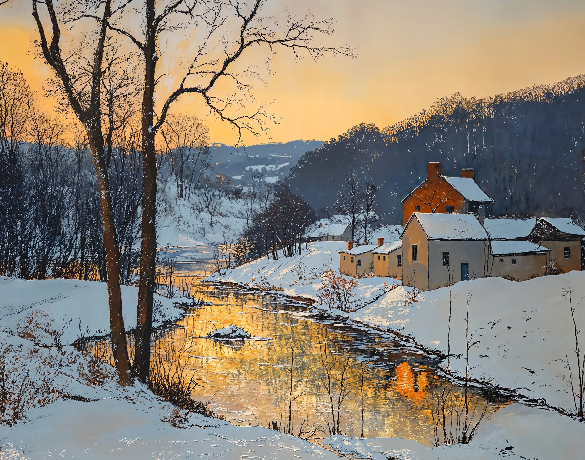 Sentinel captures the hushed harmony between architecture and landscape—warm glow on brick and snow, where every window seems to hold a flicker of memory. The surrounding hills fall into blue shadows, while the water reflects the sky's last embered breath.