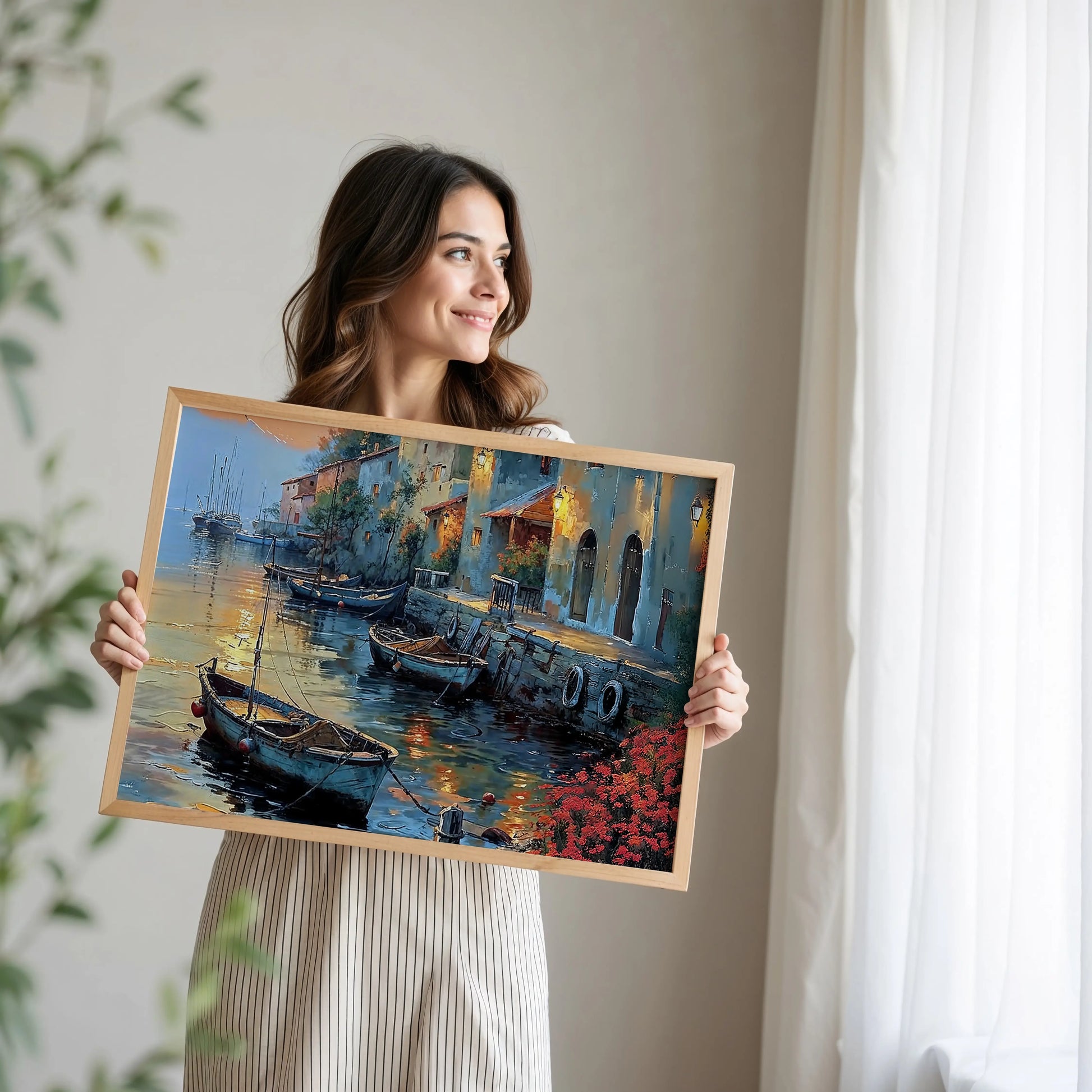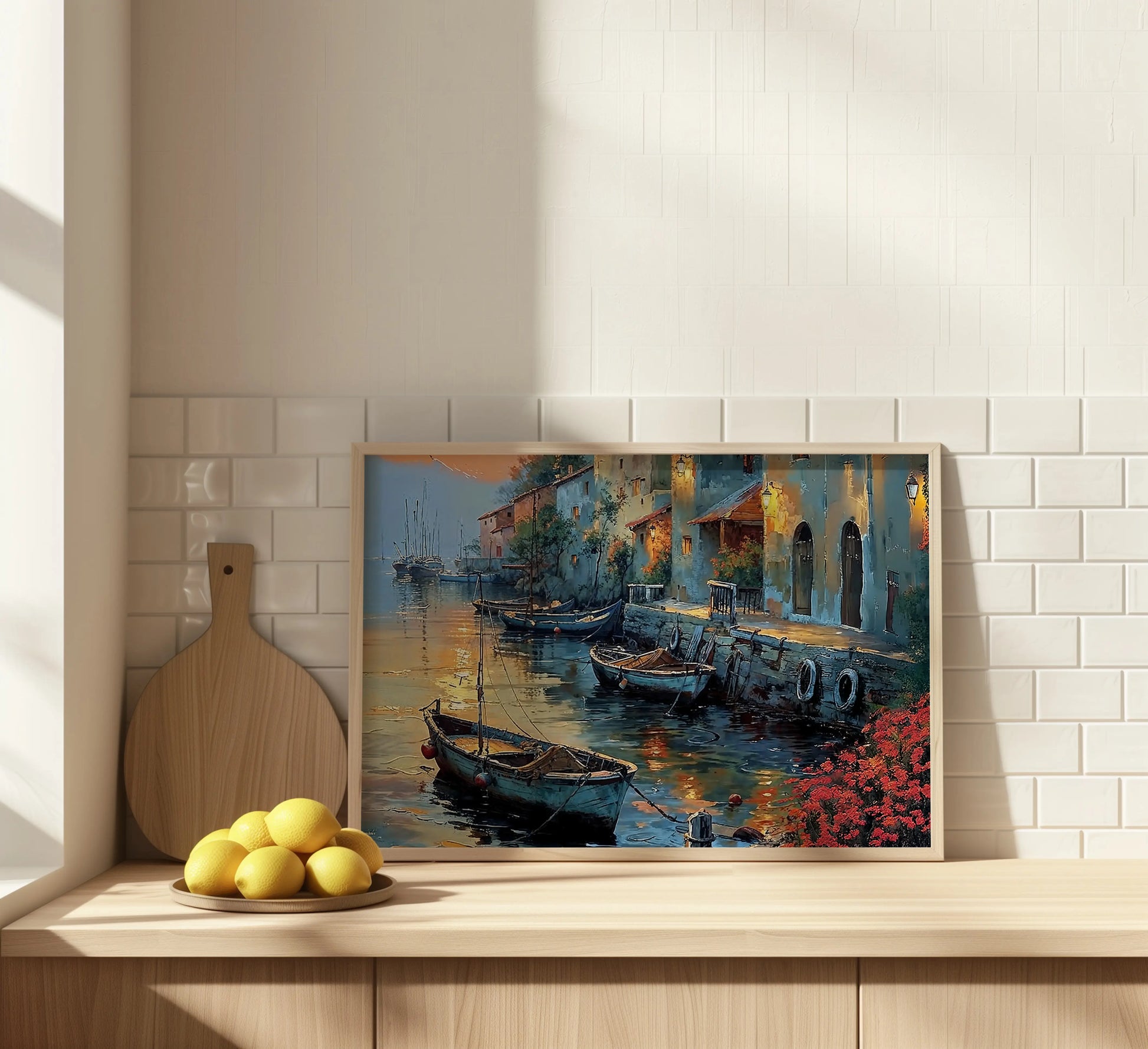 Silent Harbor paints a romantic picture of a quiet harbor at dusk, where boats gently bob in golden reflections and rustic buildings glow under the warm light of lanterns. The scene captures the soul of a timeless Mediterranean village—peaceful, intimate, and full of character.