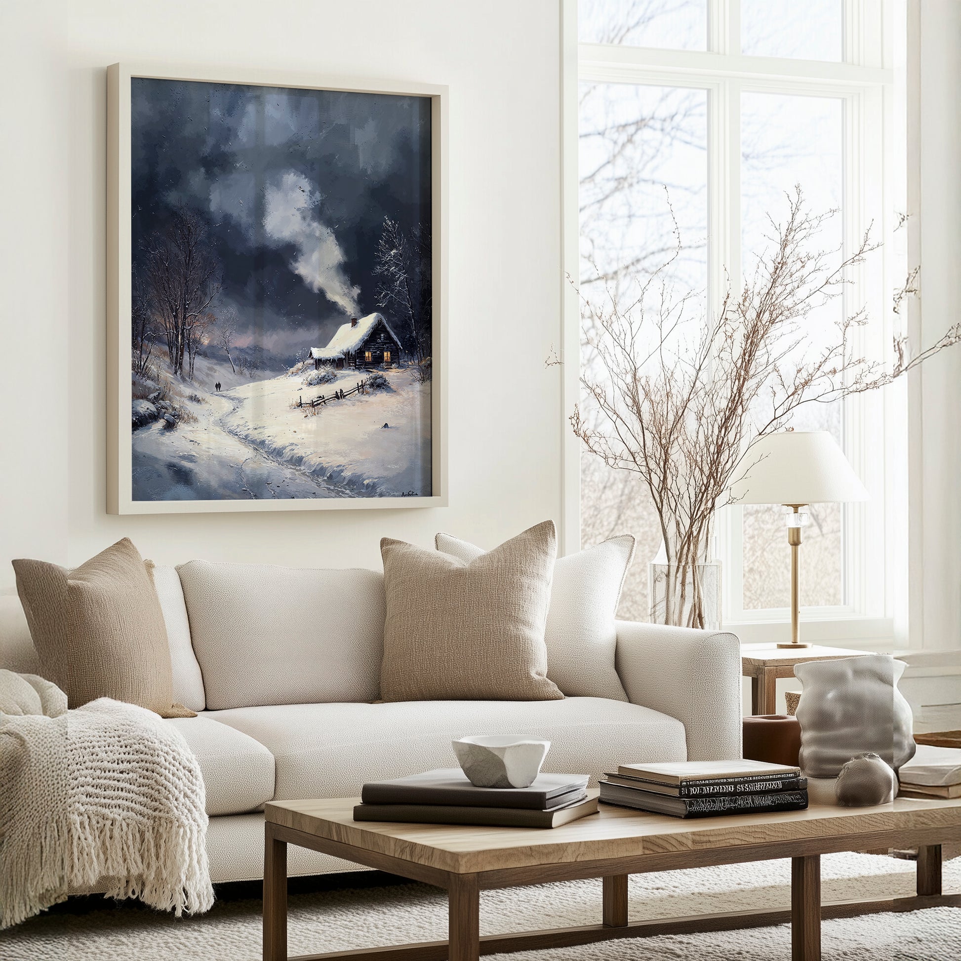 Handcrafted using Adobe Photoshop, Illustrator, Procreate, and Rebelle, this piece blends classical atmosphere with contemporary precision. Ideal for hygge-inspired interiors, winter-themed walls, or quiet seasonal moments that call for warmth and stillness.