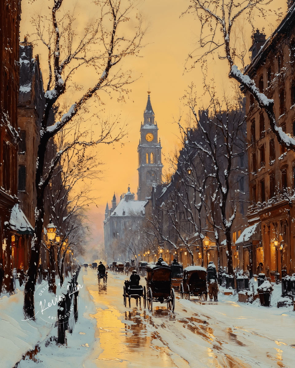Time Square drifts between memory and moment. Snow falls through twilight over cobblestones and lantern glow, while a distant clock tower marks time in quiet rhythm.