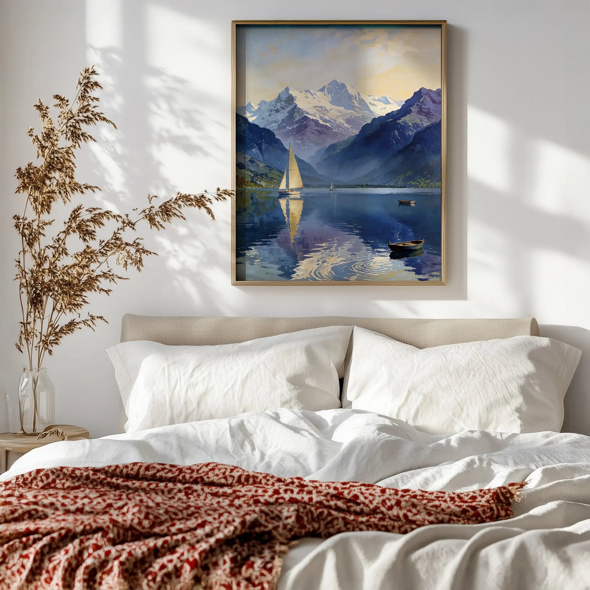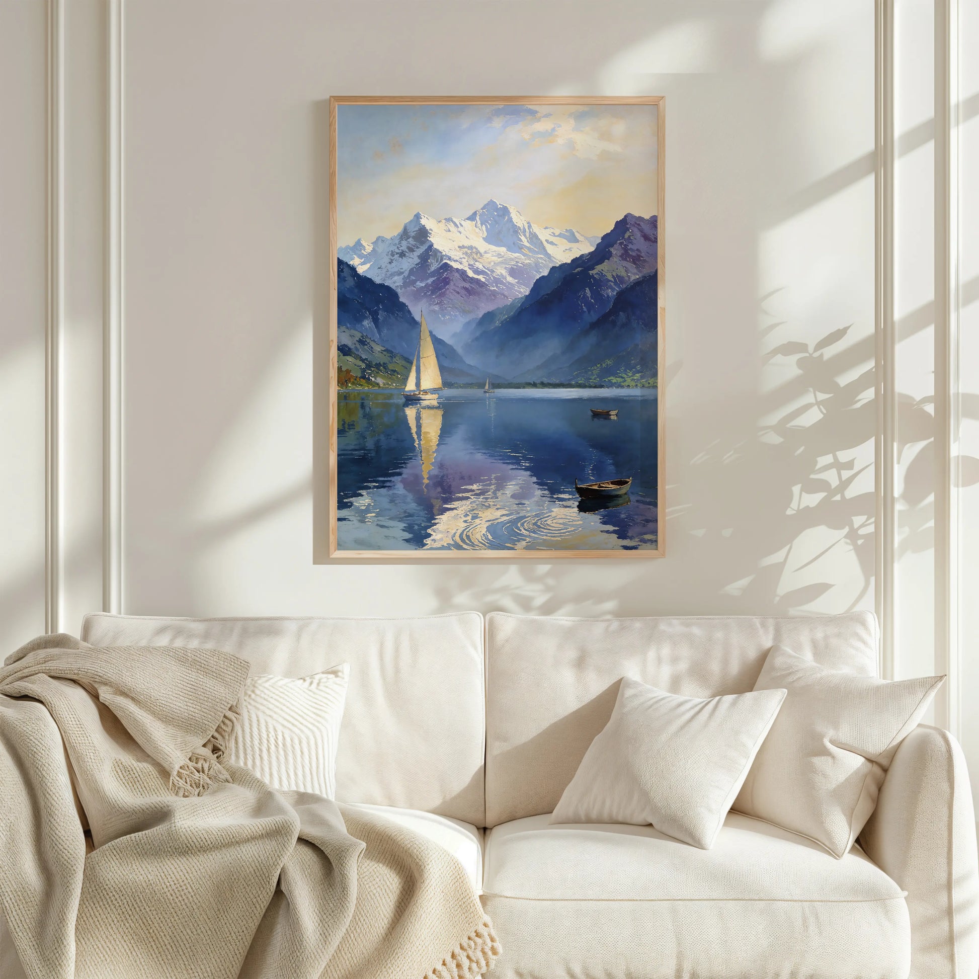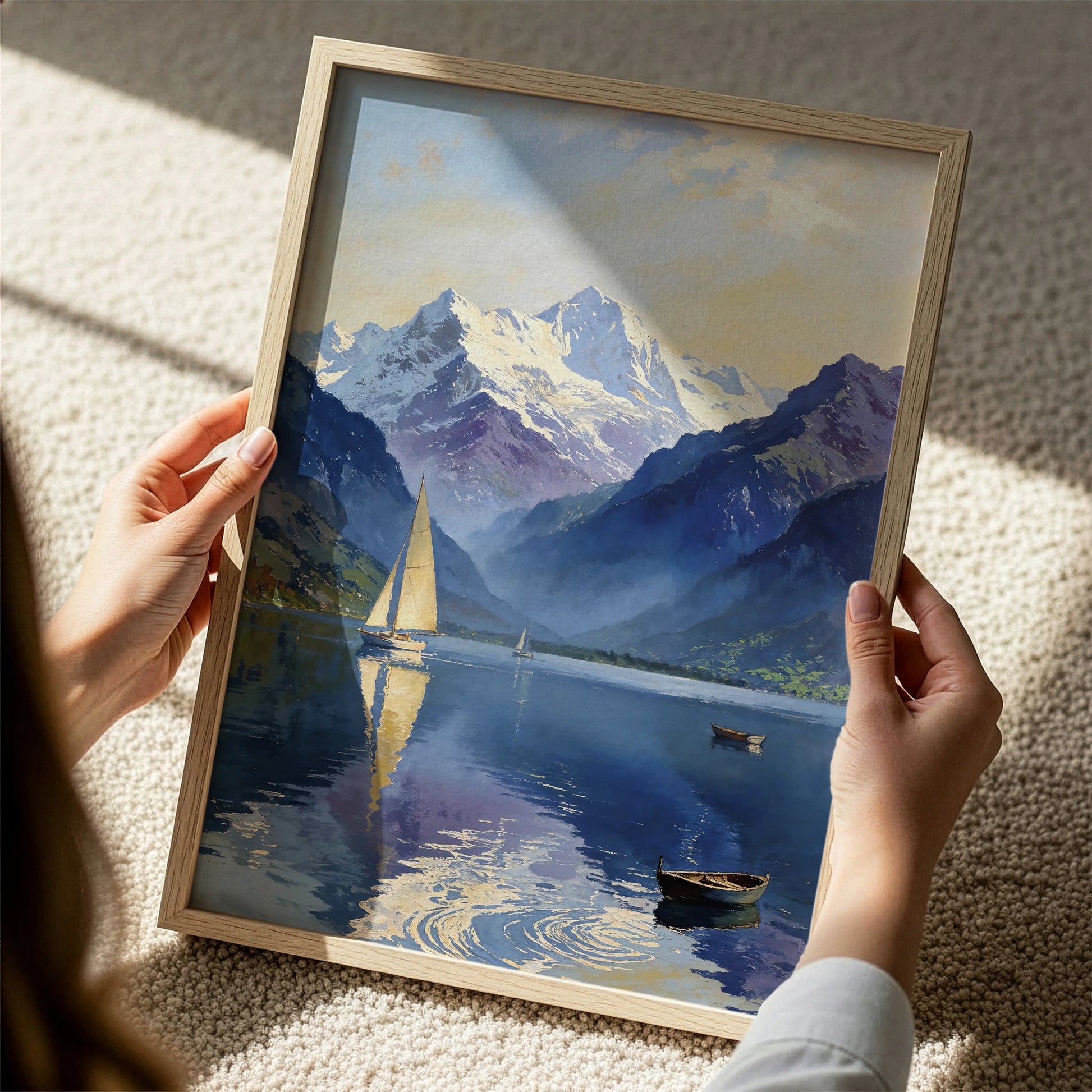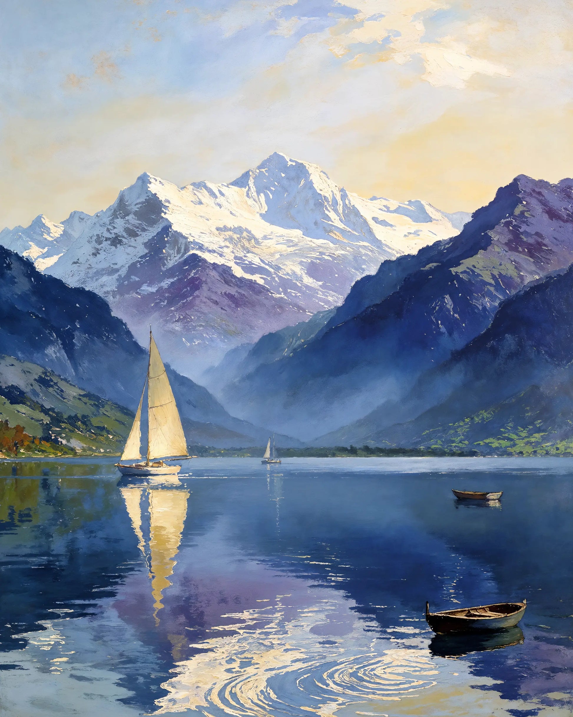 Solace depicts a serene mountain lake held between darkened slopes and snow-capped peaks, where sailboats move slowly across still water. Reflections of sky and mountain forms dissolve into the lake’s surface, reinforcing a sense of quiet balance and open space.