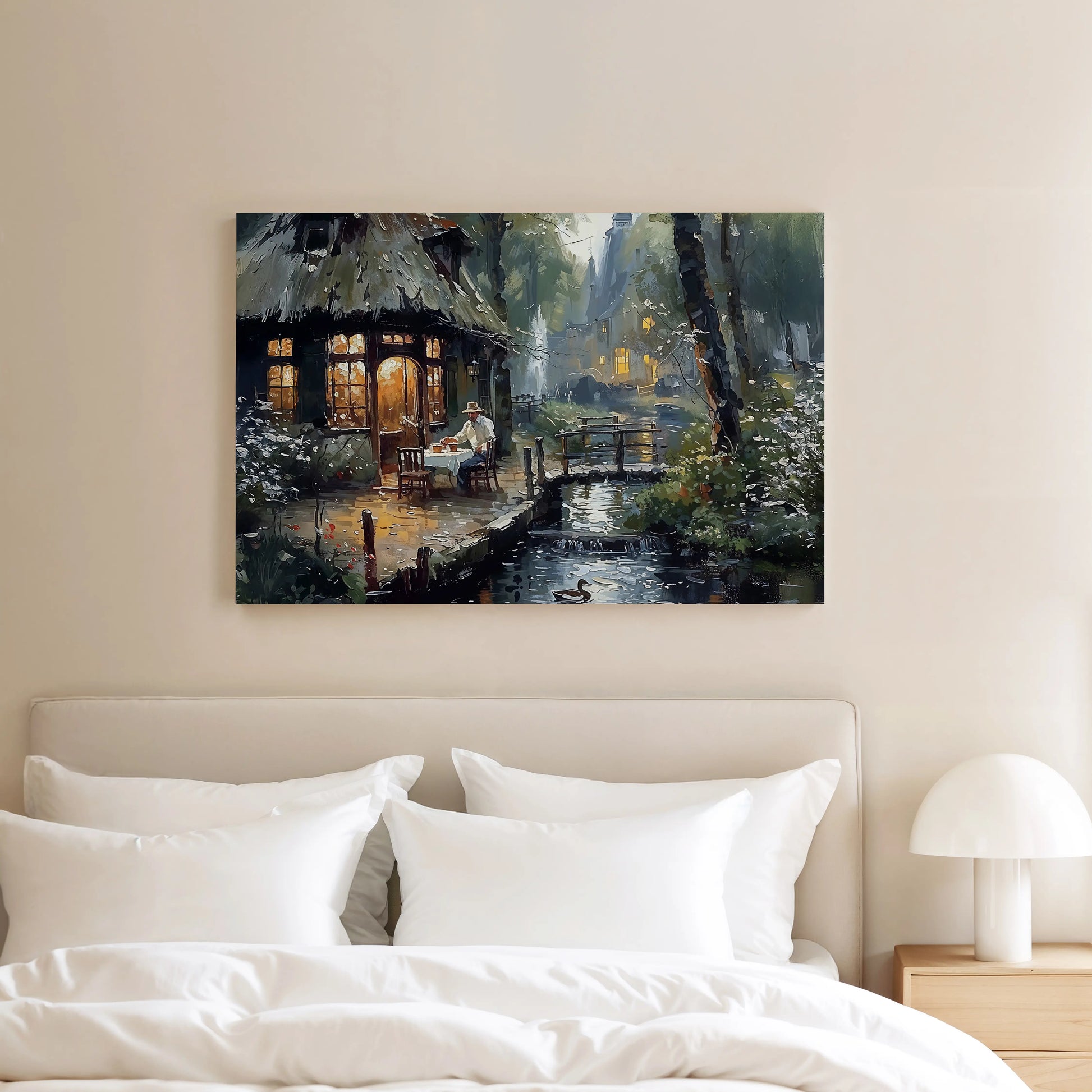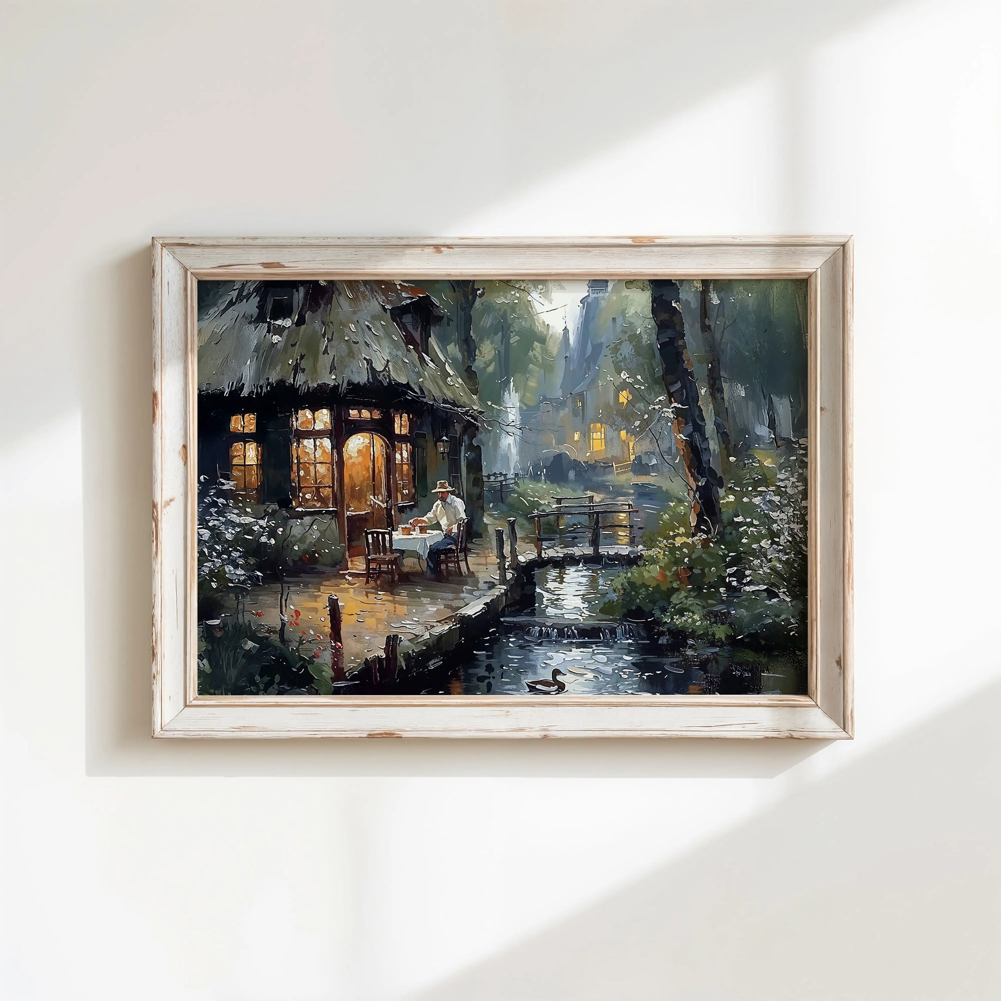 In Solitude an evening unfolds beside a gently flowing creek and a warmly lit thatched cottage. A solitary figure sits at a table set for one, surrounded by blooming flora, soft reflections in the water, and a gentle glow spilling from the windows.