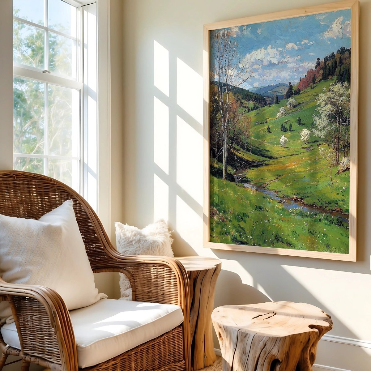 Verdant Hills roll beneath a vast spring sky, where light pools along a quiet stream and distant orchards bloom in scattered rhythm. The scene unfolds with open breath, a composition rooted in diagonal flow and softened horizon lines—inviting the viewer inward with both movement and stillness—every tree, whether bare-limbed or flowering, is given its gesture of rebirth.