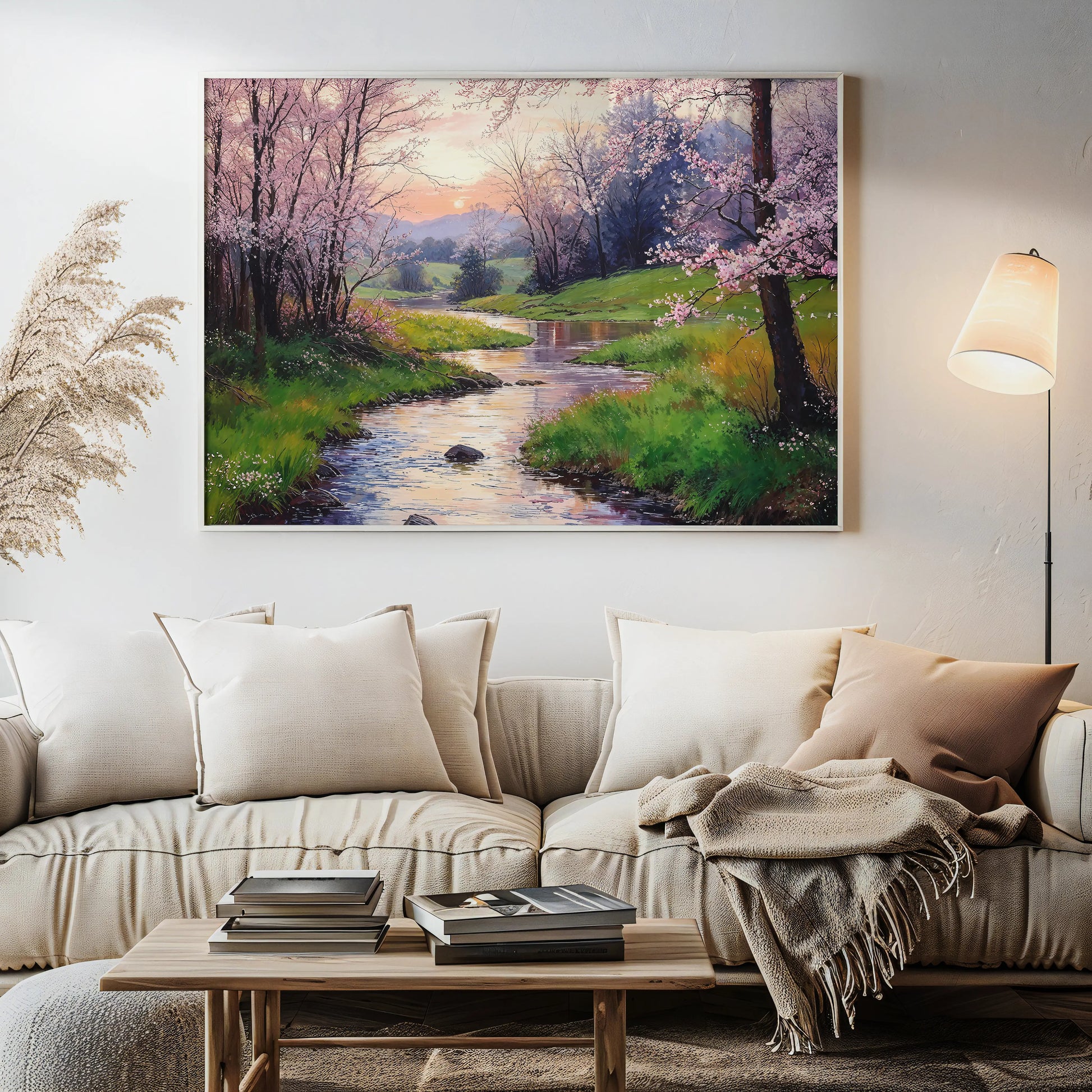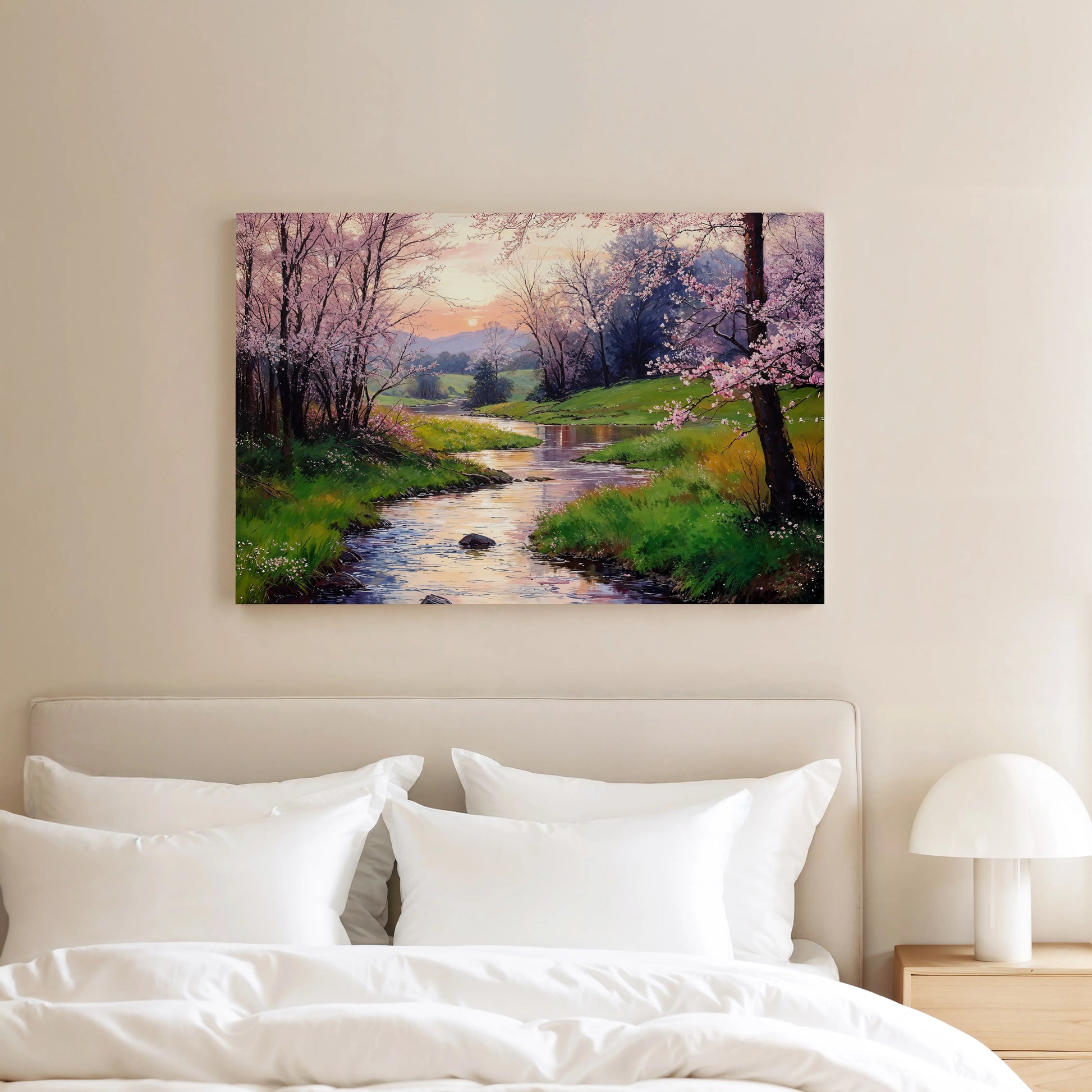 Spring Mirror is a luminous celebration of spring’s serenity. This artwork invites you into a tranquil scene where cherry blossom trees in full bloom stretch along a winding stream, reflecting the soft pinks and oranges of a glowing sunset.