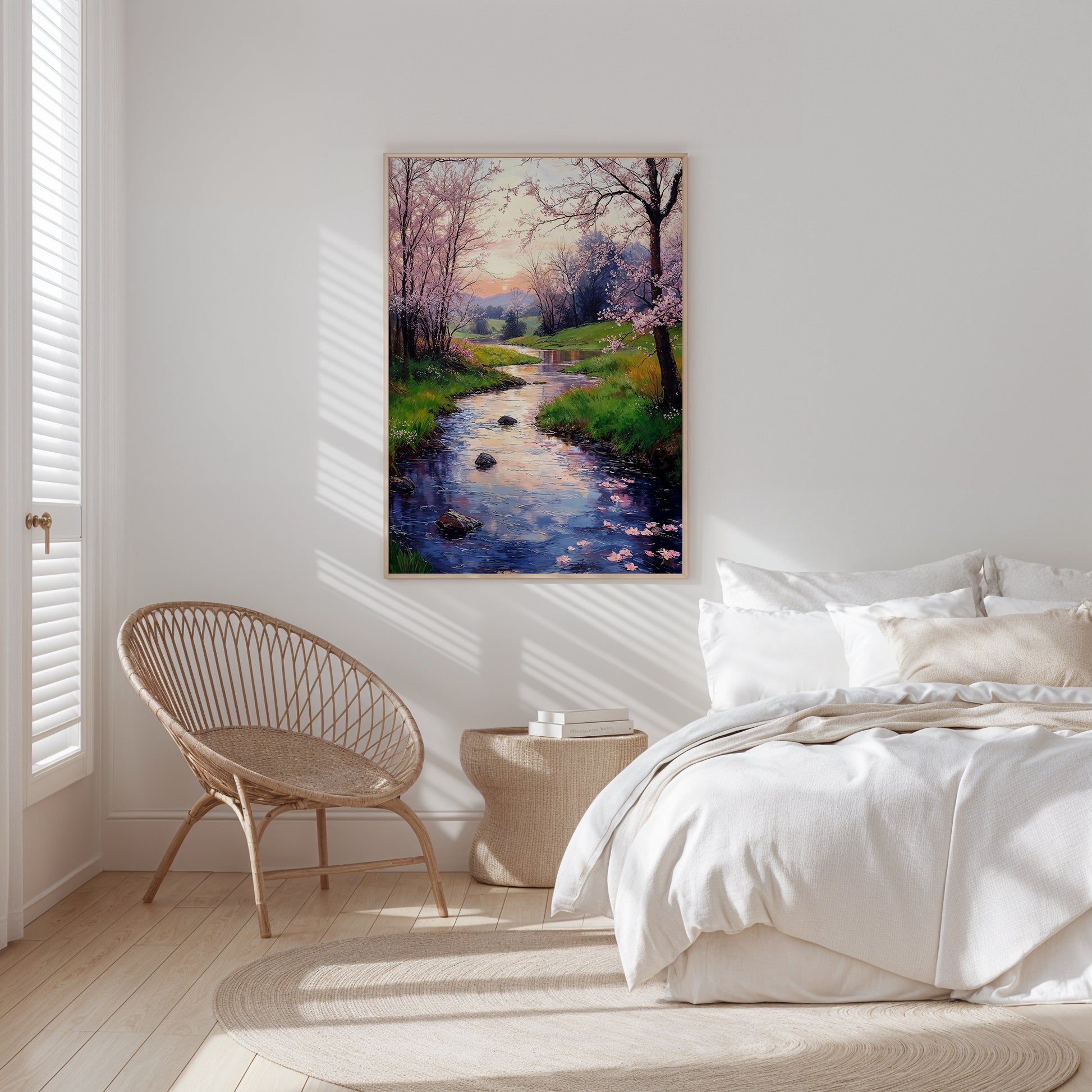 Blossoms drift across mirrored water, their delicate forms caught in slow motion beneath a sky tinted by the final glow of day. The stream curves like a quiet breath, guiding the gaze past trees softened in spring bloom toward distant fields veiled in dusk. Stillness lingers not as absence, but as invitation.