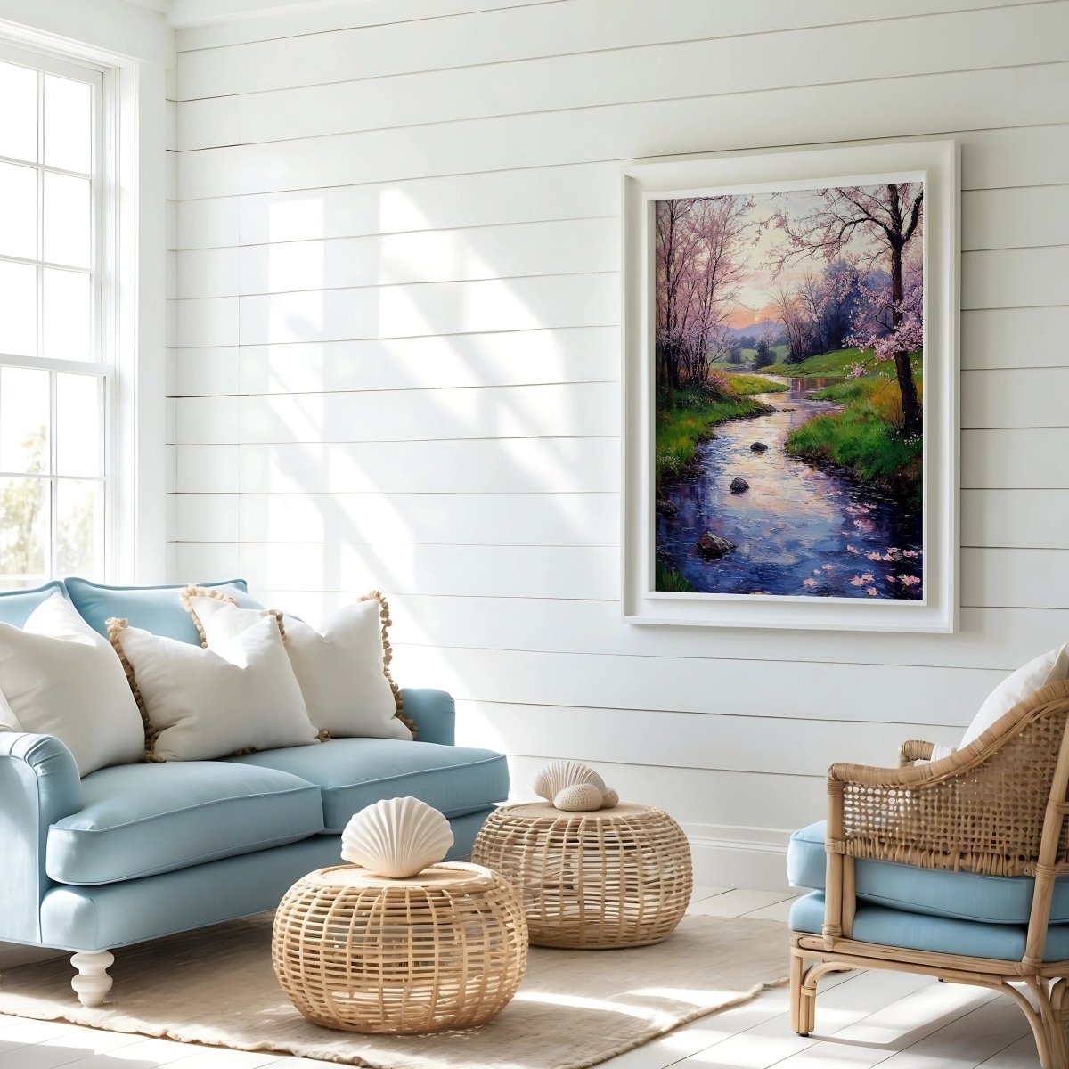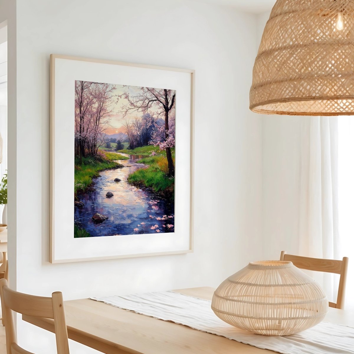 Blossoms drift across mirrored water, their delicate forms caught in slow motion beneath a sky tinted by the final glow of day. The stream curves like a quiet breath, guiding the gaze past trees softened in spring bloom toward distant fields veiled in dusk. Stillness lingers not as absence, but as invitation.