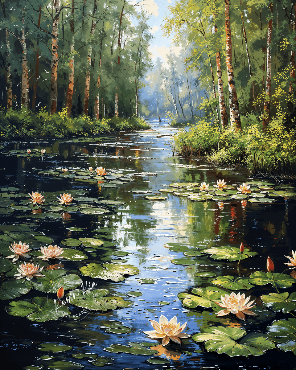 Lacuna evokes a visual breath—calm and unbroken. A forested haven stretches into the background, its canopy gently dissolving into reflections. The composition feels suspended in meditation, a pause held by sunlight and leaf-shadow.
