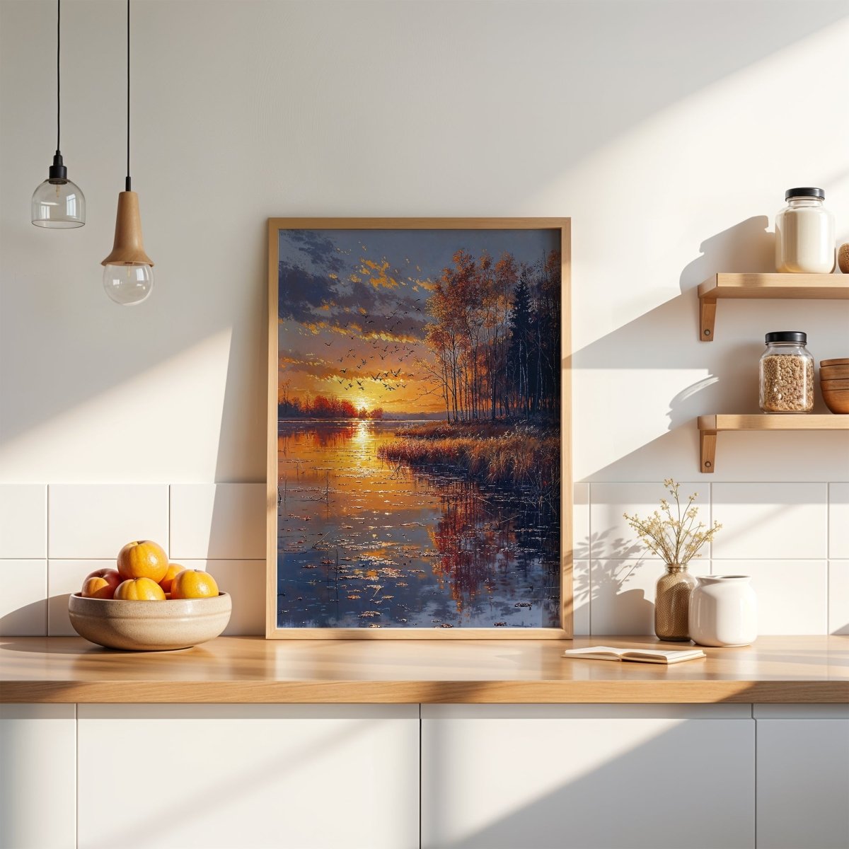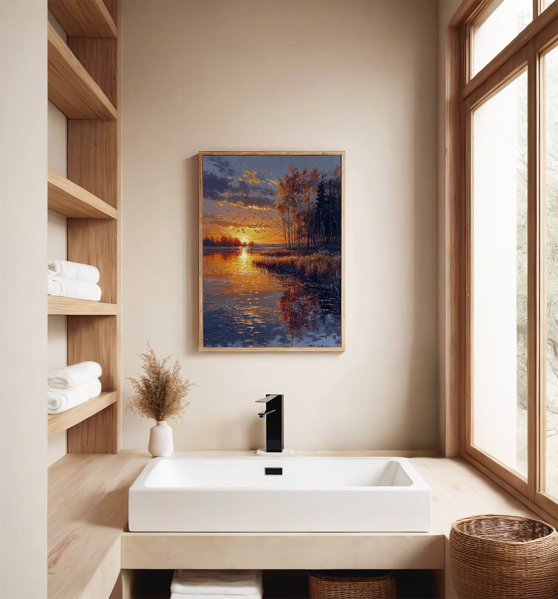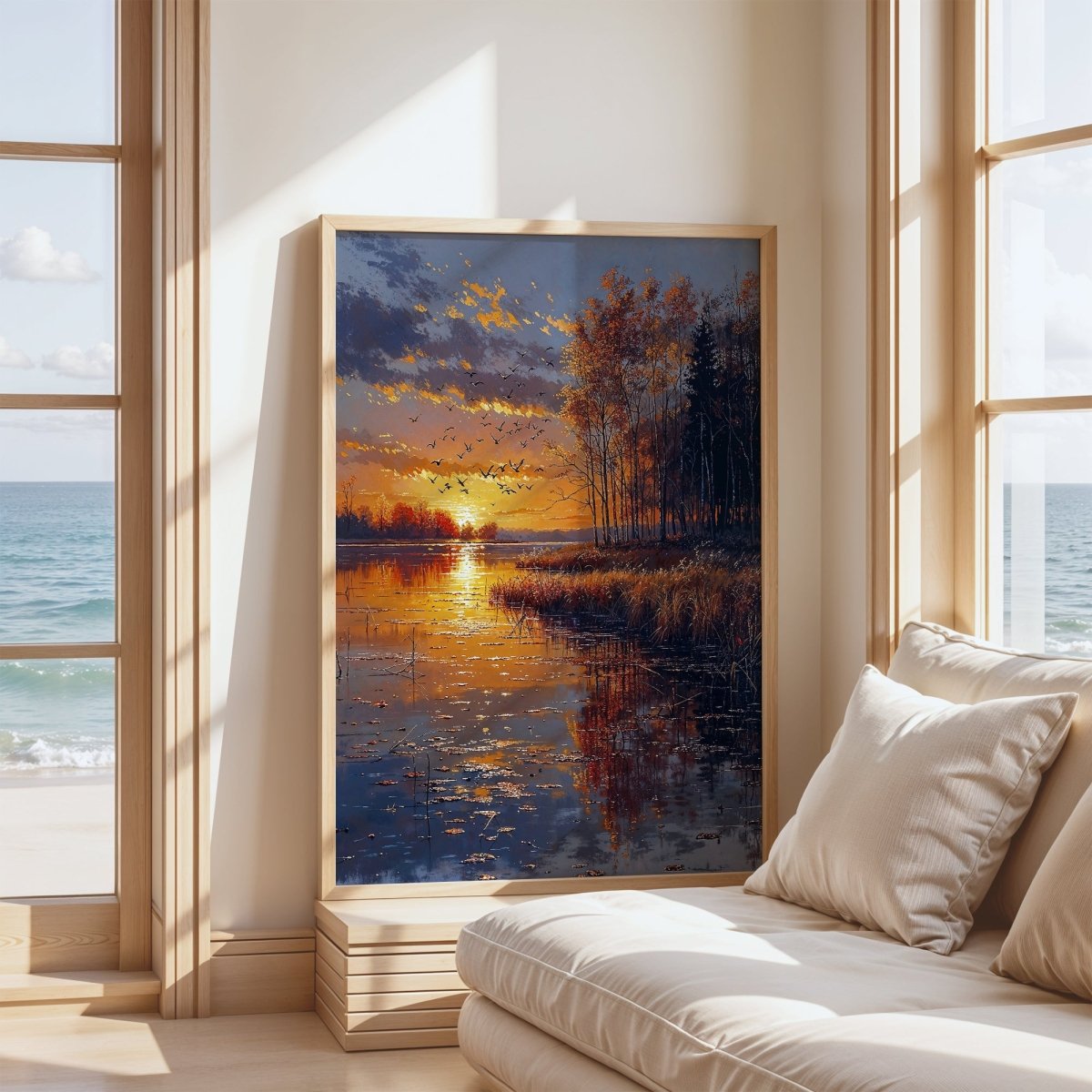 Designed to enhance restful spaces—bedrooms, lakeside interiors, or meditation rooms—it invites quiet presence. More than a sunset, it is a passage: golden, suspended, and momentarily eternal.