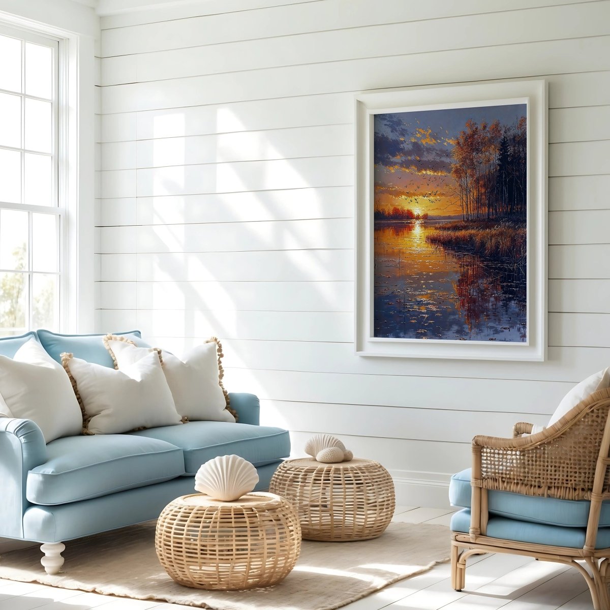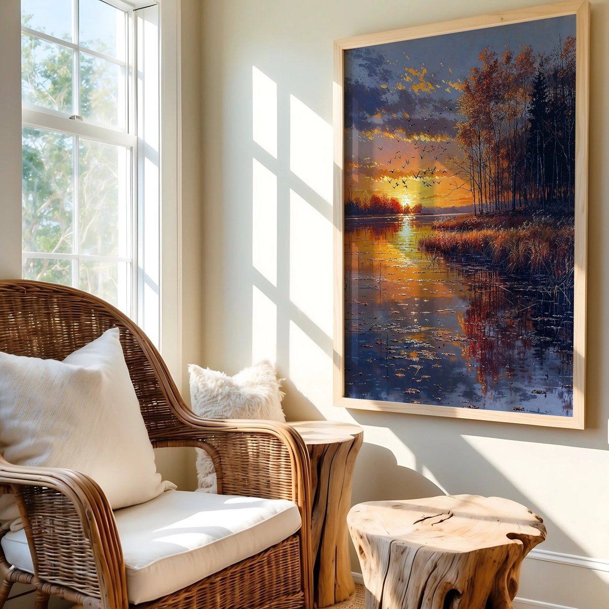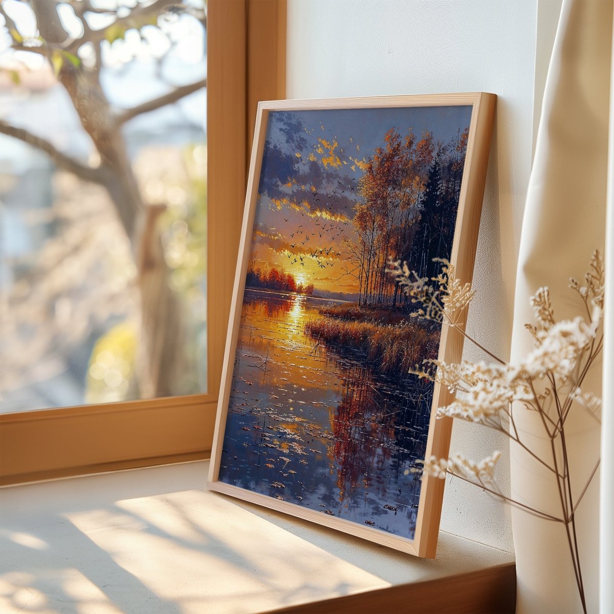 Designed to enhance restful spaces—bedrooms, lakeside interiors, or meditation rooms—it invites quiet presence. More than a sunset, it is a passage: golden, suspended, and momentarily eternal.