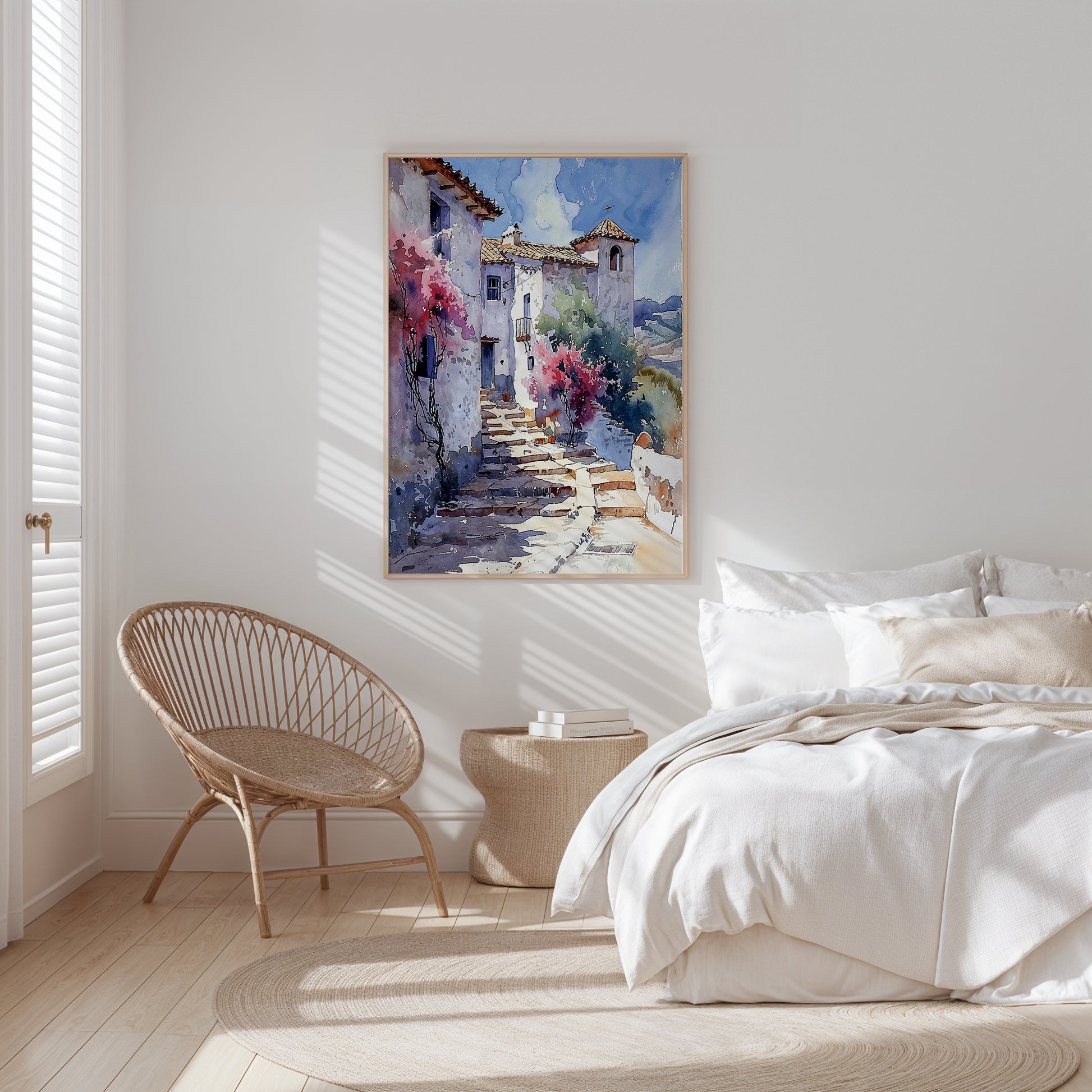 Sunwashed Steps carries the warmth of Mediterranean light across a quiet village stairway, where each curve of stone feels lived-in and every bloom leans gently toward the sun. Soft bougainvillea spills from courtyards, echoing the lyrical movement of light and time on weathered walls.
