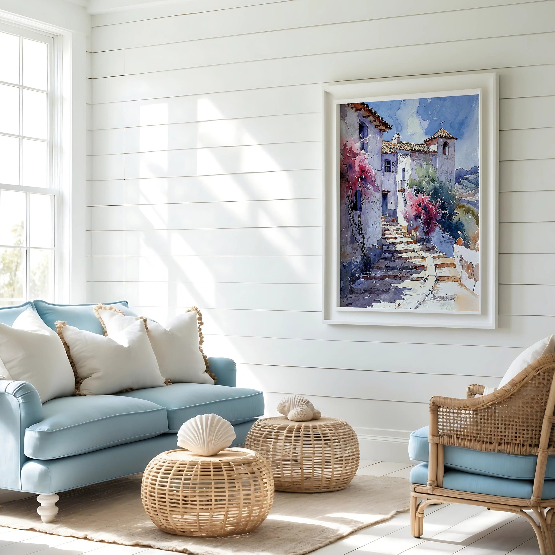 Perfect for sunrooms, Mediterranean kitchens, travel-themed nooks, or romantic interiors, the piece brings warmth and timeless charm. It’s not only a glimpse of place, but a celebration of slowness—where sunlight clings to memory and every step feels like return.