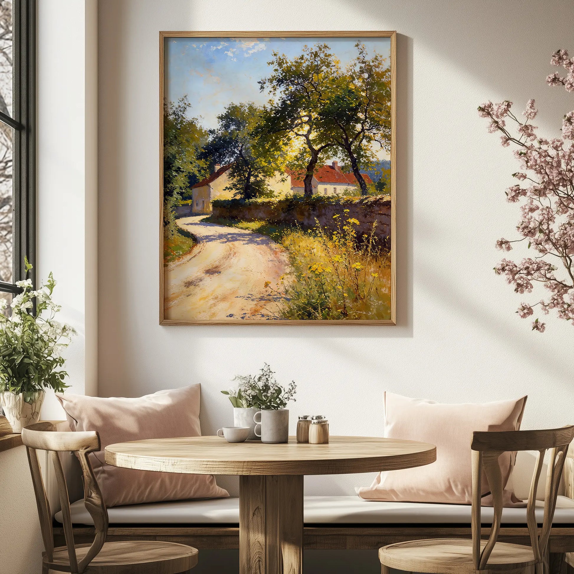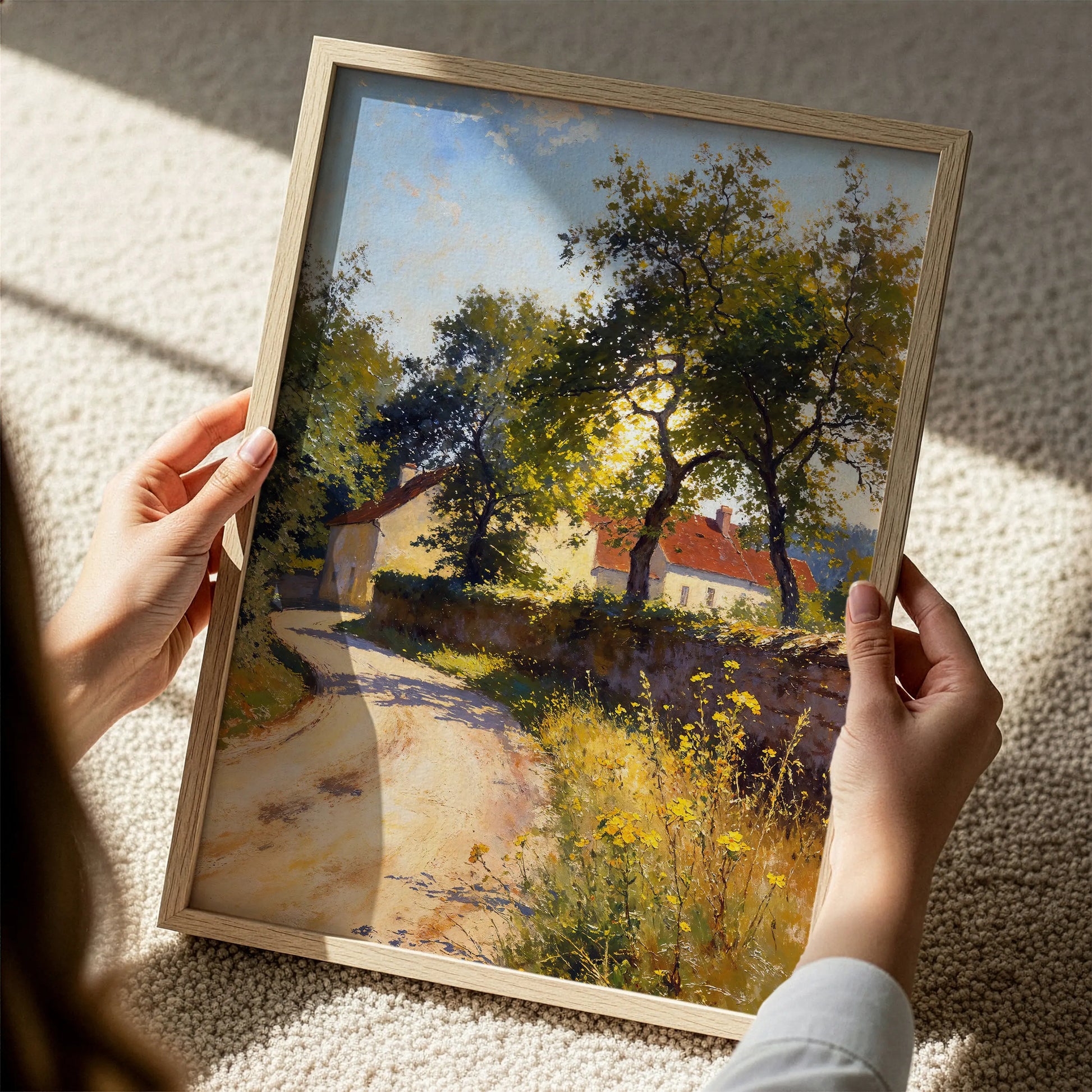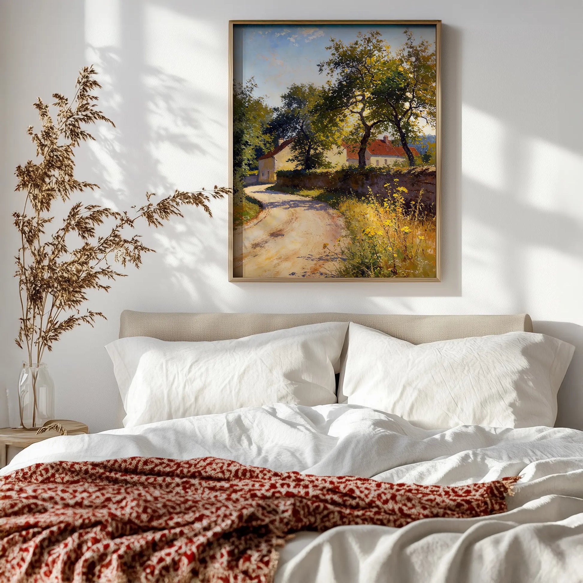 The composition emphasizes passage, shelter, and rural calm, making this artwork well-suited to interiors drawn to pastoral scenes, quiet movement, and natural light.