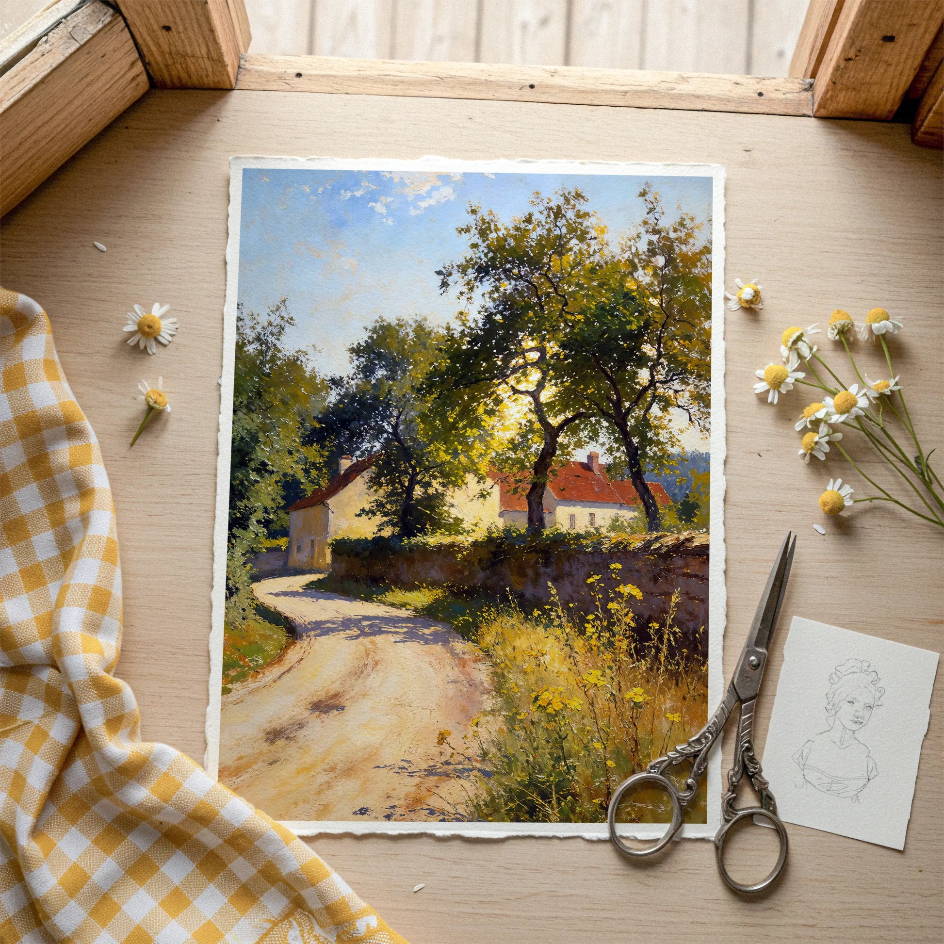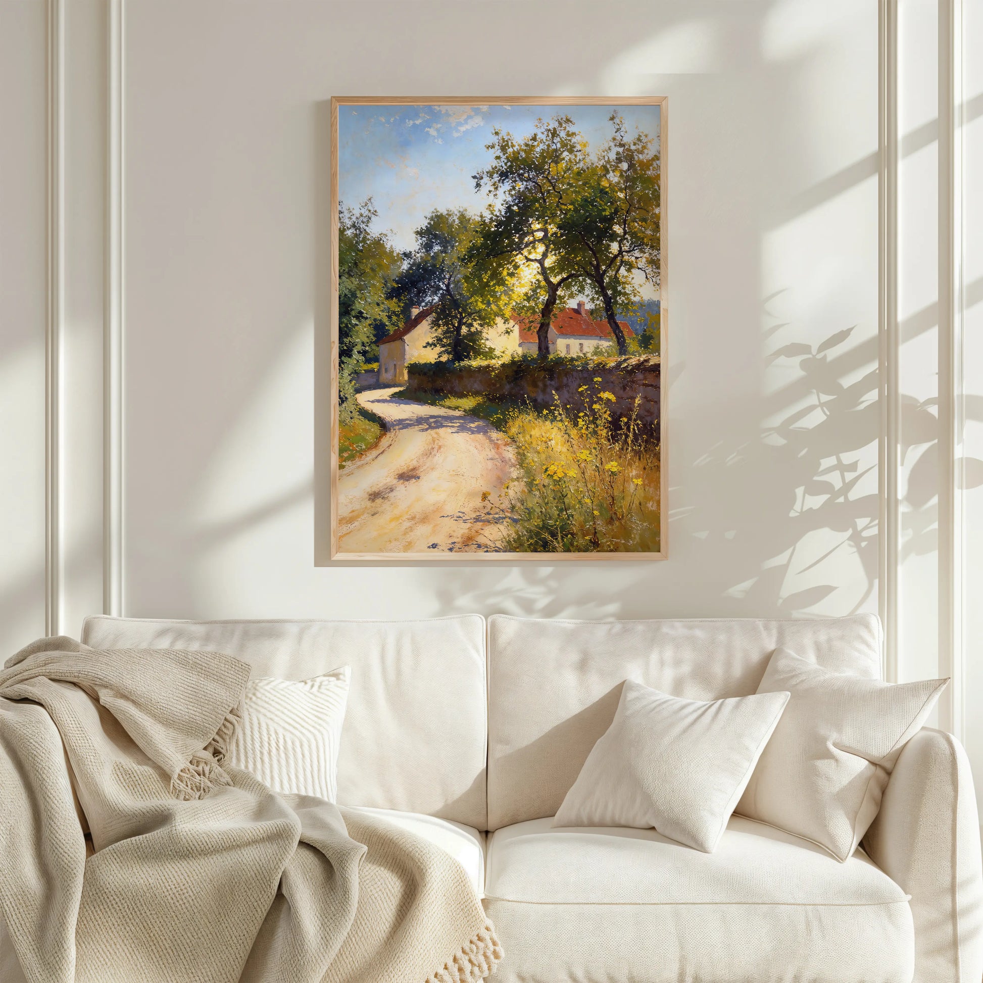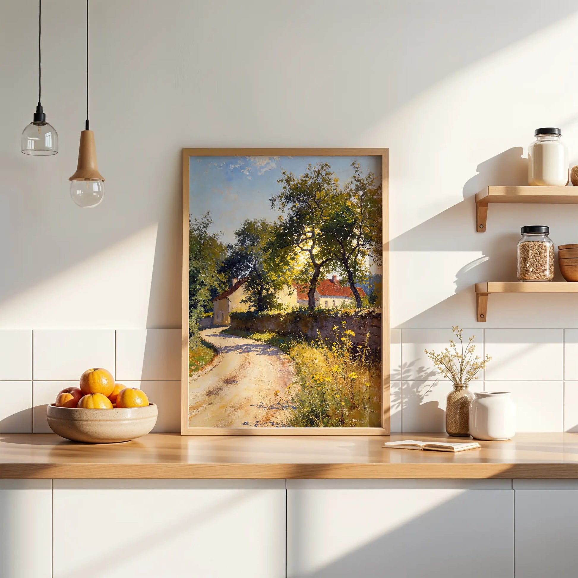 The composition emphasizes passage, shelter, and rural calm, making this artwork well-suited to interiors drawn to pastoral scenes, quiet movement, and natural light.