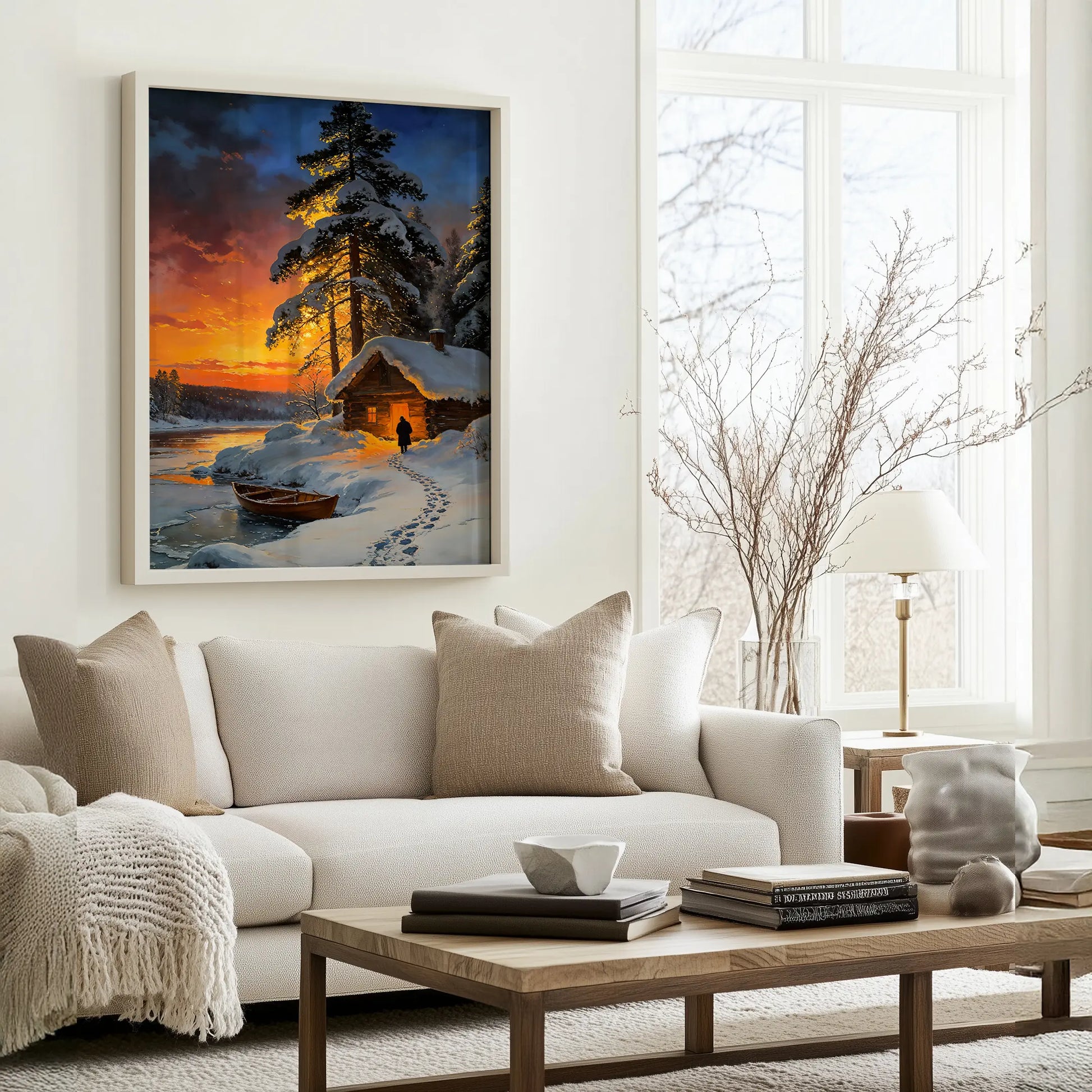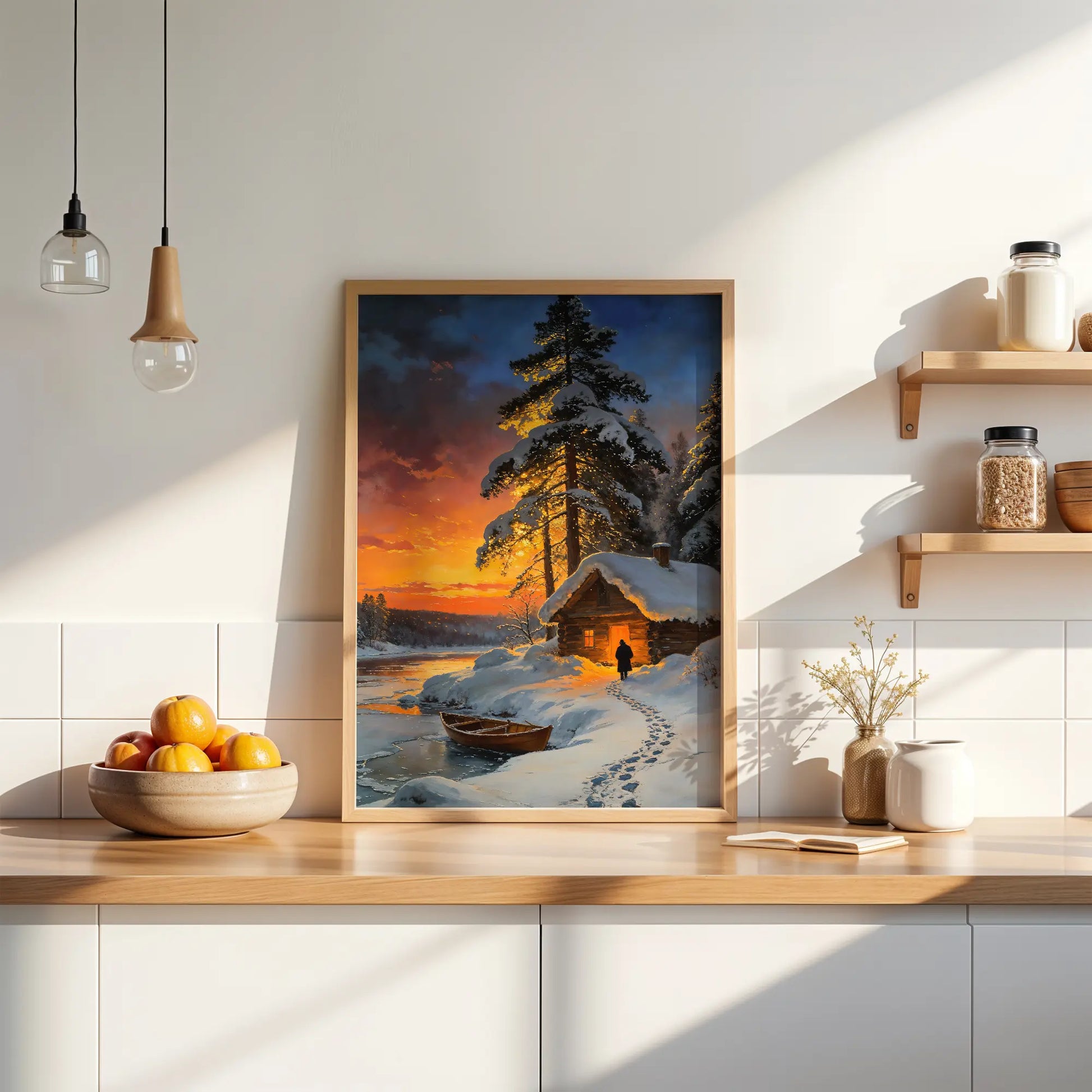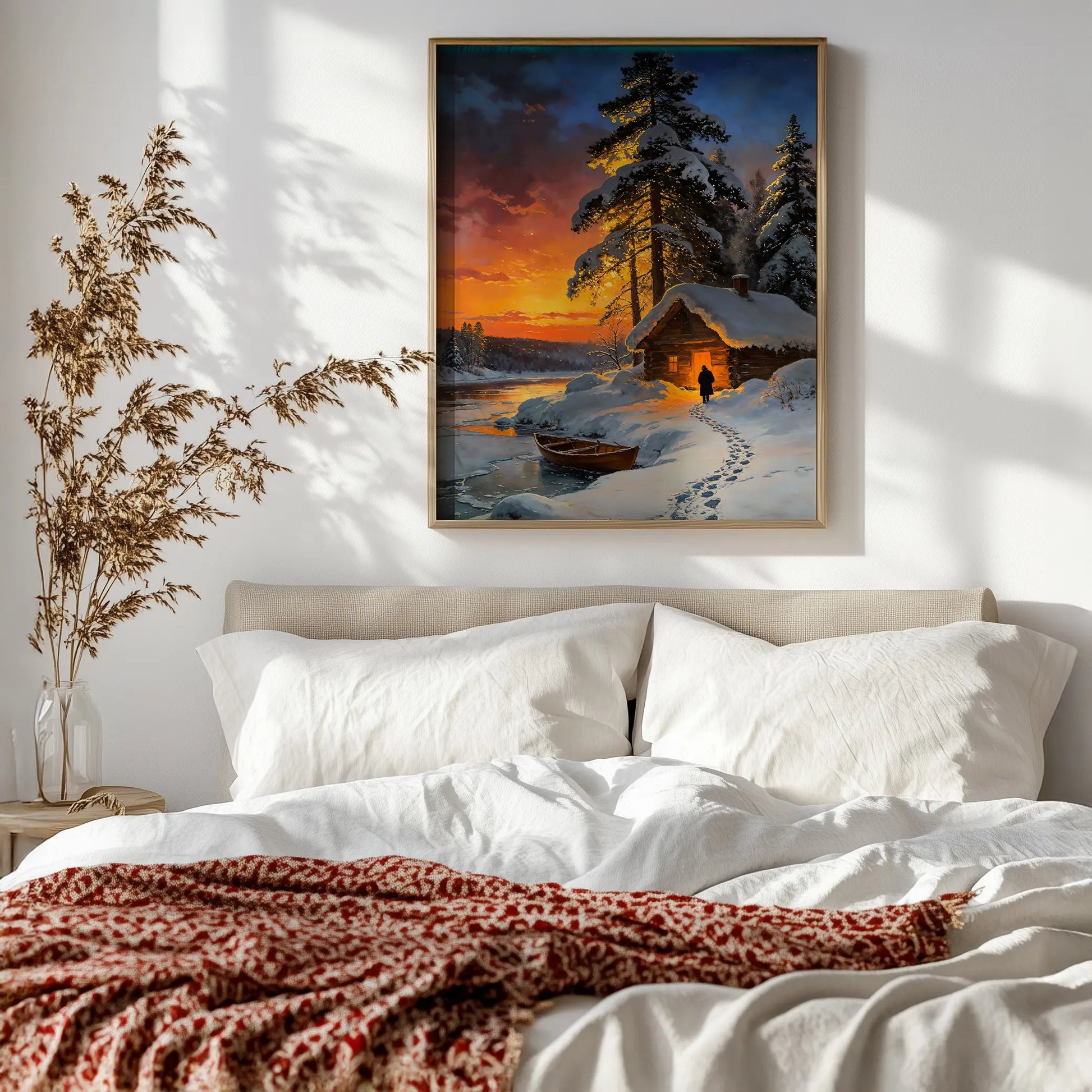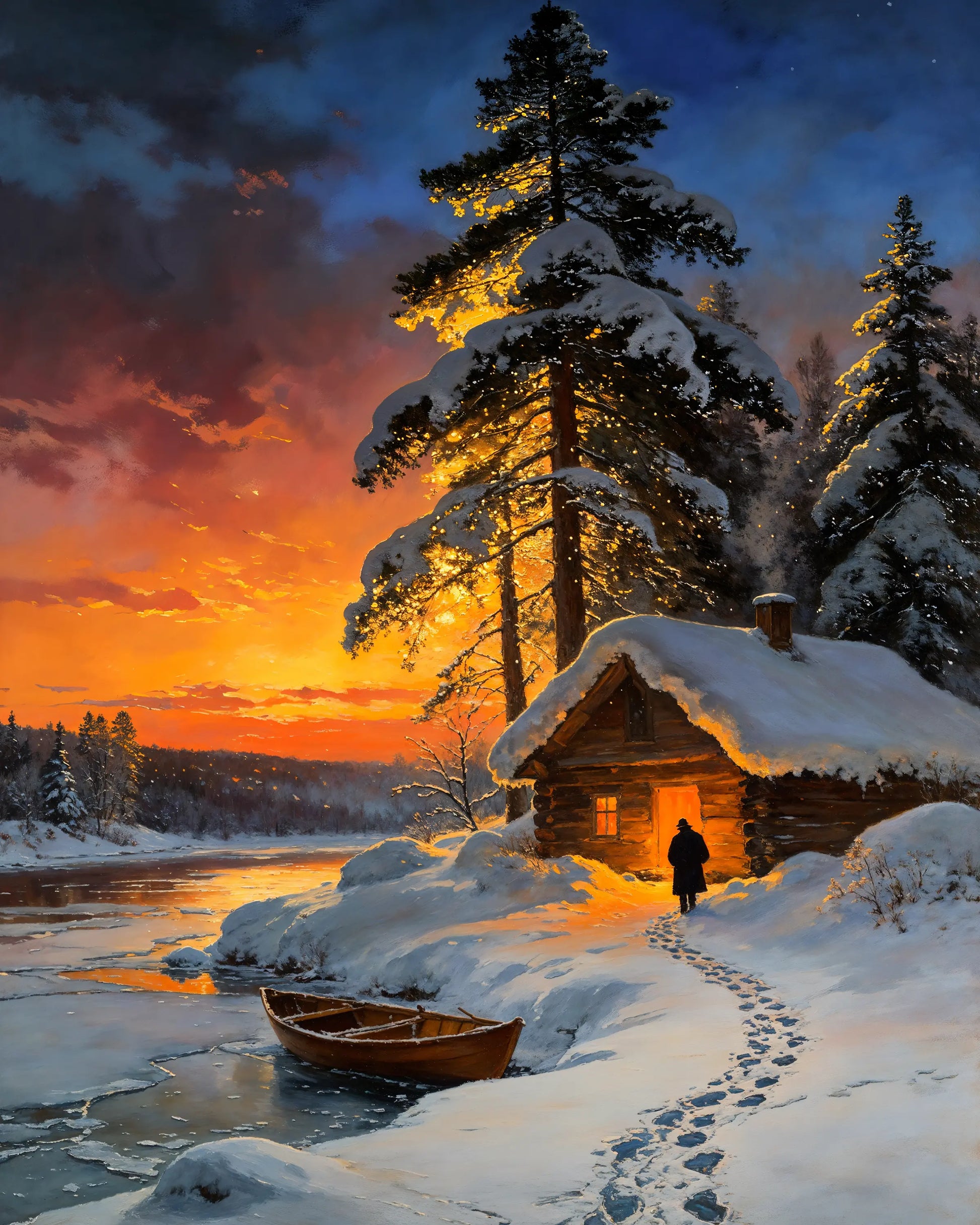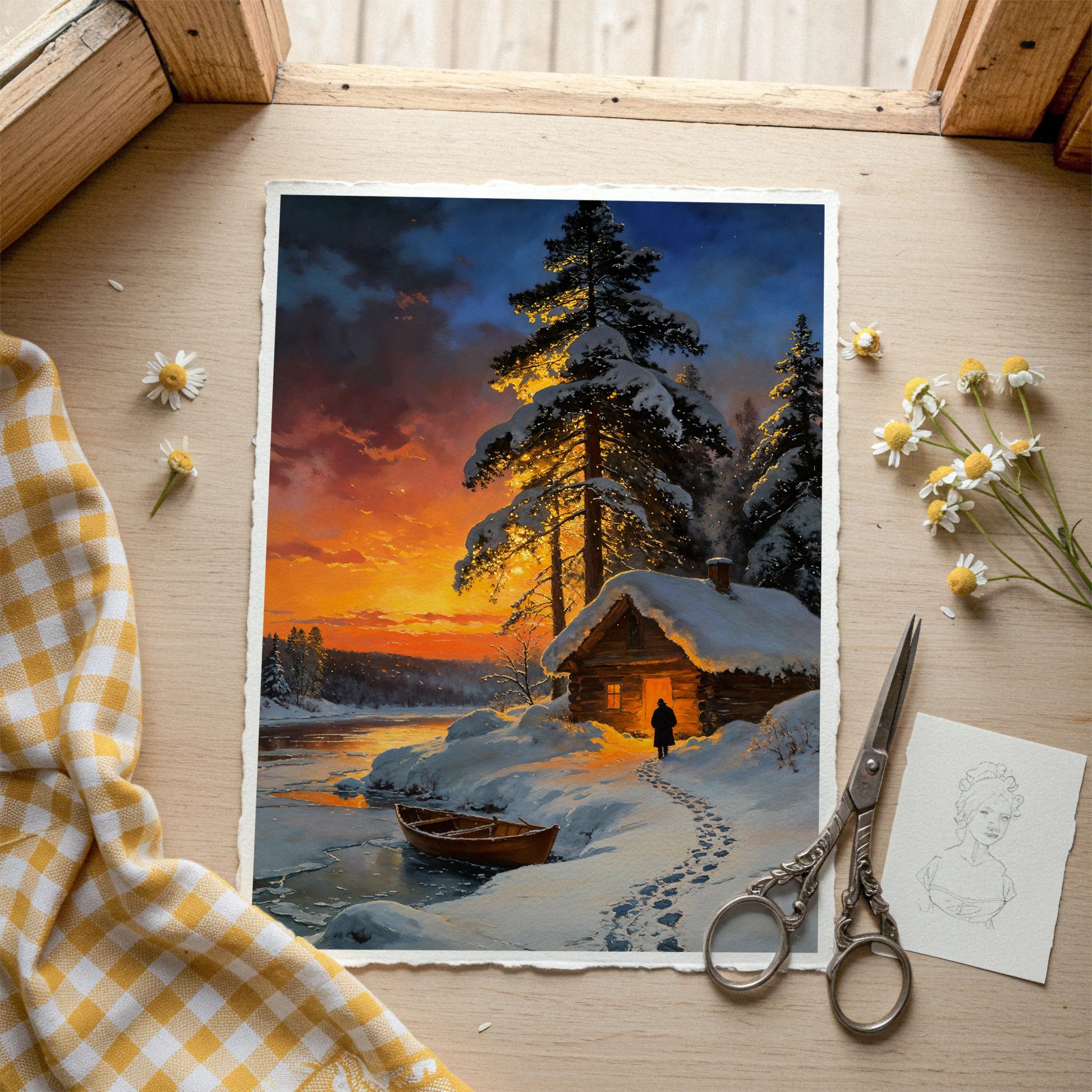 In To Dare, the artist captures that sacred space between isolation and warmth, fear and resolve. The cabin’s glow spills like a promise into the snow, reflecting the eternal human instinct to move toward light. The frozen river mirrors the flame-touched sky, uniting fire and ice in a moment of transcendence.