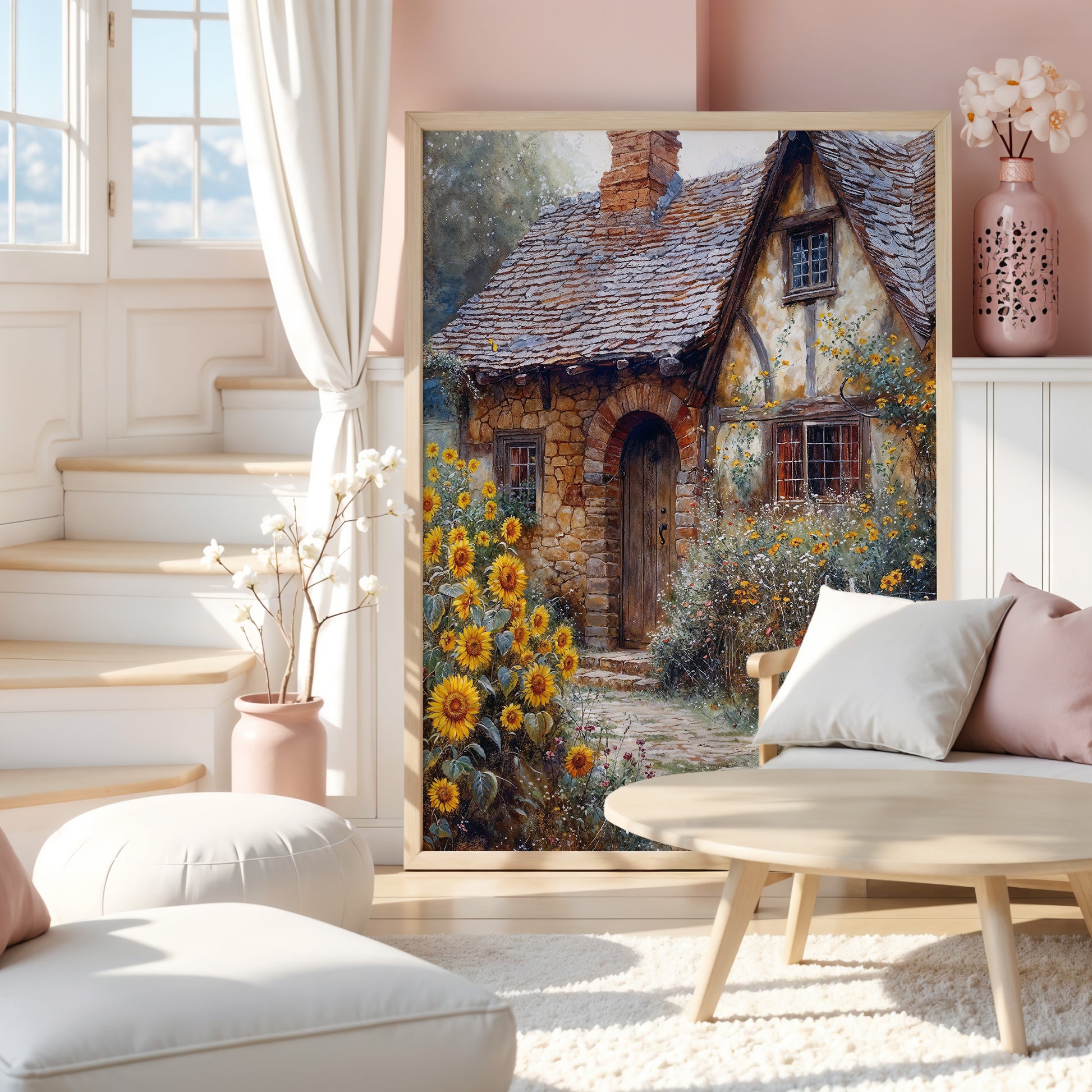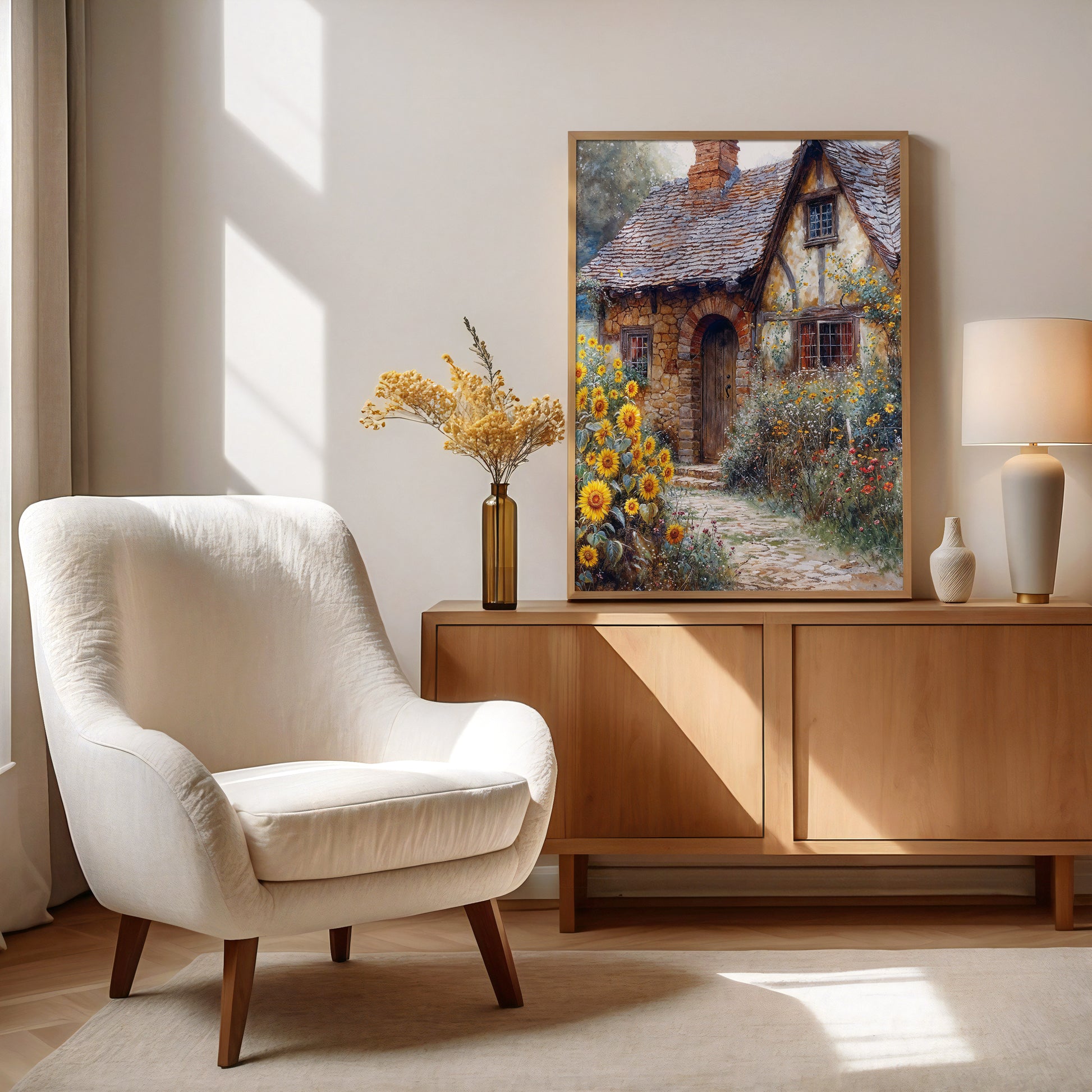 Golden petals radiate outward in Tournesols, where light rests quietly on a field of sunflowers and whispers against aged timber and hand-laid stone. The cottage stands as both anchor and witness—its weathered roof and arched doorway framed by untamed florals and gentle illumination.