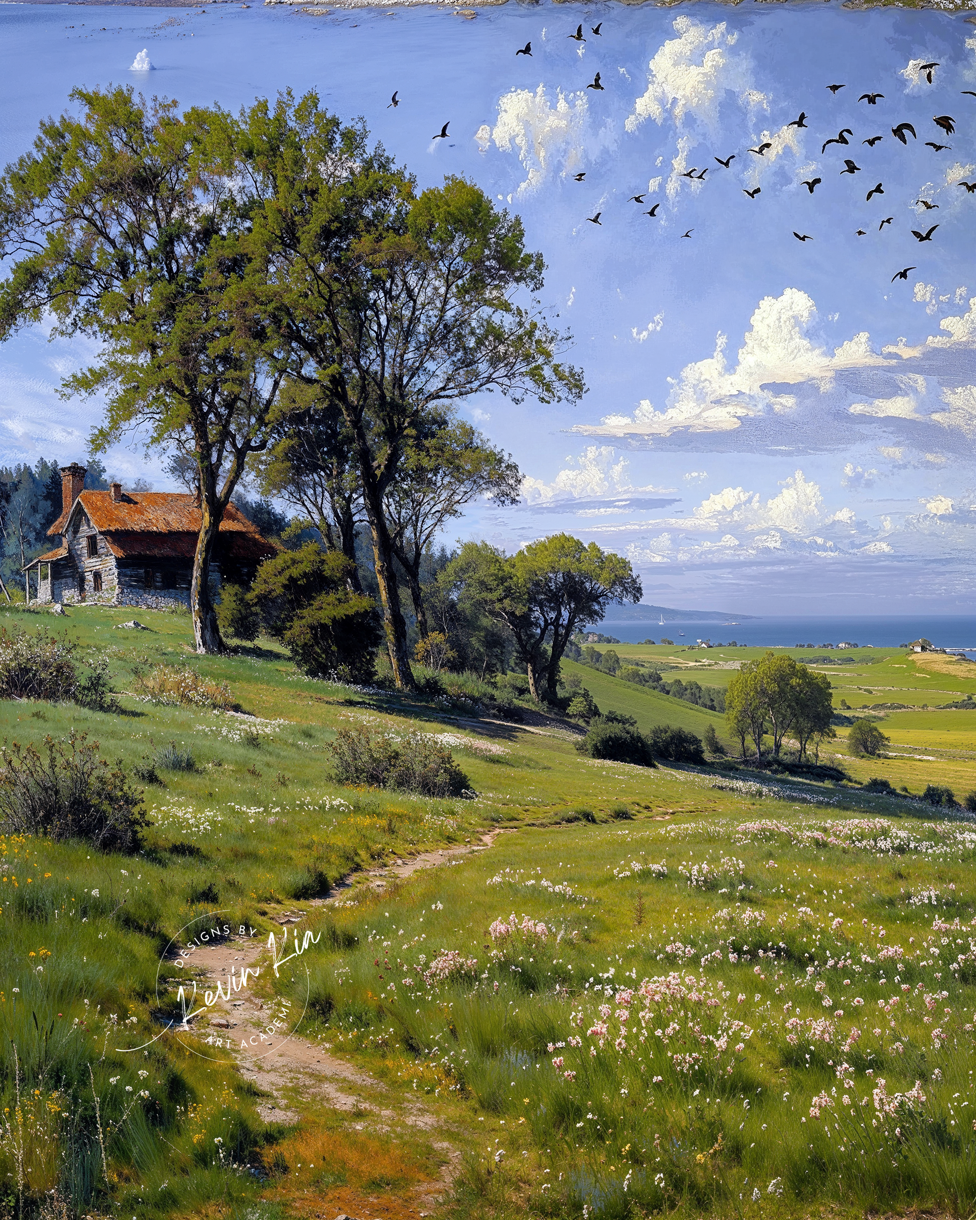 Toward Elsewhere wanders across an open tapestry of earth and air, where a flowering meadow spills toward a distant coast beneath drifting cloud and migrating birds. Each compositional element whispers spaciousness—sky consuming the upper canvas, wildflowers rendered in flicked impasto, and a solitary path etched like memory through sun-warmed green. Texture breathes across every layer.