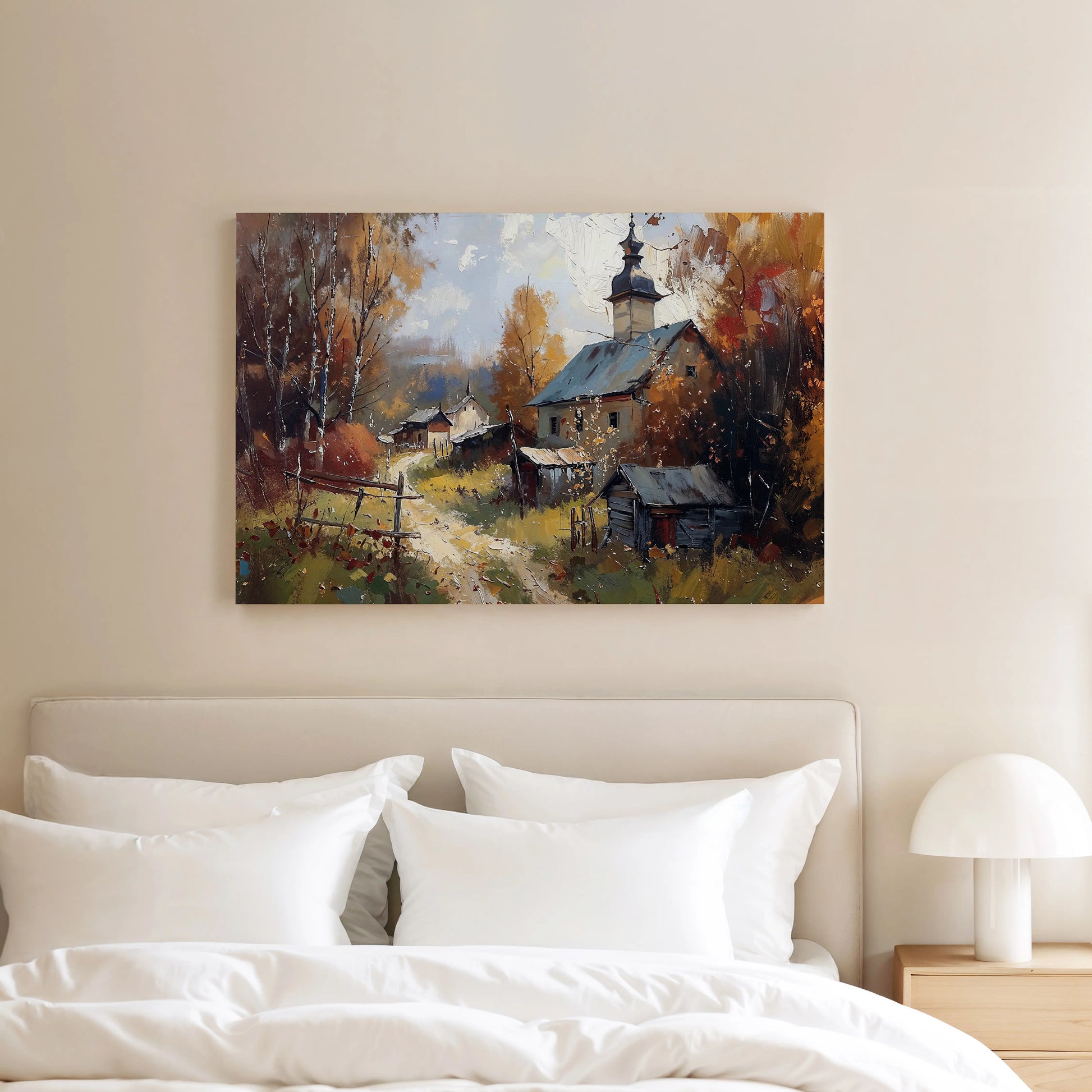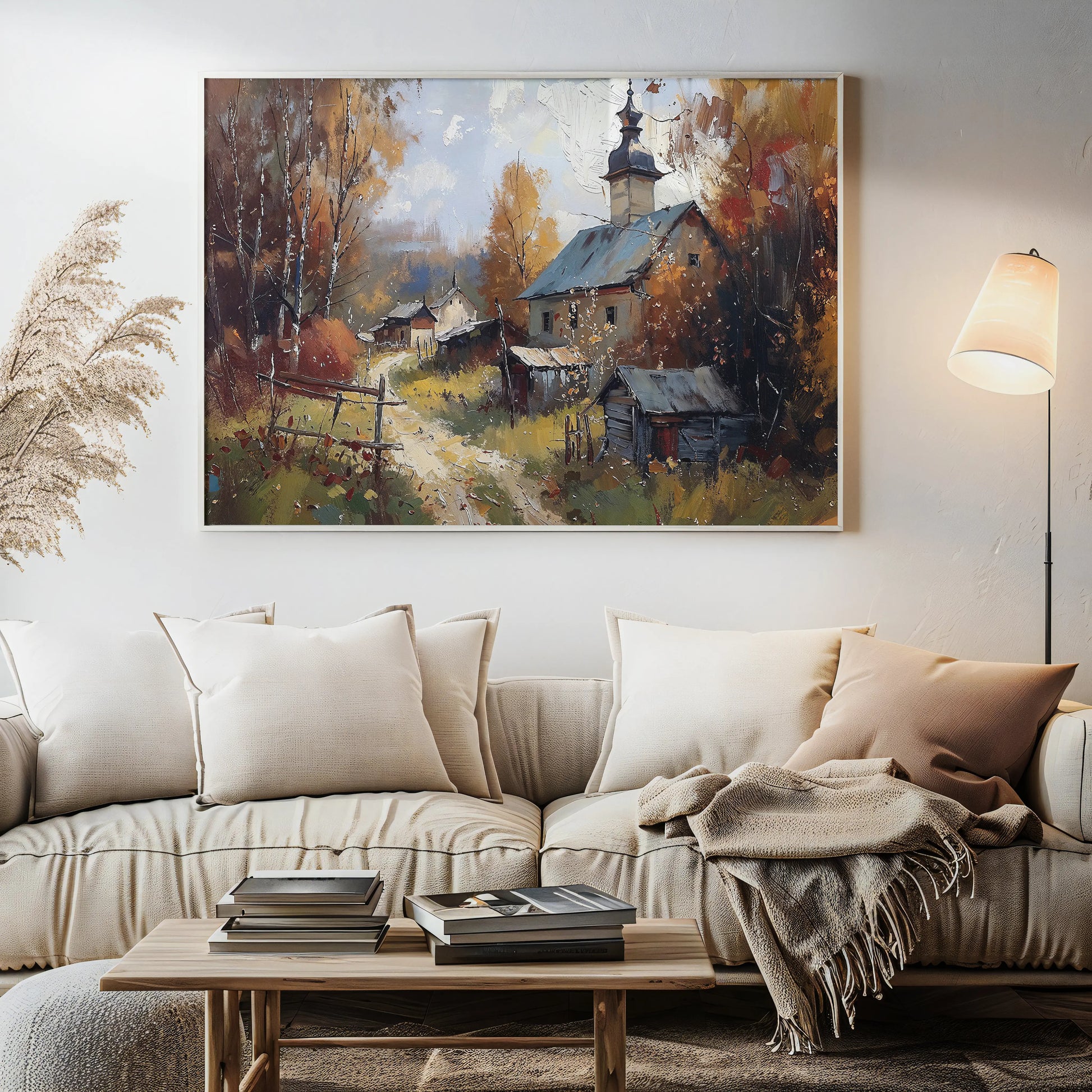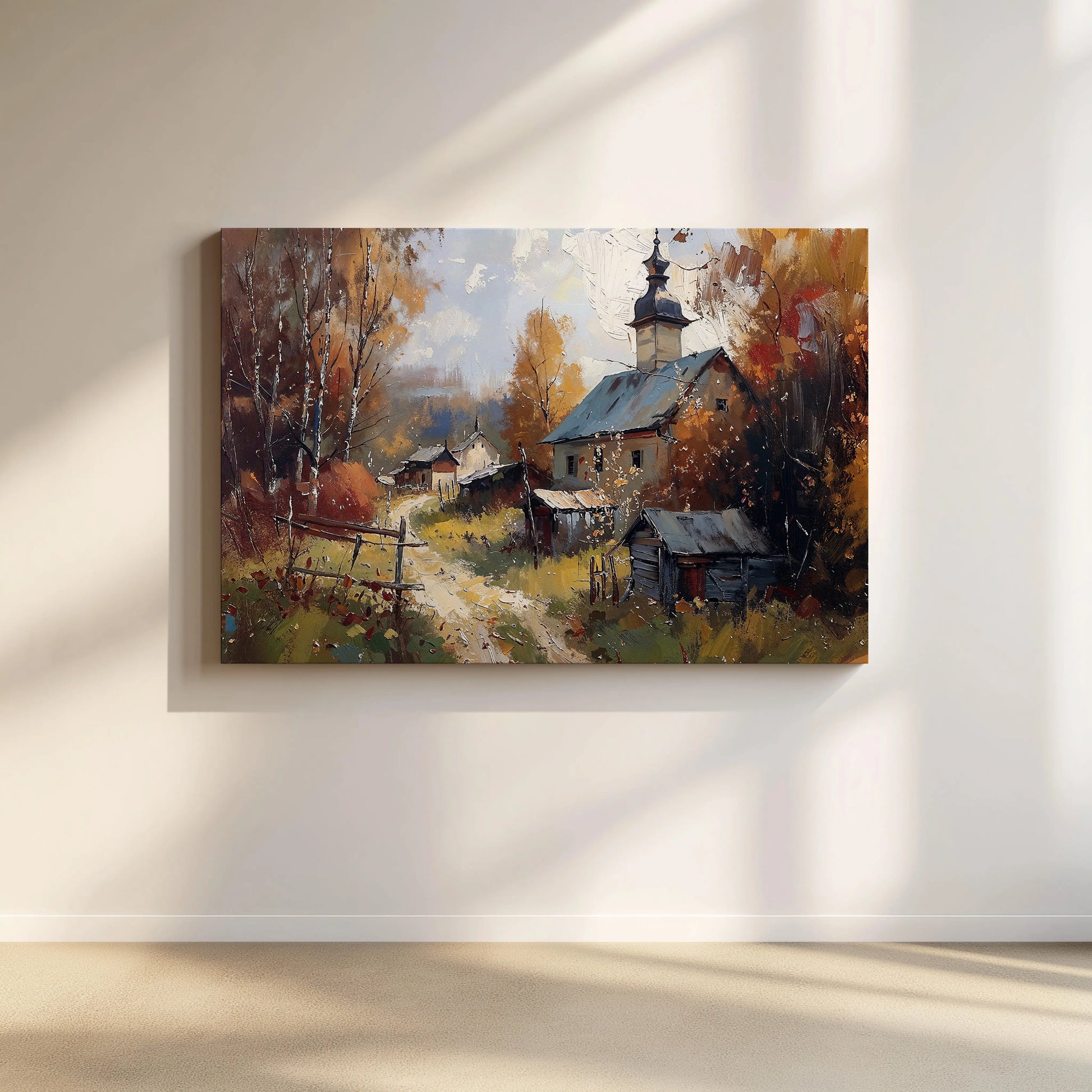 Step into a peaceful autumn retreat with Tower, a stunning stretched canvas artwork showcasing a rustic village scene. A charming church stands at the heart of a winding path, surrounded by cozy homes and vibrant fall foliage.