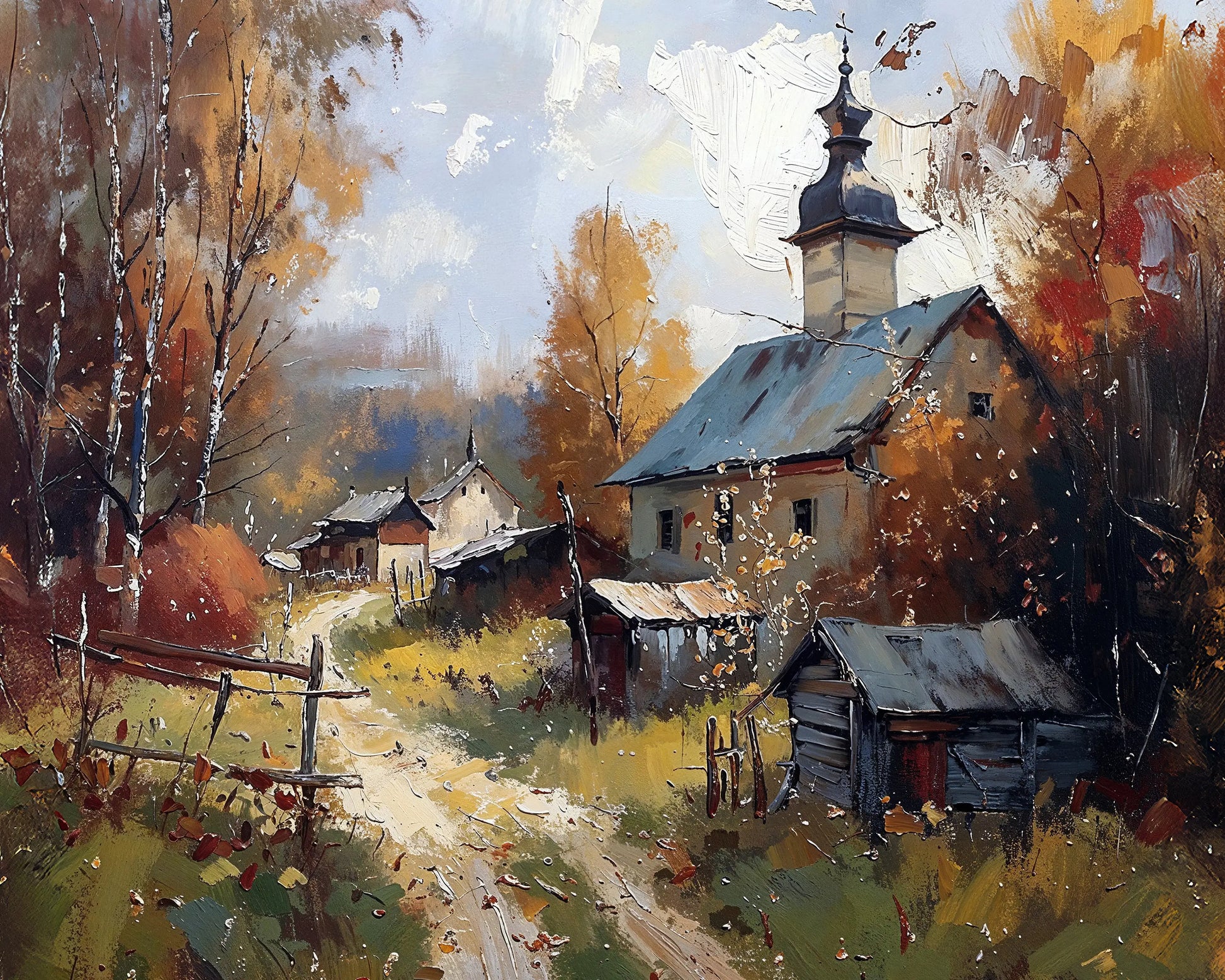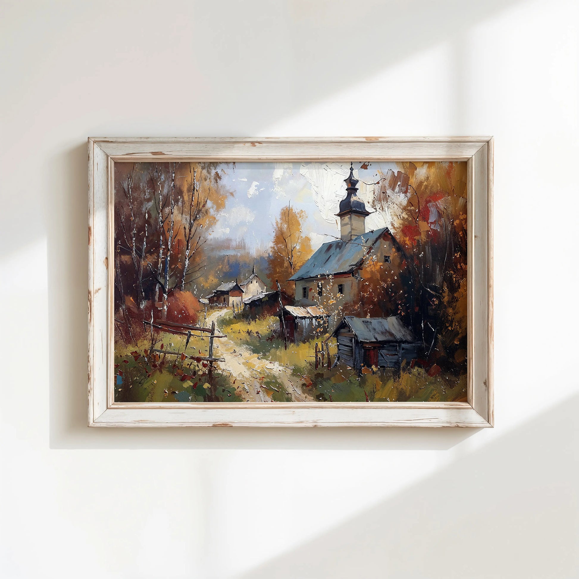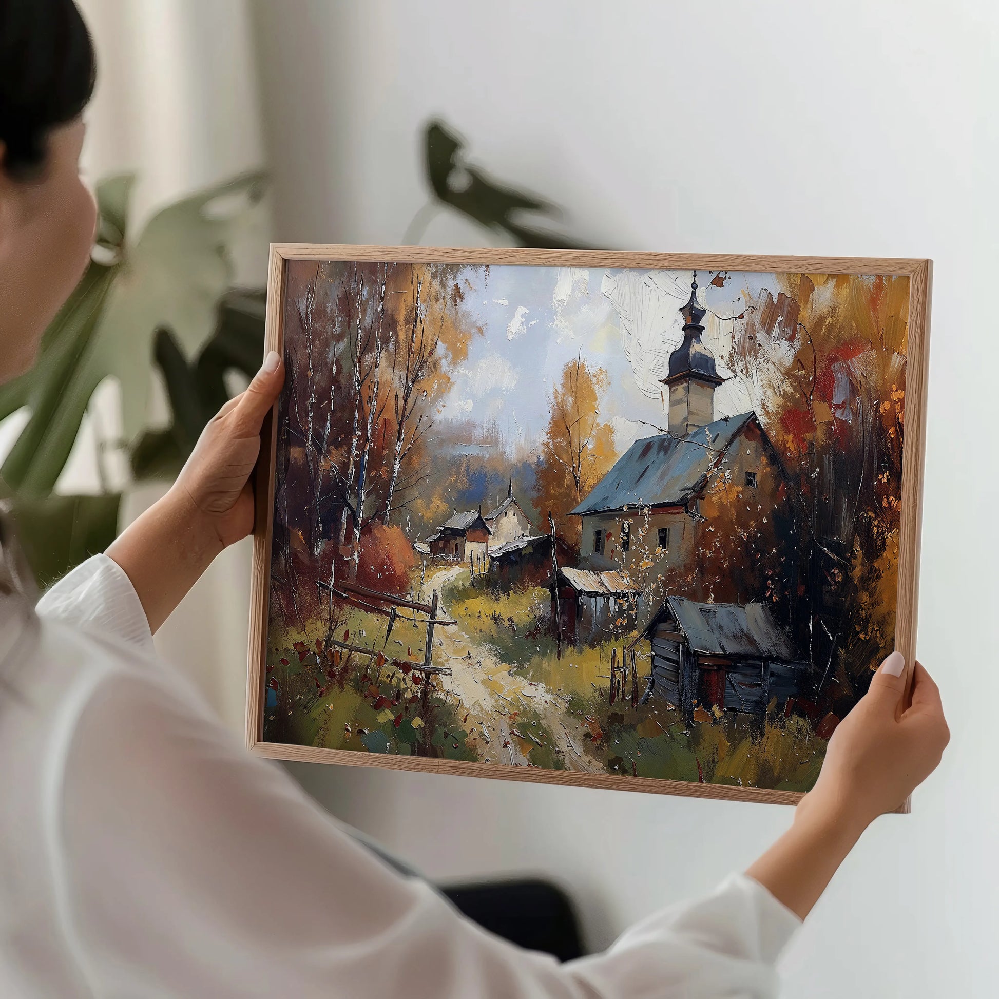 Step into a peaceful autumn retreat with Tower, a stunning stretched canvas artwork showcasing a rustic village scene. A charming church stands at the heart of a winding path, surrounded by cozy homes and vibrant fall foliage.