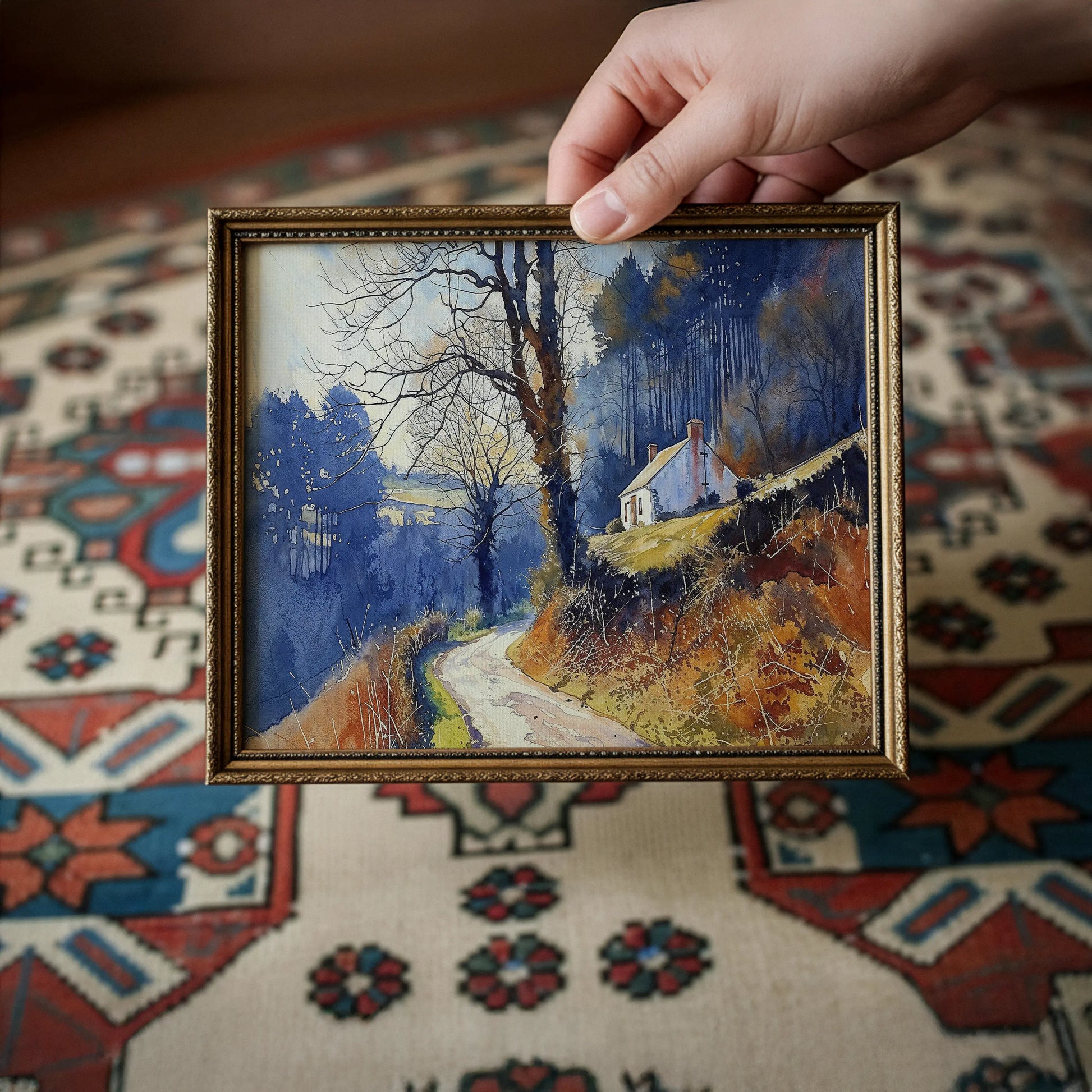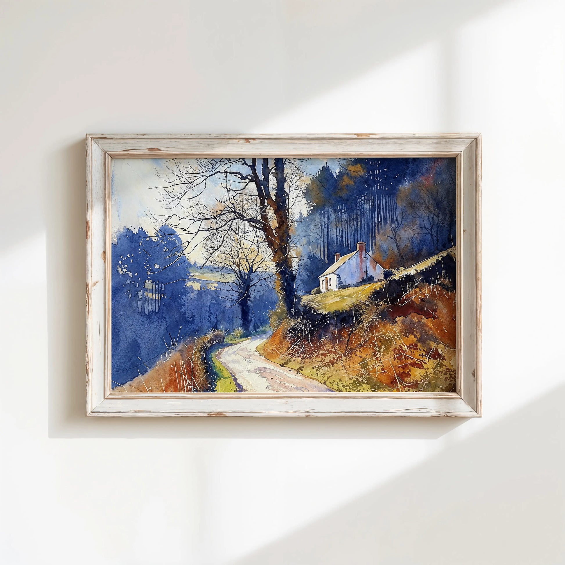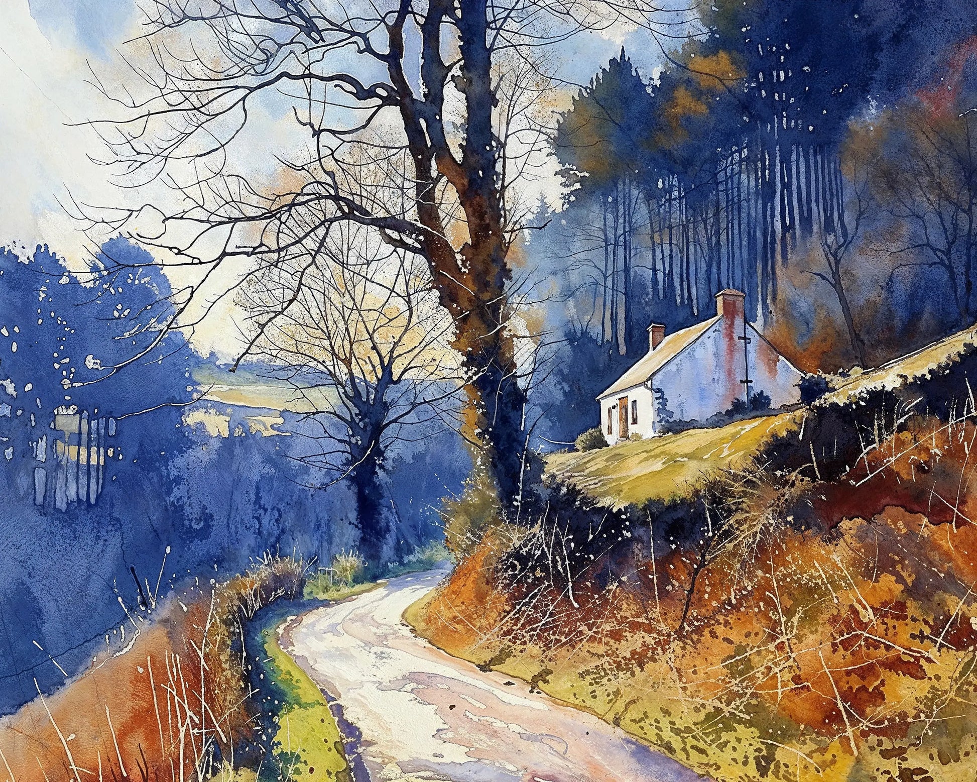 Twilight Bend paints a quiet moment on a winding forest road, where a whitewashed cottage perches on a sunlit slope. Bare trees and golden ground foliage mark the shift into late autumn, while soft watercolor textures enhance the mood of solitude and retreat.